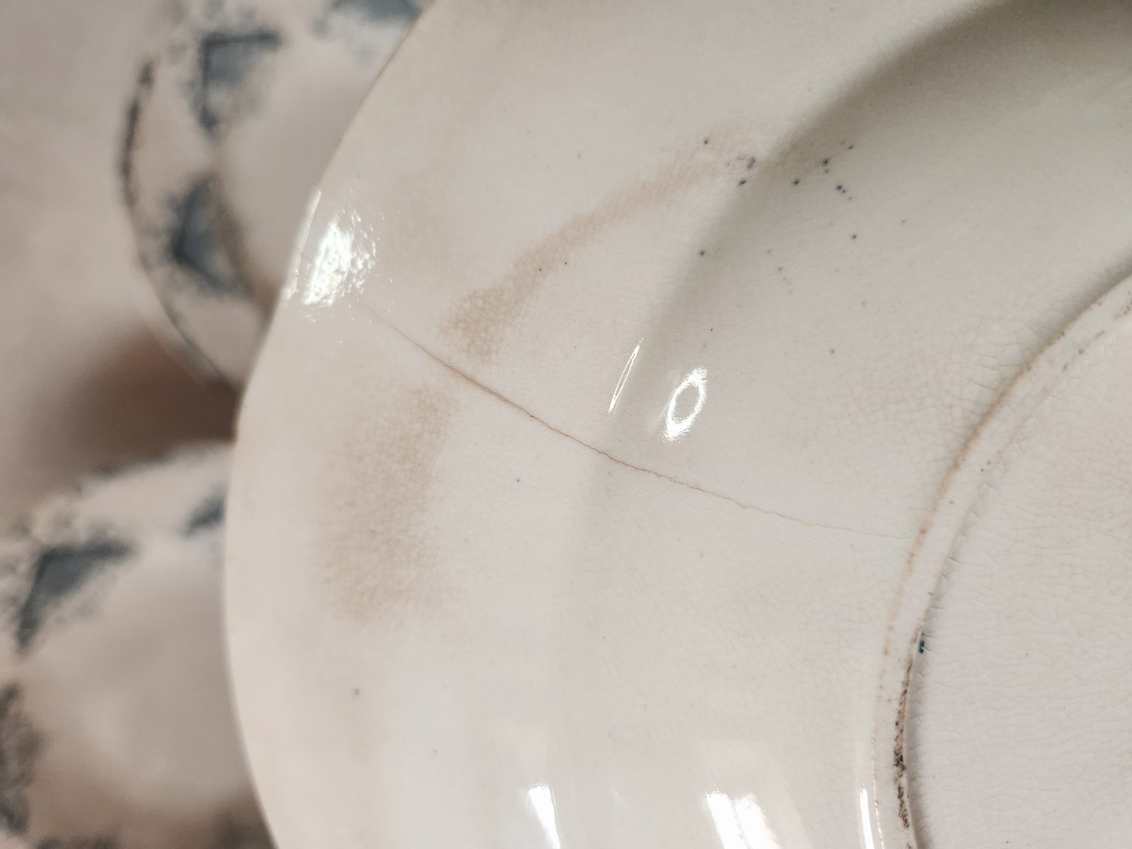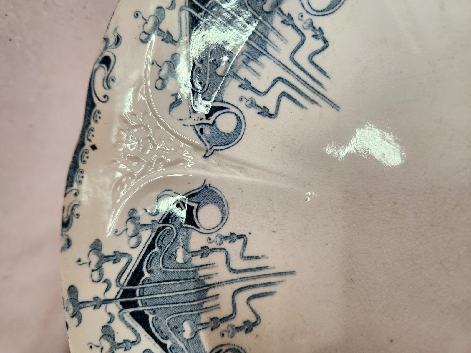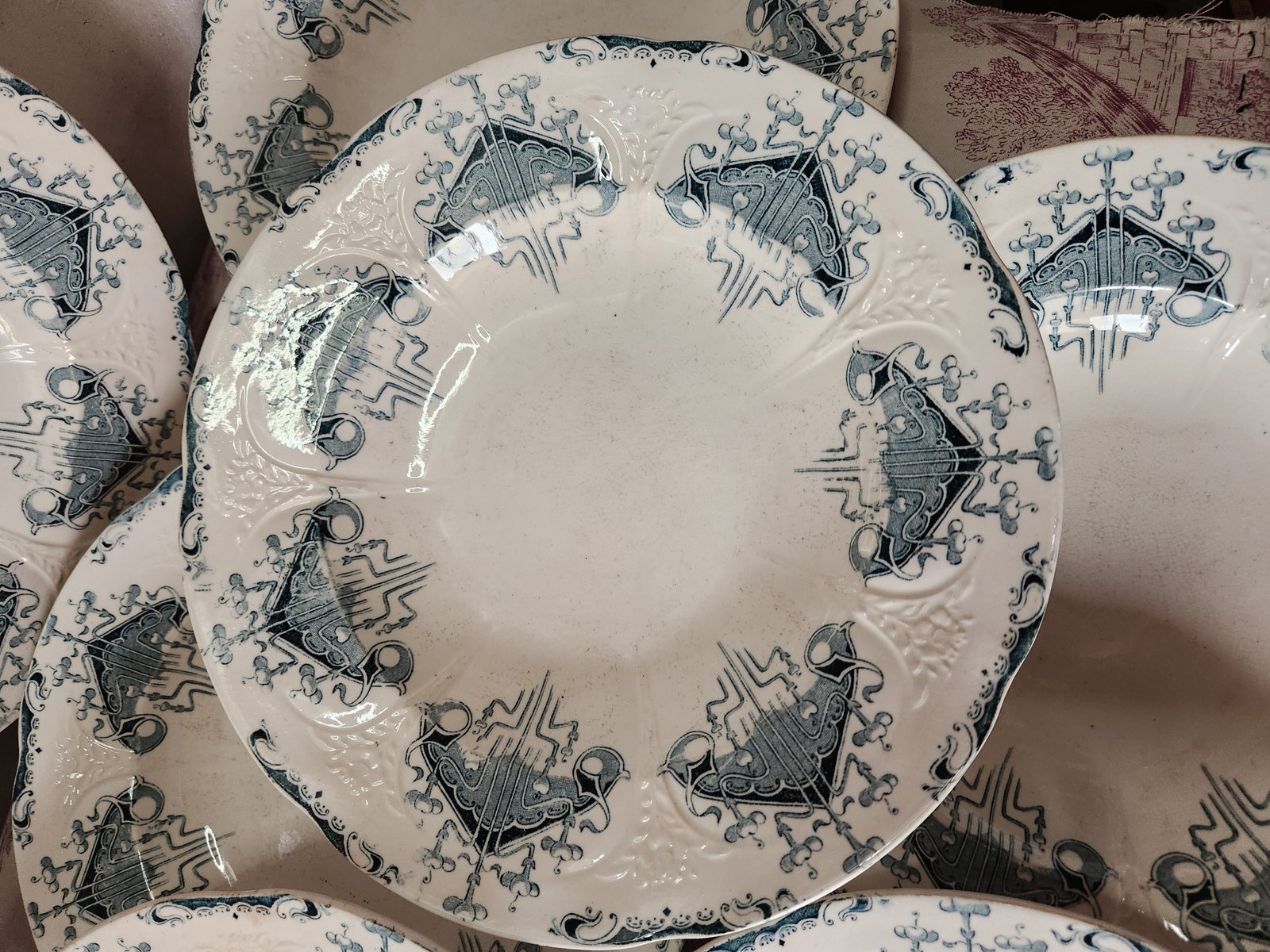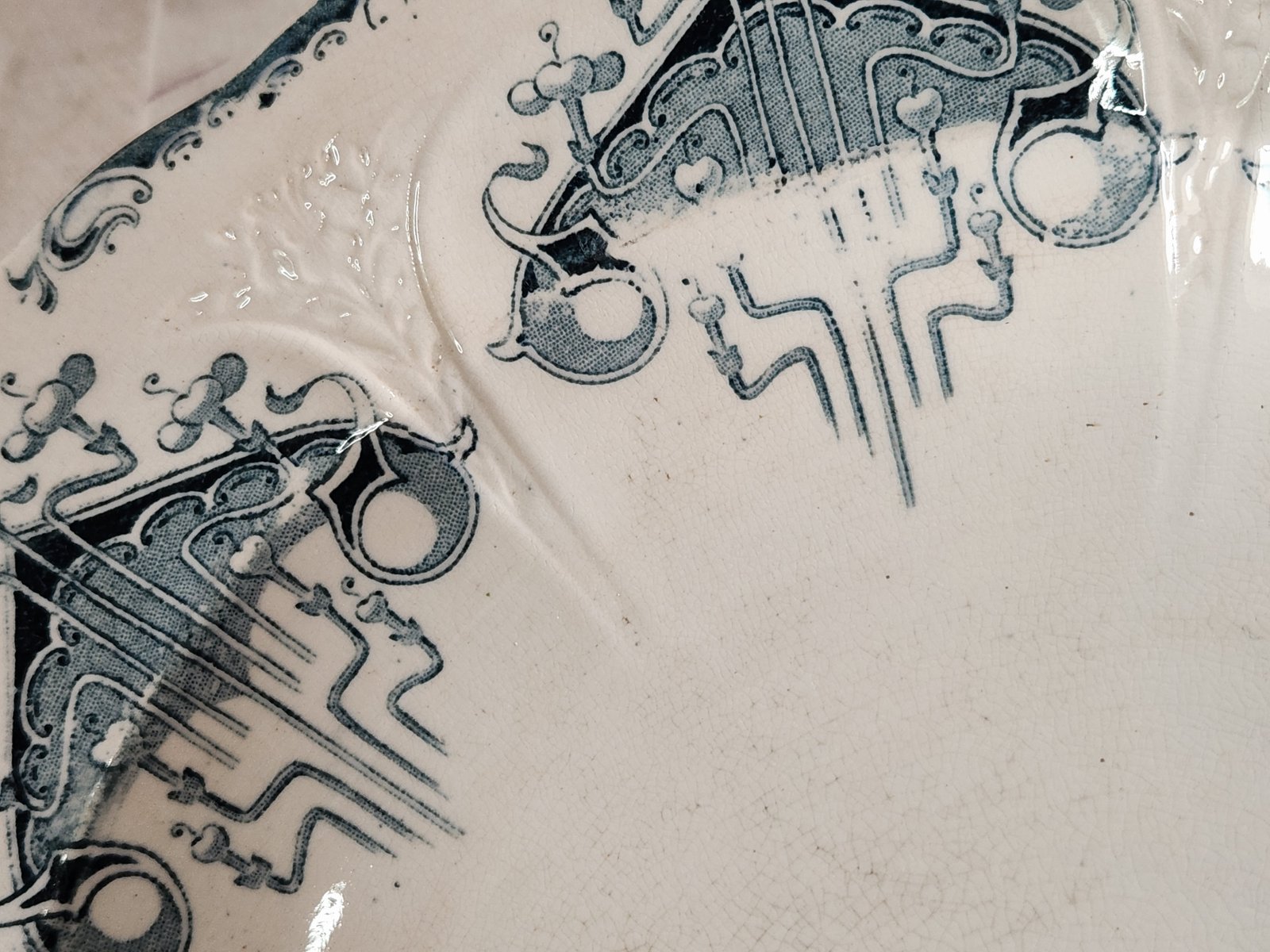 Antiguo juego de nueve platos huecos de piedra ferruginosa de transferencia azul bizantina de Longwy, terre de fer, de finales del siglo XIX. Hermosa decoración en un patrón muy Art Nouveau con una decoración subyacente en relieve.