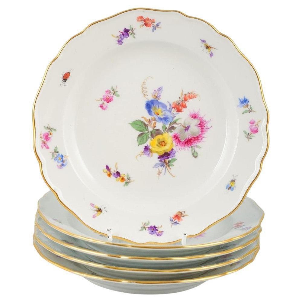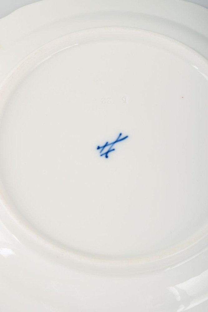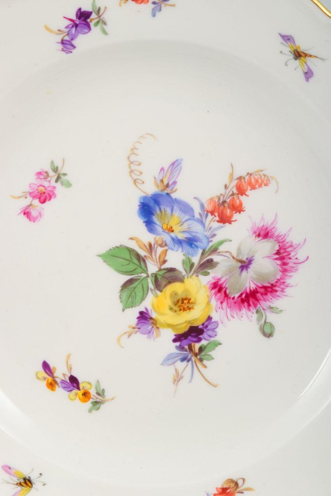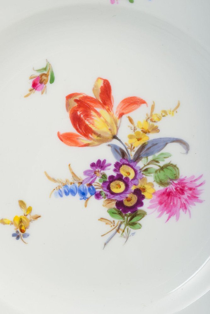 Meissen, juego de cinco platos de porcelana. Pintados a mano con diversos motivos florales. Datación: Mediados del siglo XX. Primera calidad. En perfecto estado. Dimensiones: Diámetro 17,5 cm. La Fábrica de Porcelana de Meissen, fundada en 1710 en la ciudad de Meissen, cerca de Dresde (Alemania), es la fábrica de porcelana más antigua de Europa. Se estableció bajo el patrocinio de Augusto el Fuerte, Elector de Sajonia, después de que se descubriera el secreto de la producción de porcelana de pasta dura en Europa, una técnica que hasta entonces sólo se conocía en China. Meissen es famosa por su alta calidad, su artesanía artística y sus decoraciones emblemáticas, como el motivo de la "Cebolla Azul". La fábrica sigue utilizando su marca distintiva de dos espadas cruzadas, una de las marcas registradas más antiguas del mundo.