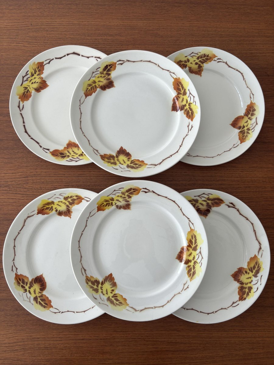 Platos franceses de loza con estampado de hojas otoñales de Moulin Des Loups, años 50. Juego de 6