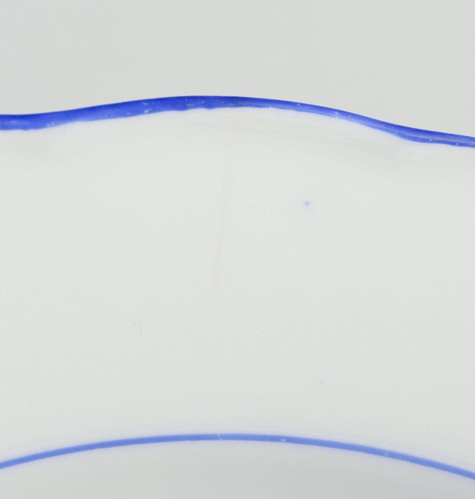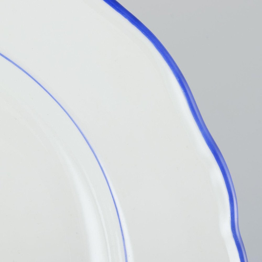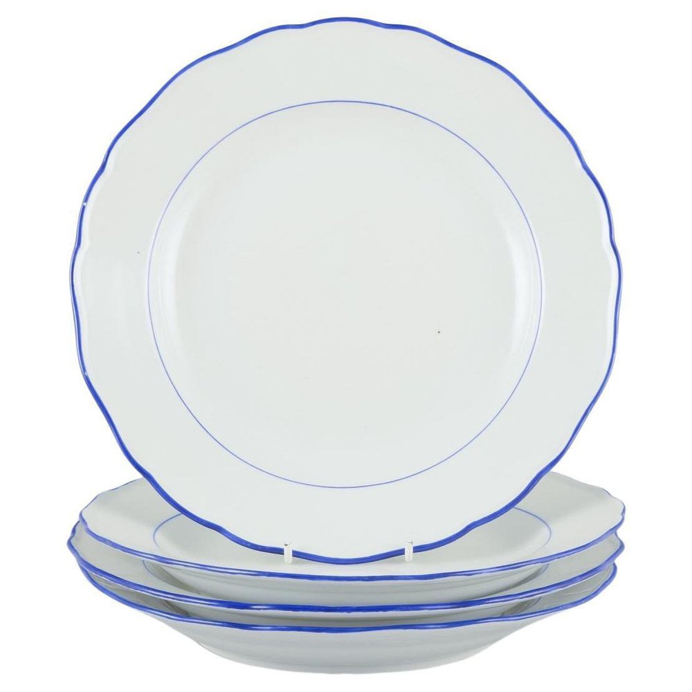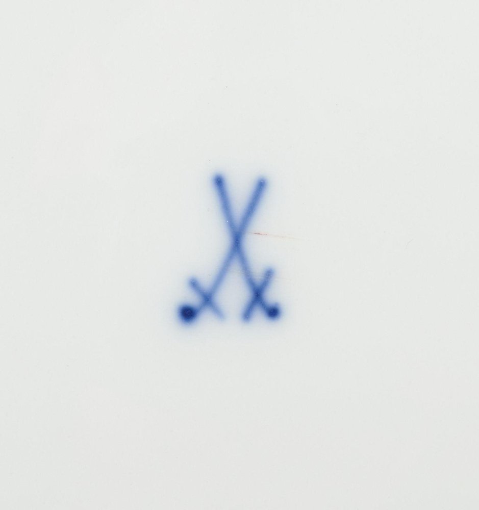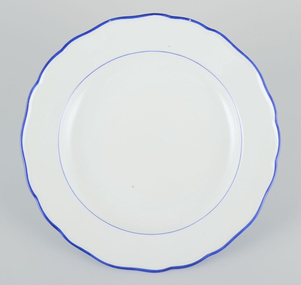Meissen, Germany. A set of four dinner plates. White porcelain with blue rim. Early 20th century. Marked. Third factory quality. In excellent condition, two with hairline cracks and one with a small insignificant chip on the rim. See photos. Dimensions: D 24.0 cm x 3.5 cm. The Meissen porcelain manufactory was founded in 1710 in the town of Meissen near Dresden, Germany, and is the oldest porcelain factory in Europe. It was established under the patronage of Augustus the Strong, Elector of Saxony, following the discovery of the secret to producing hard-paste porcelain – previously known only in China. Meissen quickly gained fame for its exceptional quality and artistic decoration, particularly its iconic "onion pattern" and elaborate figurines. The factory is still operating today and remains a symbol of European porcelain history and craftsmanship.