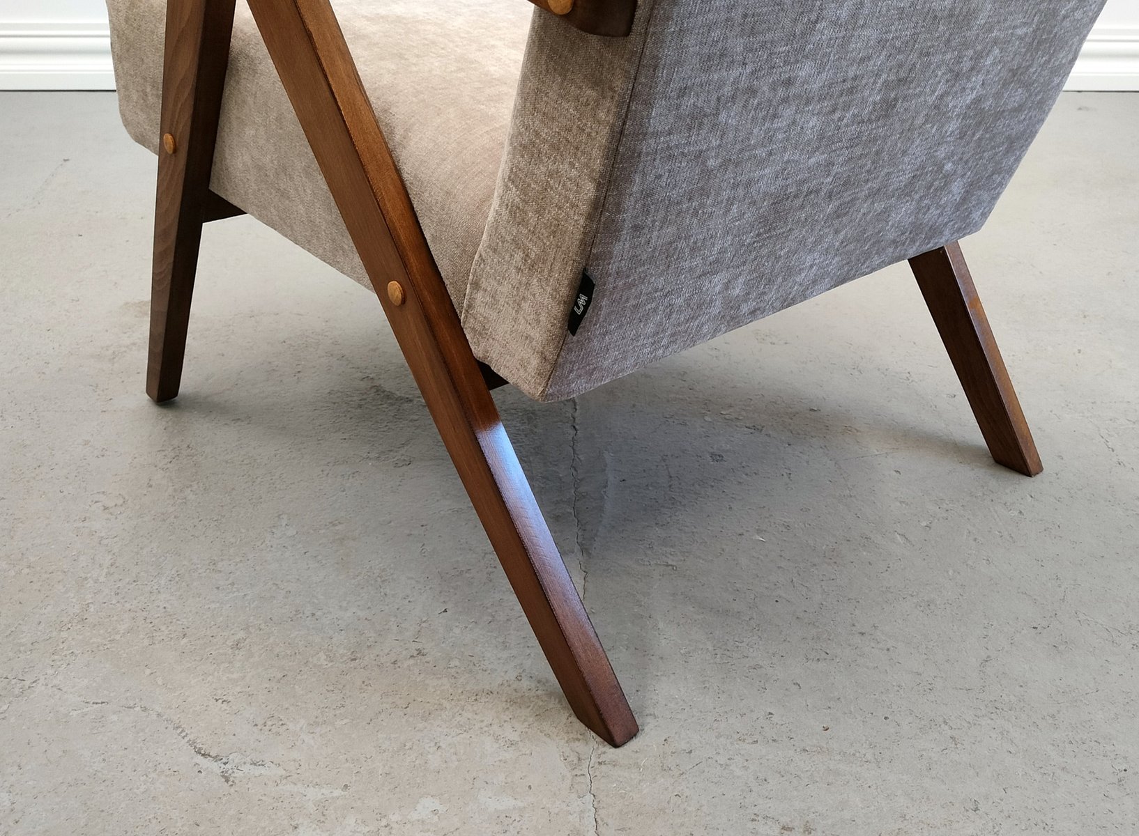 The chair has been meticulously restored, stripped down to its frame, and rebuilt with new foam, inner linen, and support belts. It has been reupholstered in gray, a high-quality fabric that complements its vintage charm. The wooden frame has been sanded, stained, and finished with matte varnish, beautifully highlighting its natural patina. Every aspect of the original design has been preserved in detail, ensuring this chair remains a true classic while being ready to grace modern interiors.