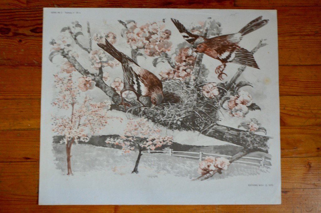 These old educational posters served as lesson support for many years. In schools, they illustrated the teachers' remarks and encouraged children to speak out. This series, published by MDI in 1970, is distinguished by its soft graphics, its touches of color and its astonishing framing. This poster illustrates a children's visit to the Zoo on the front and a couple of birds in their nest on the back.