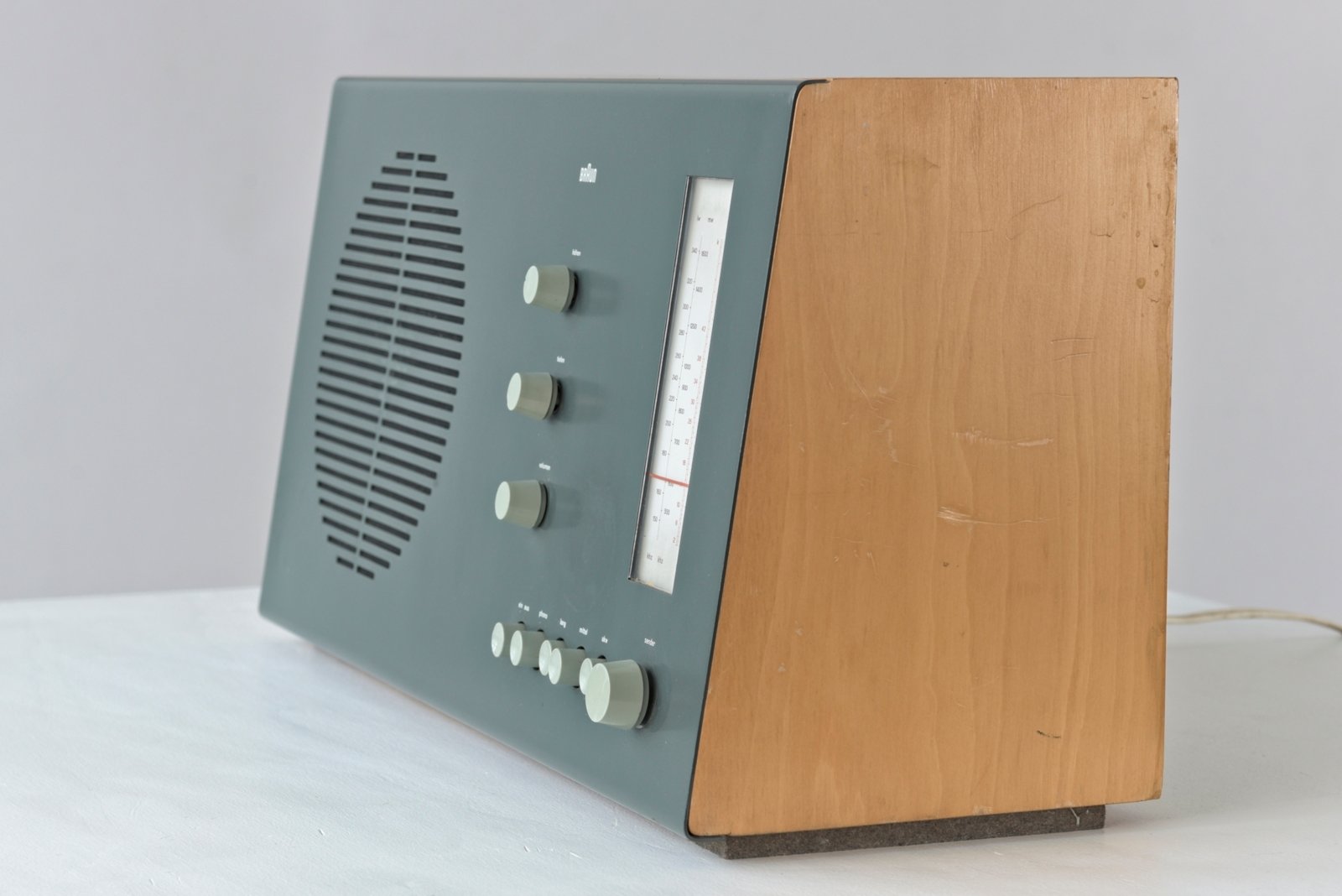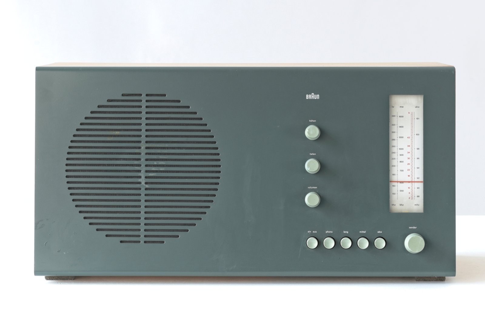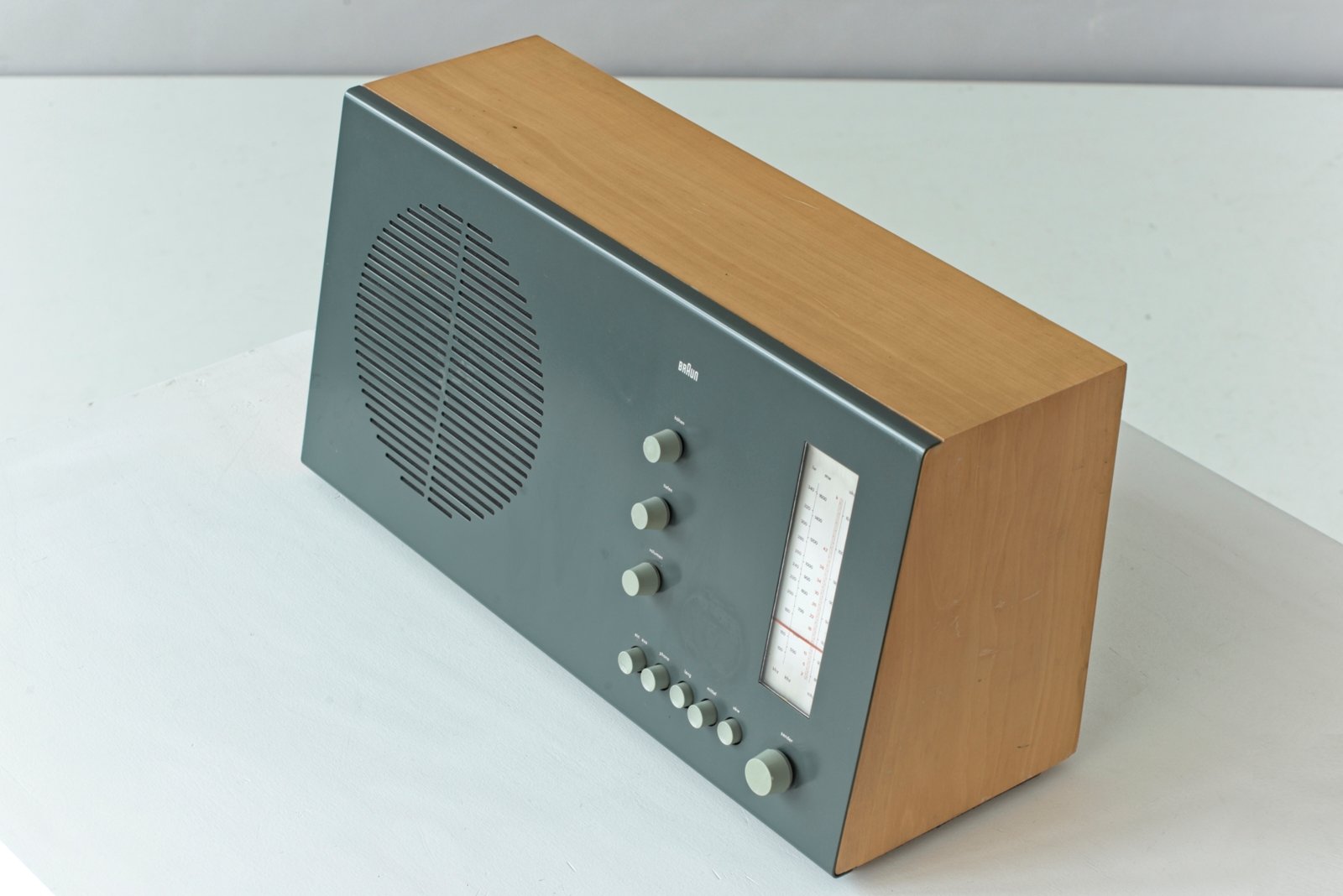 A la edad de 29 años, Dieter Rams diseñó esta radio de mesa para BRAUN en Kronberg. Completamente alejado de los modelos del predecesor, el receptor muestra un nuevo lenguaje de diseño y concepto de manejo. Los botones están dispuestos horizontal o verticalmente según su función y tienen diferentes diseños de superficie. Diseñado originalmente para la recepción de larga, media y VHF, también puede conectarse un fono (tocadiscos). El frontal biselado confiere al aparato un dinamismo adicional, las etiquetas están serigrafiadas y son en su mayoría defectuosas, pero aquí siguen siendo buenas.