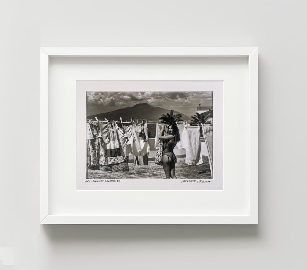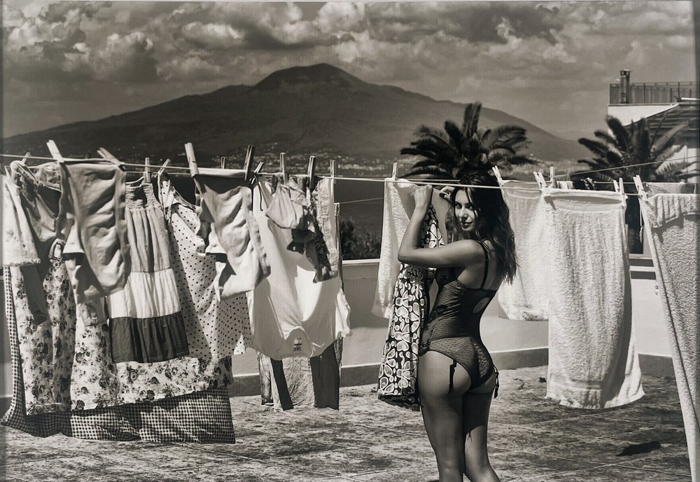 This striking black and white image belongs to Celentano’s Italian Lifestyle works, blending sensuality and everyday life. The scene portrays a young woman hanging laundry under the Mediterranean sun, with Mount Vesuvius in the background. The composition highlights both the intimacy of daily rituals and the timeless allure of Italian femininity.