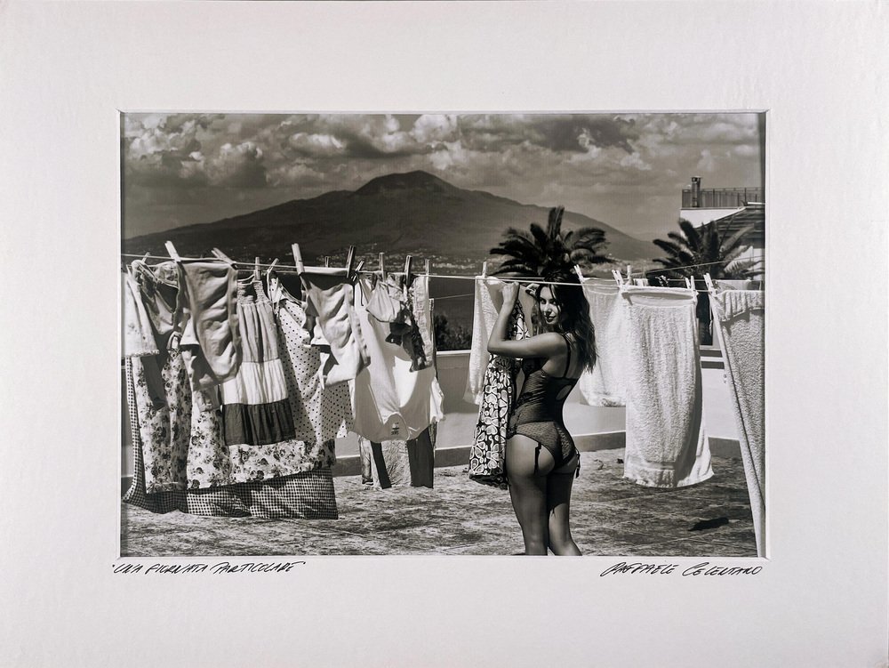 Esta impactante imagen en blanco y negro pertenece a las obras de estilo de vida italiano de Celentano, que mezclan sensualidad y vida cotidiana. La escena retrata a una joven tendiendo la ropa bajo el sol mediterráneo, con el Monte Vesubio al fondo. La composición destaca tanto la intimidad de los rituales cotidianos como el encanto intemporal de la feminidad italiana.
