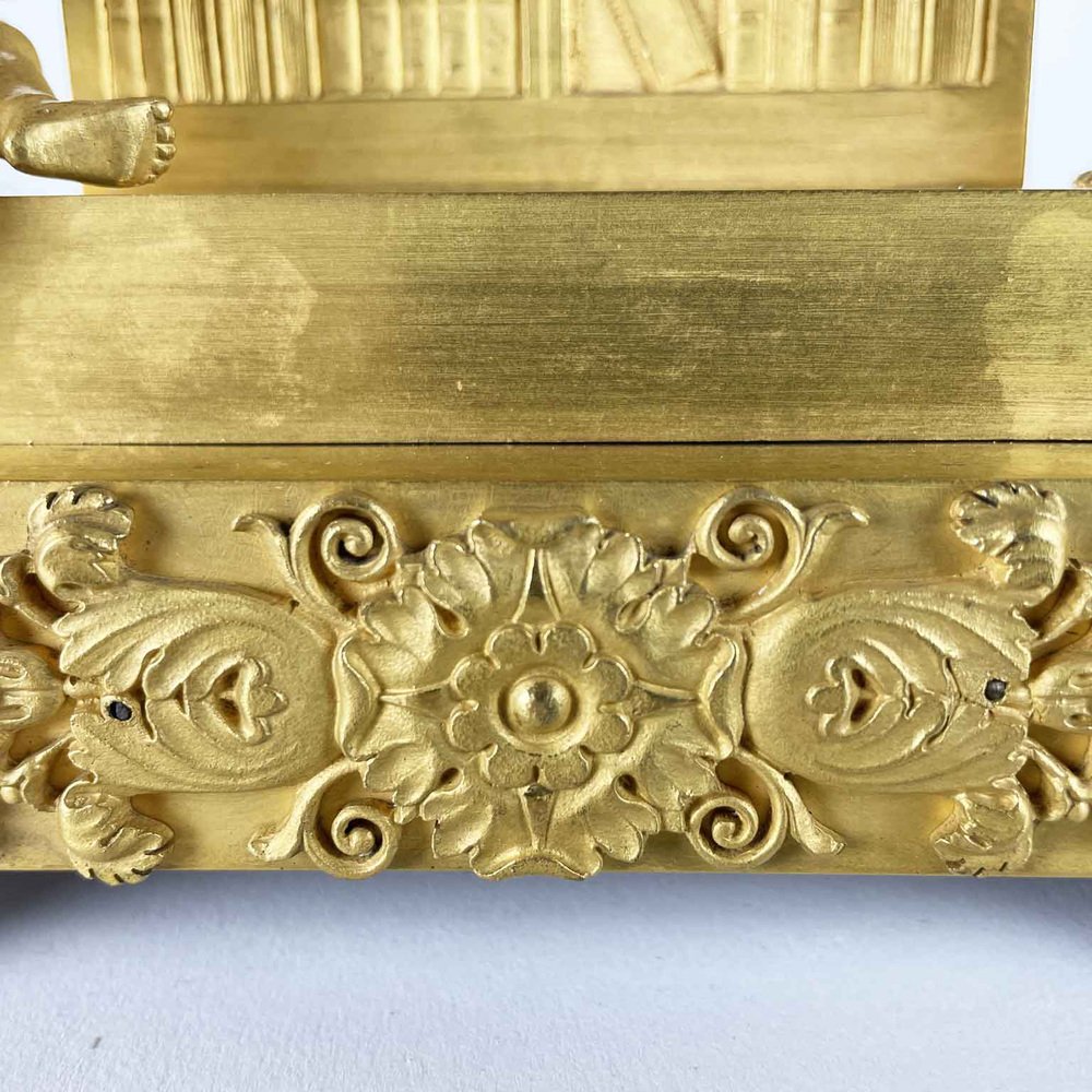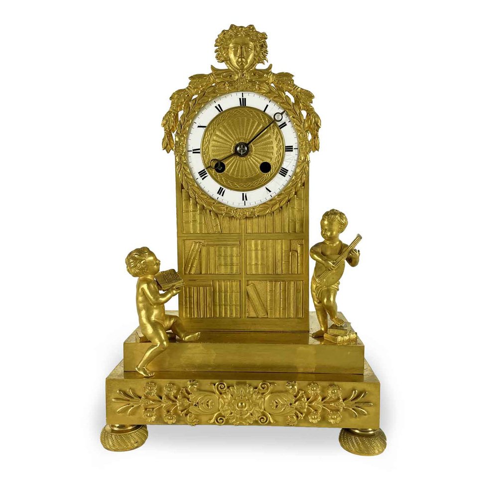 This gilt-bronze table clock dating to the early 19th century is a charming French Empire pendulum clock. Its arched case is flanked by two cherubs, one seated with a book and the other standing, one foot resting on books, intent on playing a musical instrument. The clock's base, with two rectangular steps and a decorative floral frieze in the Empire style, adds a further touch of elegance, while the beaded hemispherical feet provide stability.