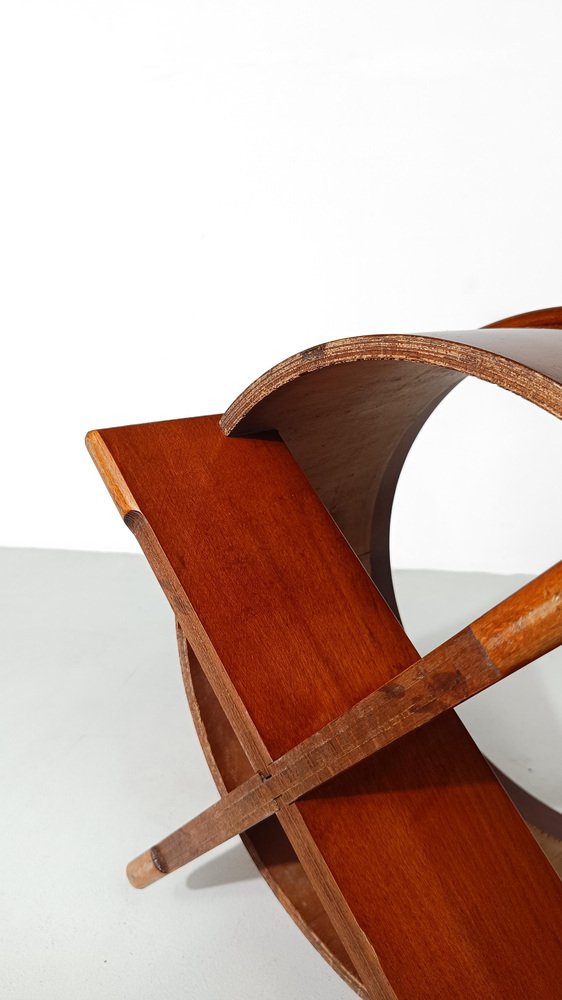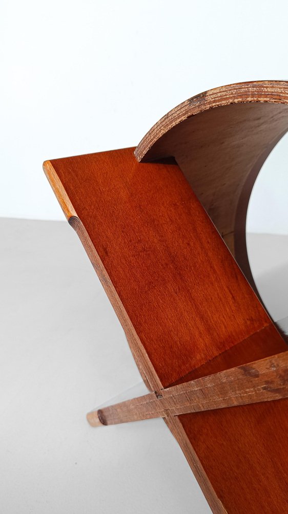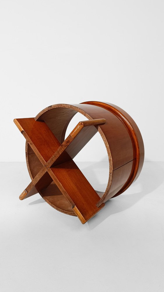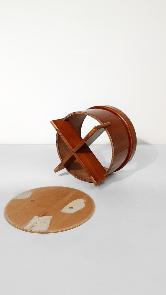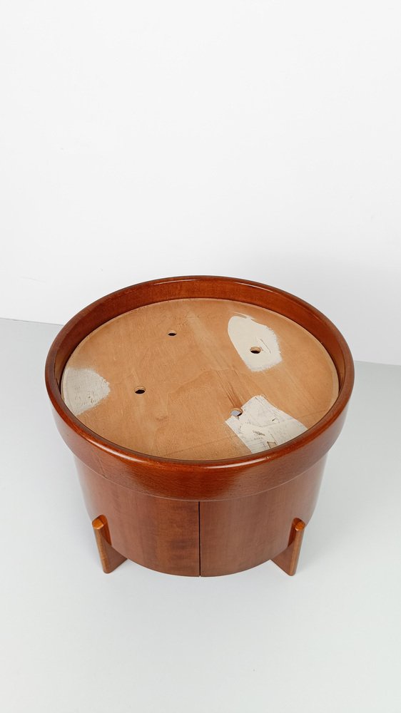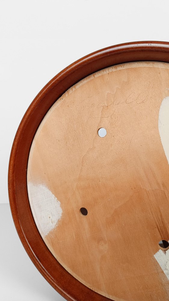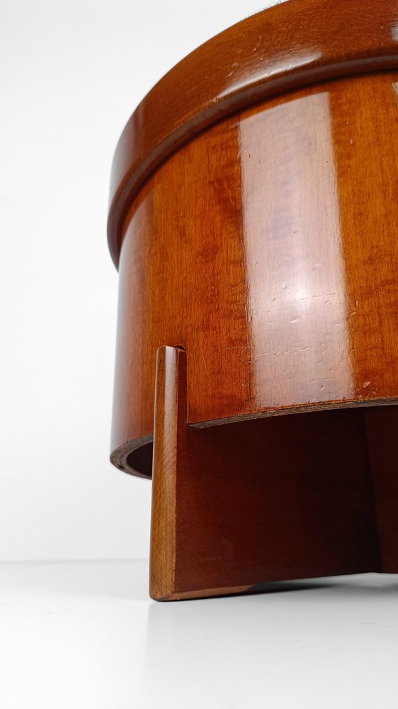 Reposapiés vintage fabricado en Italia a mediados del siglo XX y recientemente restaurado tanto en la parte de madera como en la tapicería por nosotros. La estructura es estable y sólida, consta de un cilindro de 46 cm de diámetro fabricado en contrachapado curvado y chapa de teca, está sostenido por dos paneles de madera del mismo material fijados en cruz. Un marco circular de un grosor mayor que el cilindro contiene un panel de madera que soporta el cojín desenfundable y recientemente tapizado con un bouclé de color crudo, un tono que está entre el gris claro y el beige frío. Utilizable como taburete o como reposapiés, este artículo se presta a ser insertado con éxito en diversos proyectos de interior; esencial y refinado, su estilo oscila entre los estilos escandinavo e italiano de mediados de siglo. En buen estado vintage, este reposapiés de los años 60 y 70 ha sido sometido recientemente a una restauración conservadora por parte de nuestro restaurador de confianza, que realizó una limpieza profunda y un pulido a la cera para mantener la espléndida pátina del tiempo.