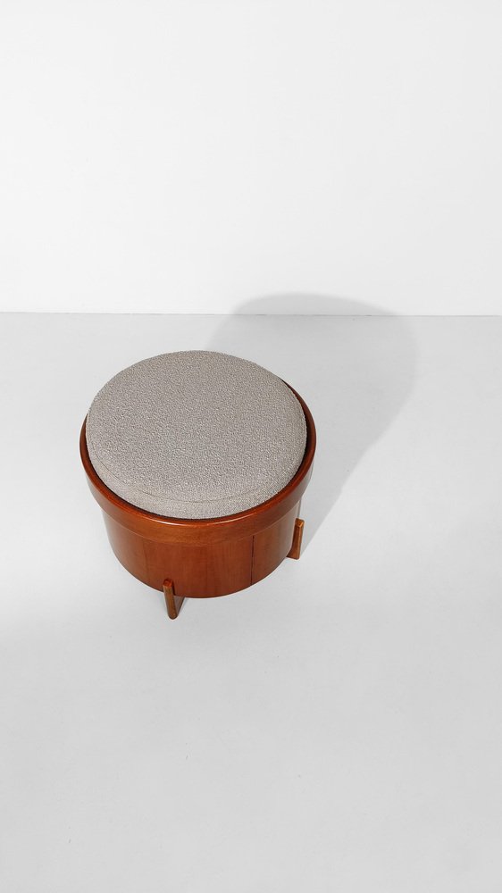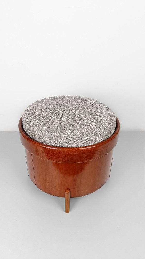 Vintage footstool made in Italy during the mid-20th century and recently restored both in terms of the wooden part and the upholstery by us. The structure is stable and solid, consisting of a 46cm diameter cylinder made of curved plywood and teak veneer, it is supported by two wooden panels of the same material fixed to a cross. A circular frame of a thickness wider than the cylinder contains a wooden panel that supports the removable cushion and recently upholstered with an Ecru colored bouclé, a shade that is between light gray and cold beige. Usable as a stool or as a footstool, this item lends itself to being successfully inserted in various interior projects; essential and refined, its style oscillates between the Scandinavian and Italian mid-century styles. In good vintage condition, this footstool dating back to the 60s and 70s has recently undergone a conservative restoration by our trusted restorer, who carried out a deep cleaning and a wax polish to maintain the splendid patina of time.
