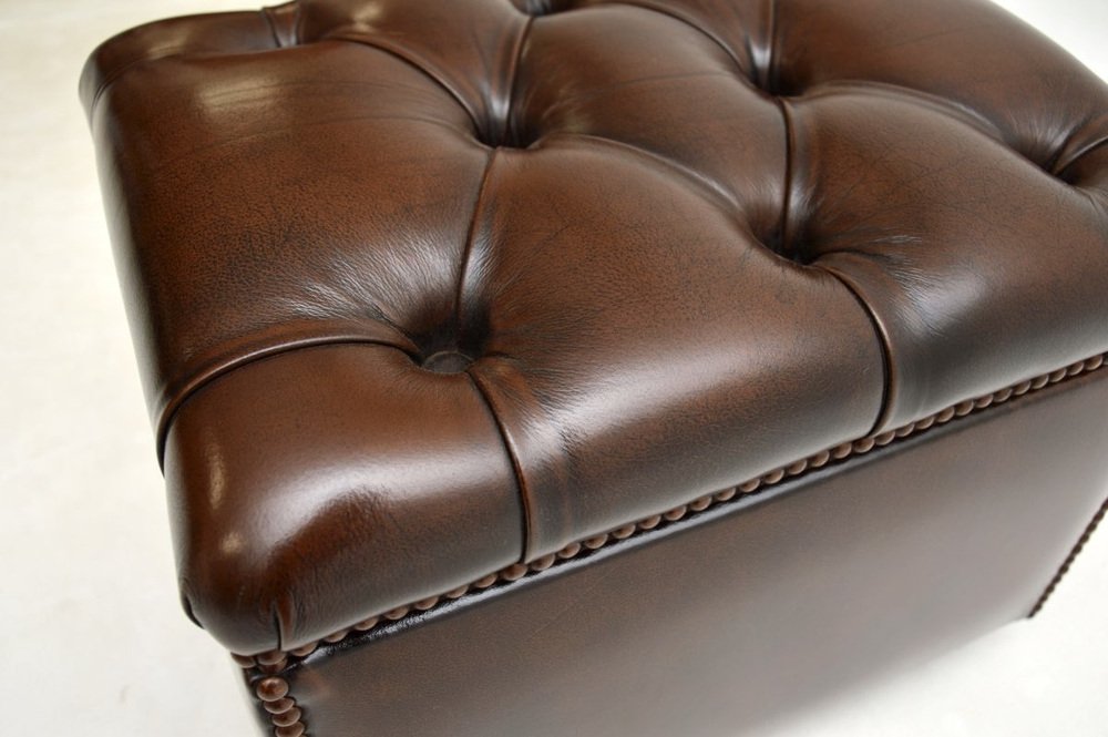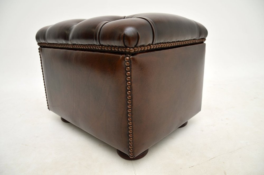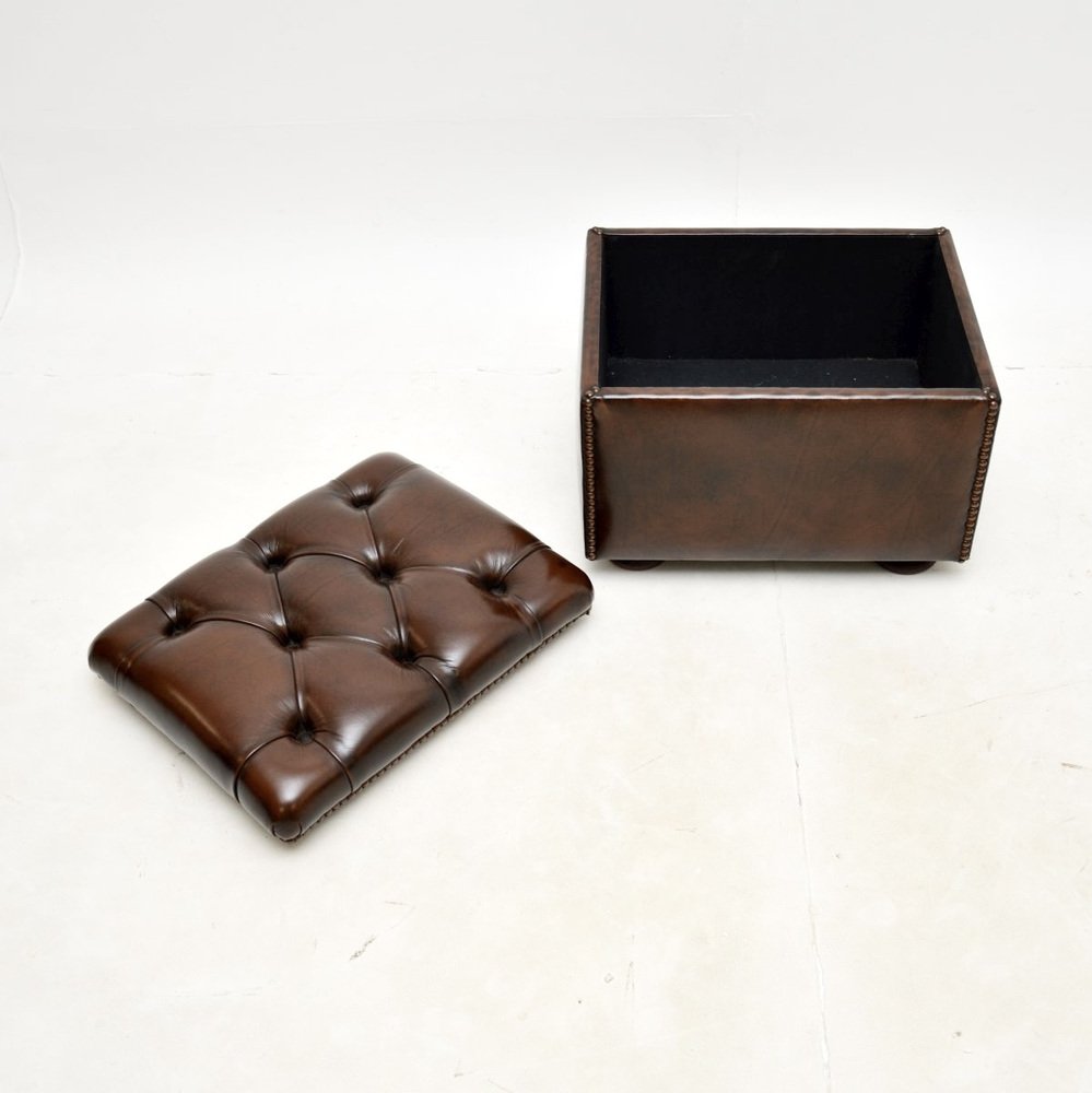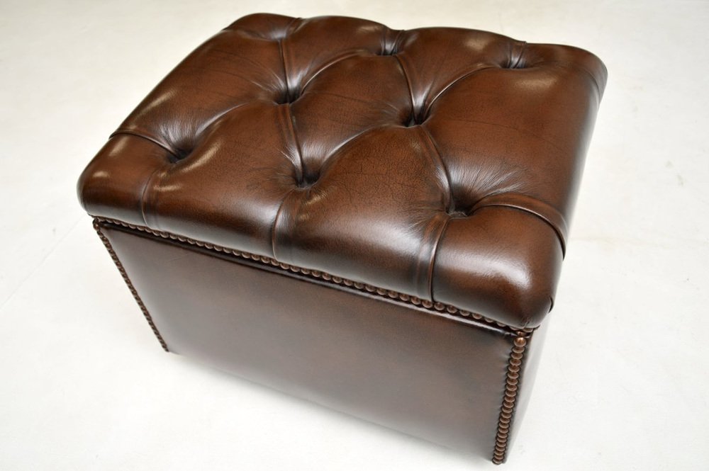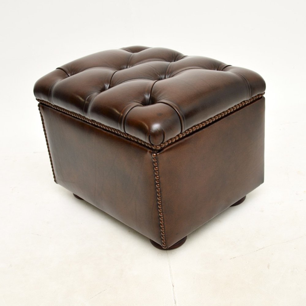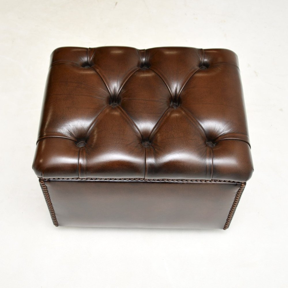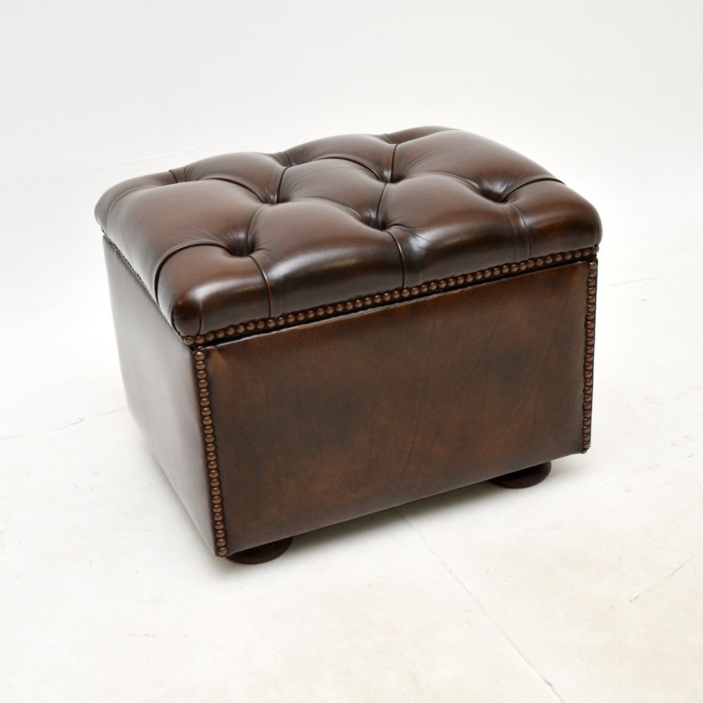 Precioso taburete / otomana antiguo de cuero, fabricado en Inglaterra y que data aproximadamente de los años 50.