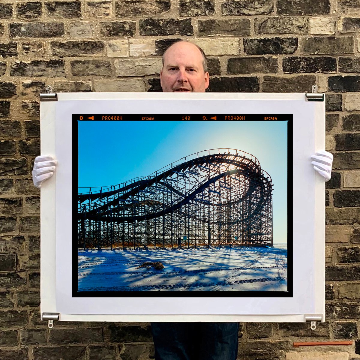Montaña rusa varada, fotografía de la serie de Richard Heeps, Jersey Shore. Hay algo apacible en la estructura dormida en la playa, que contrasta con tu mente mientras te lleva a los ecos de los gritos en temporada alta.