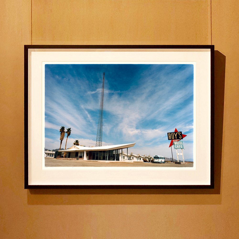 Roy's Motel Route 66, fotografía de arquitectura estadounidense de viaje por carretera de la serie Dream in Colour de Richard Heeps. Esta vista del Roy's Motel destaca el estilo Googie de la era espacial tanto del edificio como del icónico cartel del Motel.