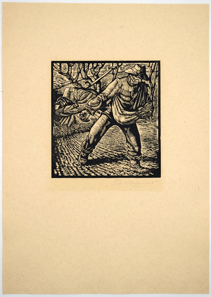 Rudolf Nehmer (1912 Bobersberg - 1983 Dresden), The Fieldman and Death, around 1948. Woodcut on yellowish wove paper, 16.8 cm x 15.8 cm (depiction), 42 cm x 30 cm (sheet size), signed “Rud.[olf] Nehmer” in pencil lower right.