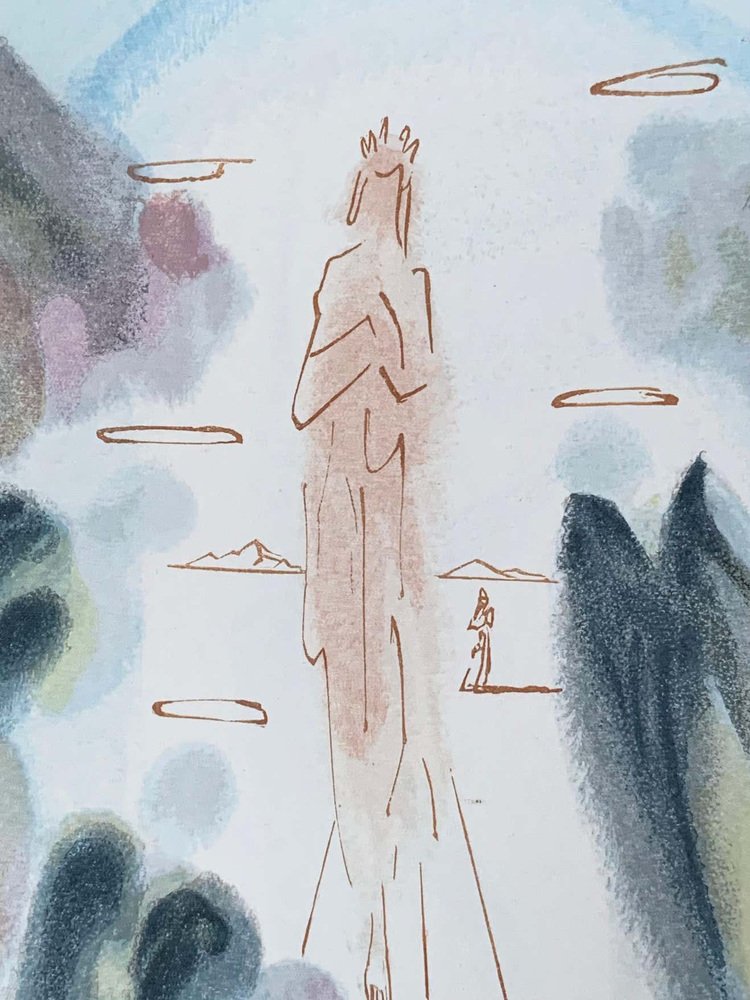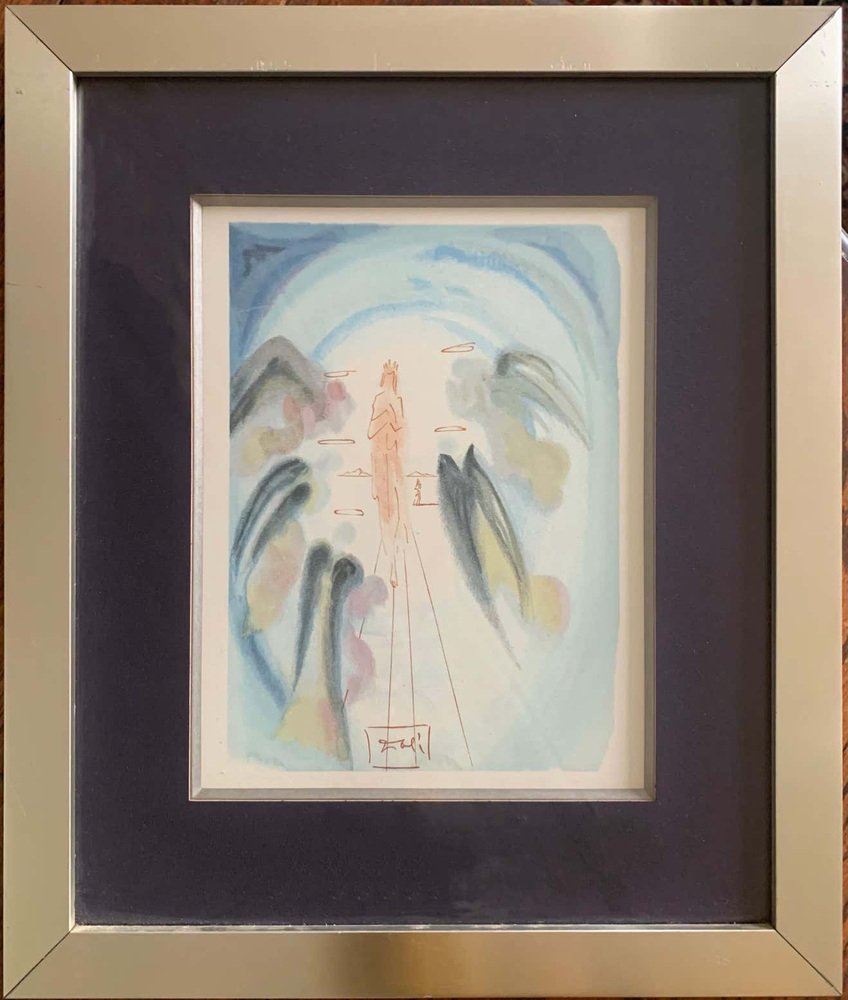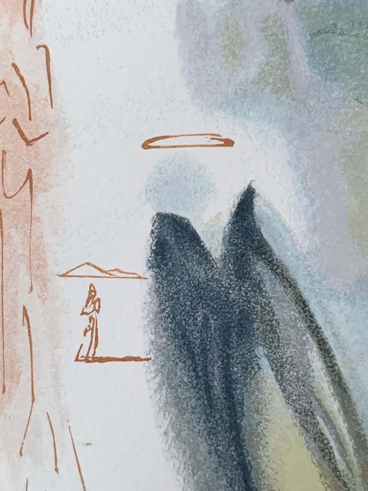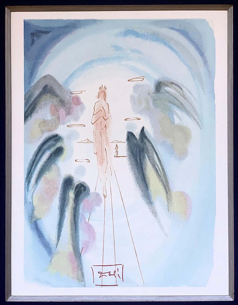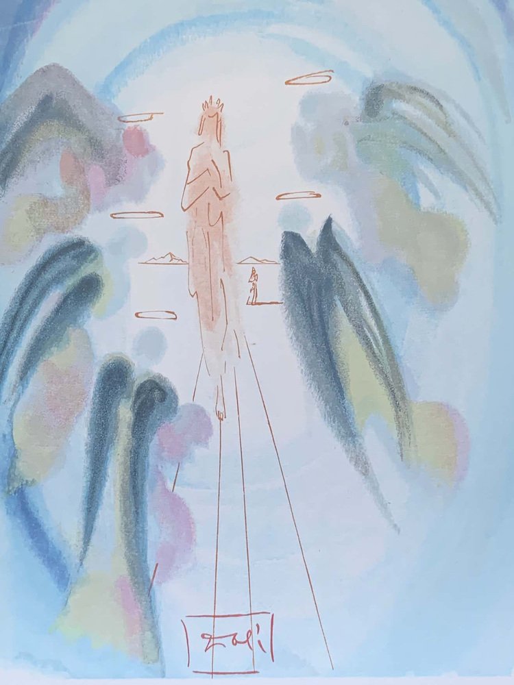 Divine Comedy Heaven Canto 25. This work takes a watercolor of Dali. It represents the entry in the paradise of a chosen one. Angels are placed all around the chosen one we recognize them thanks to their wings and halos.