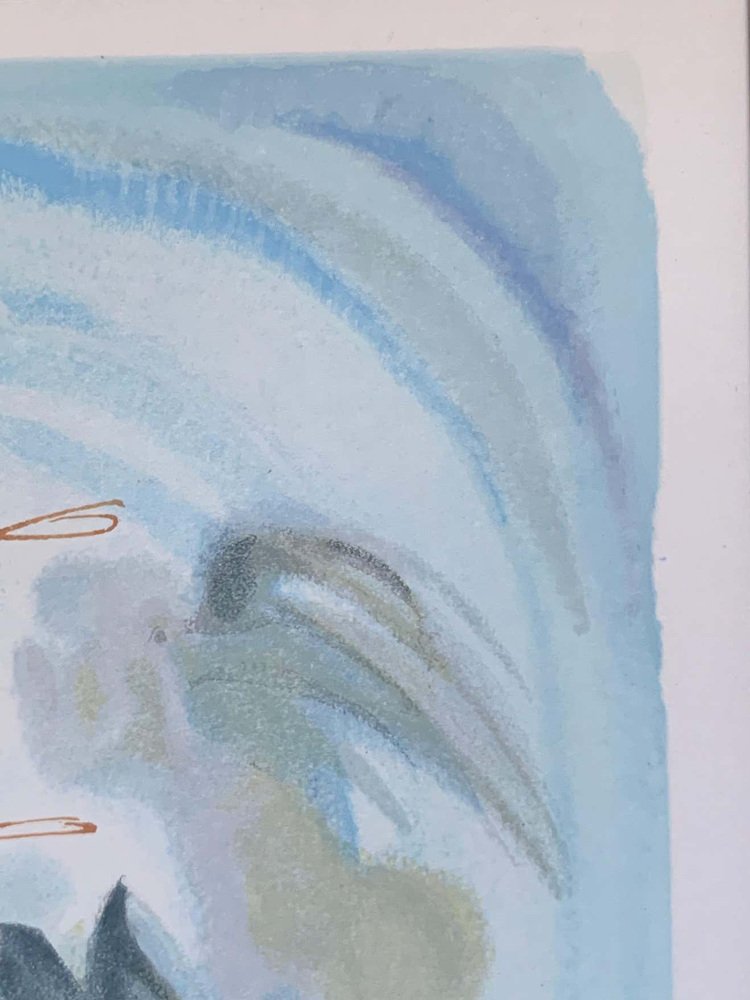 In 1950 the Italian government commissioned Dali to illustrate Dante Alighieri’s (1265-1321) Divina Commedia (1307) for a publication to mark the 700th anniversary of Dante’s birth.Dali made 101 watercolours (1950 - 1959) illustrating each of the 100 cantos of Dante’s masterpiece plus one title page. But the Italian public was indignant that a Spaniard was to illustrate the work by their great national poet, it had to be done by an Italian.Dali then presented his 101 watercolours to the French printer Jean Forêt, who agreed to publish the Divina Commedia text in French with Dali's illustrations. To this end, the watercolours needed be made suitable for printing.It took 50 months (April 1959 - November 1963) to engrave the about 3500 woodblocks: on average 35 blocks were needed to render the rich colour palette of each of the 101 watercolours.