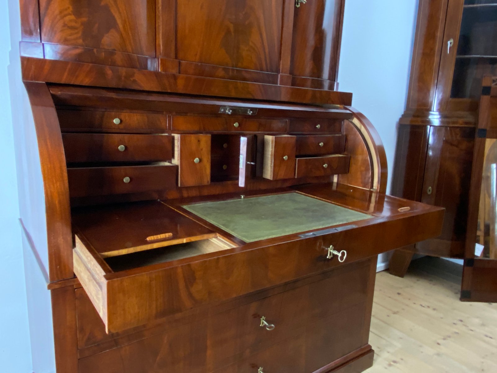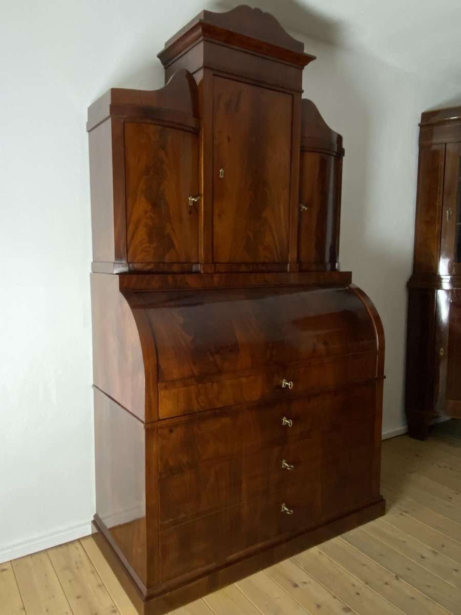 Impressive Tabernacle secretary, pyramid mahogany veneered on oak, three-piece, lower section 3 drawers with small brass key plates, central part designed consisting of a cylinder Bureau, several small drawers, writing surface extendable with leather trim, writing surface partly desk-like folded, upper part consists of three parts of the cabinet with doors.