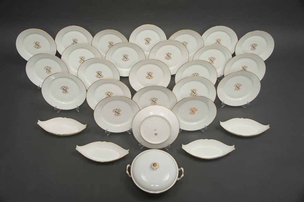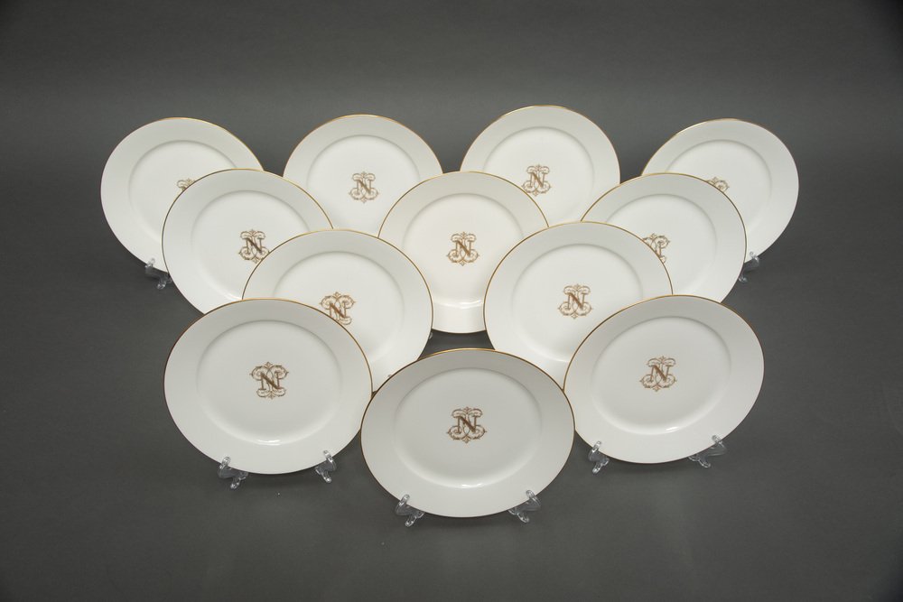 24 plates: Decorated with a central “N” monogram and a delicate gold border.
