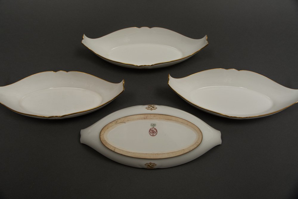 4 serving dishes: Gondola-shaped, decorated with an elegant “N”.
