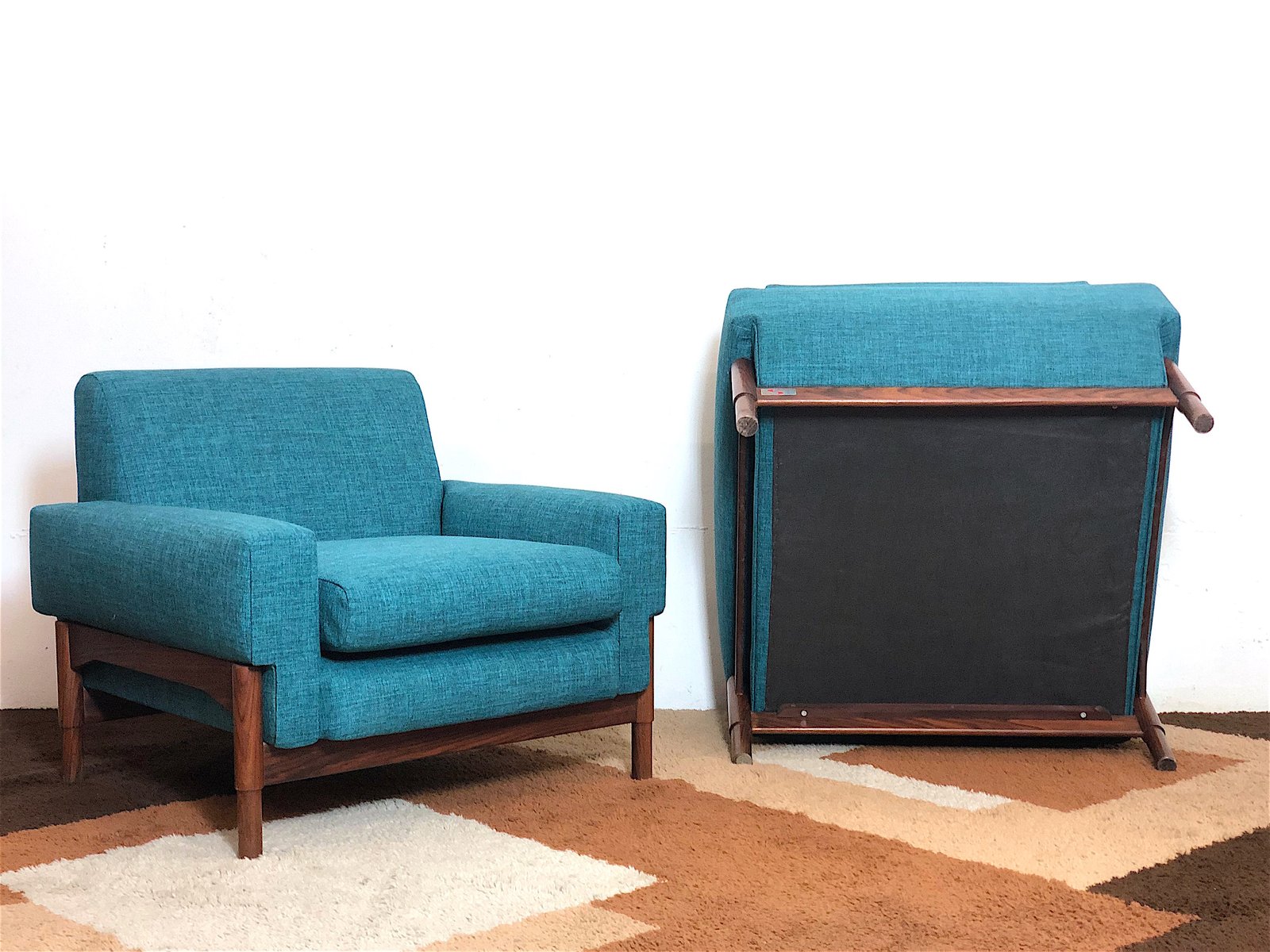Pair of Vintage "KIUSHU" Armchairs - Made in Italy - The armchairs are of Italian manufacture from the 1960s. The KIUSHU model was designed by the SAPORITI brothers, they stand out for a low and wide structure with generous padding, completely restored with new interior and upholstery. The structure is in solid National Walnut wood, internal padding made of high quality polyurethane foam, covered in Sky Blue cotton fabric. The KIUSHU model is an excellent example of Italian design from the 60s, characterized by futuristic lines. This armchair model stands out for an extremely innovative design that mixes sculptural shapes with ergonomic functionality. Ready to furnish your living room, with a modern style that makes these pieces adaptable to various contexts. PERFECT CONDITIONS Measurements: Height 75 cm - Width 85 cm - Depth 85 cm - Seat 50x60 cm - Seat height 45 cm