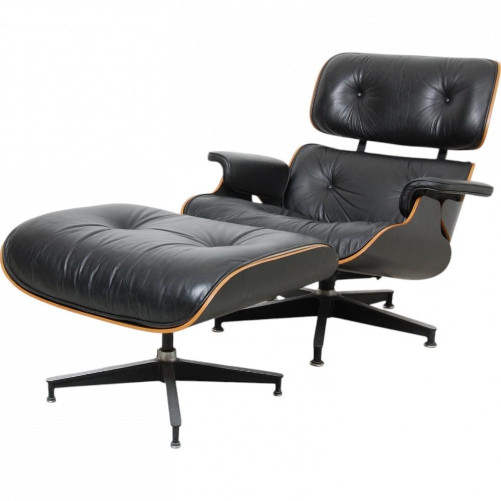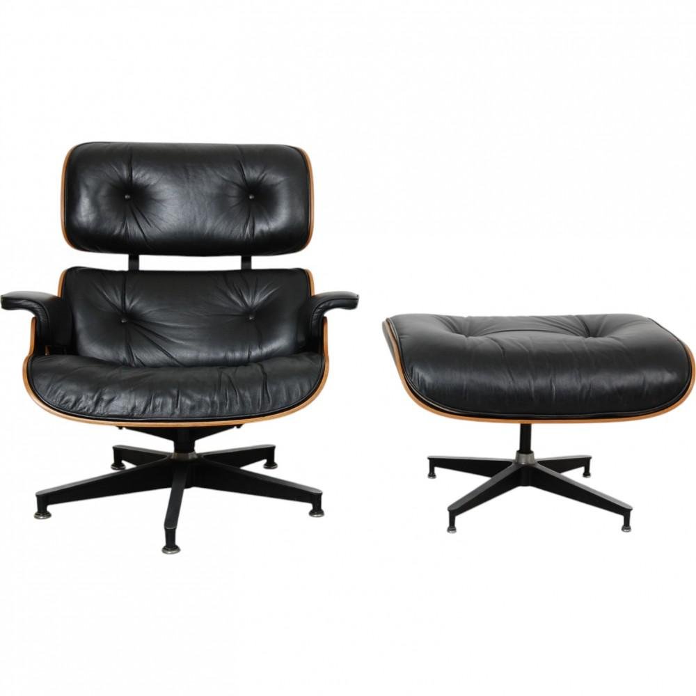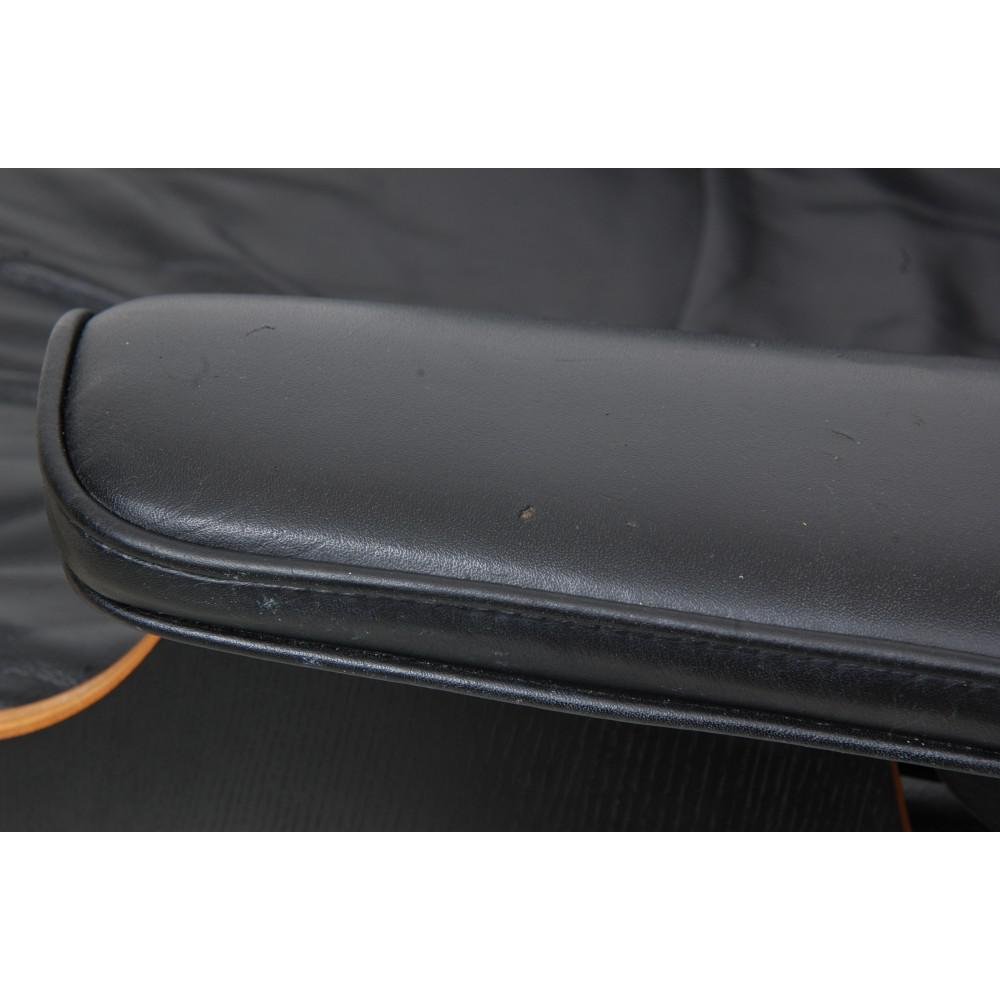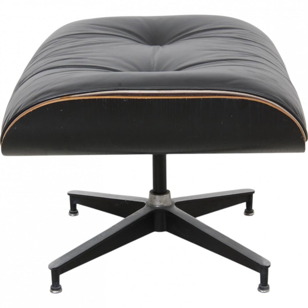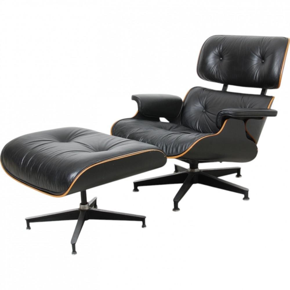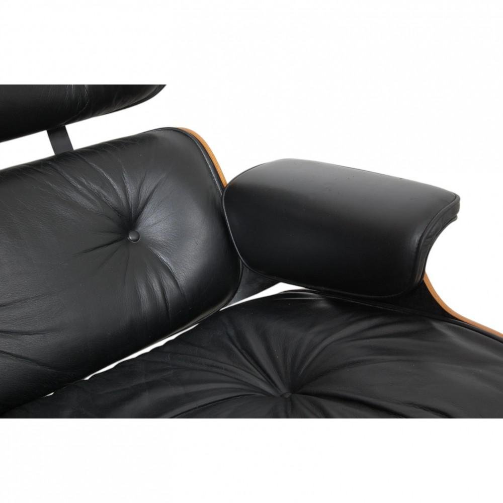 Sillón con otomana de cuero negro de Charles Eames, años 80. Juego de 2