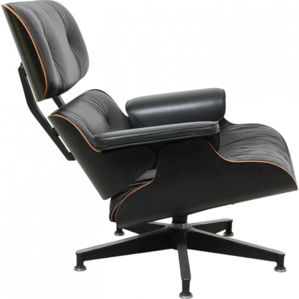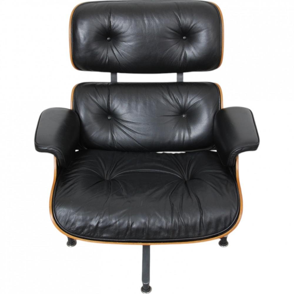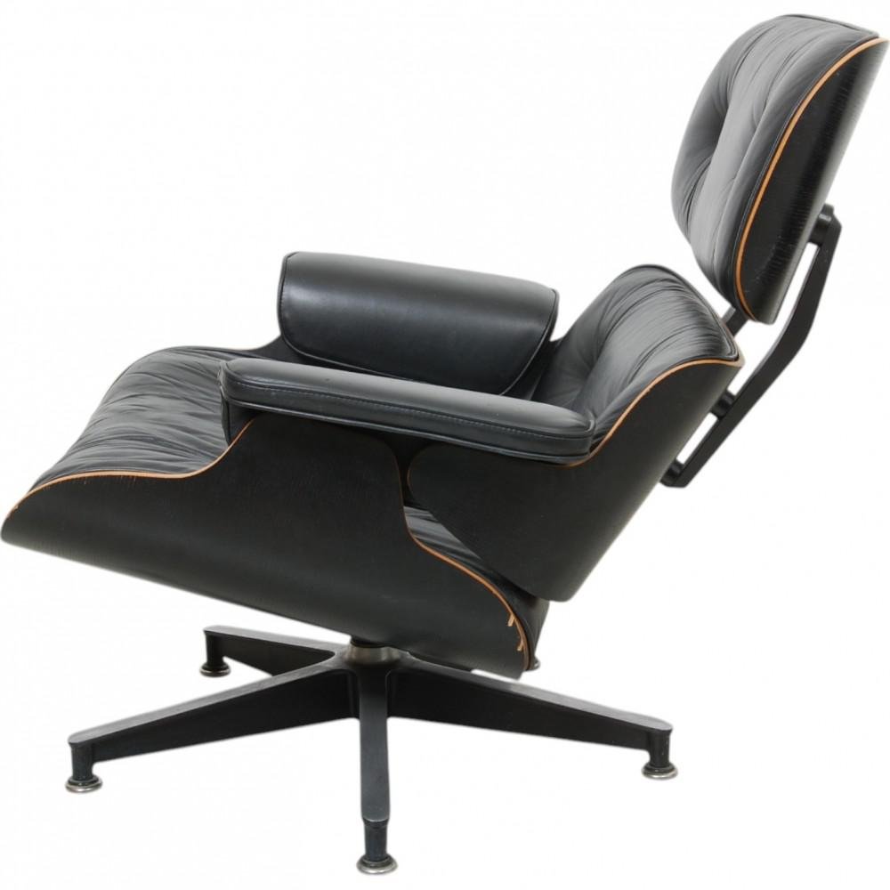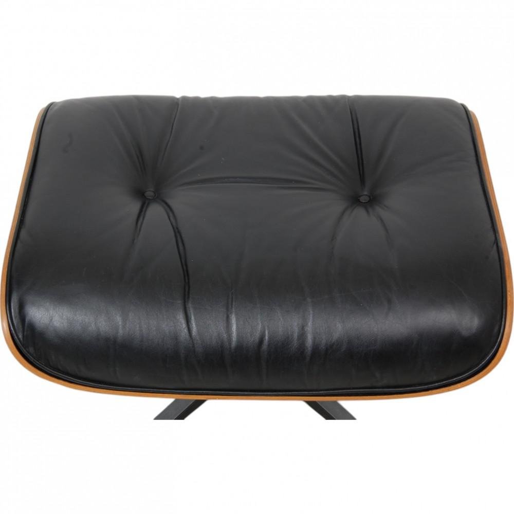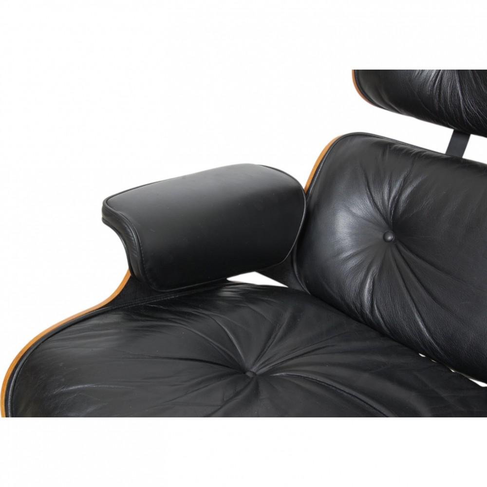 Sillón con otomana de cuero negro de Charles Eames, años 80. Juego de 2