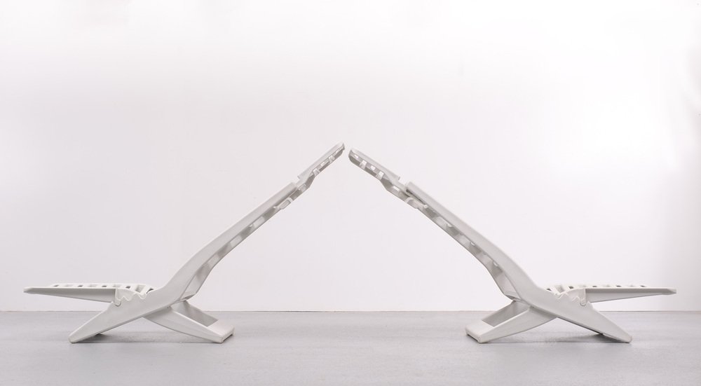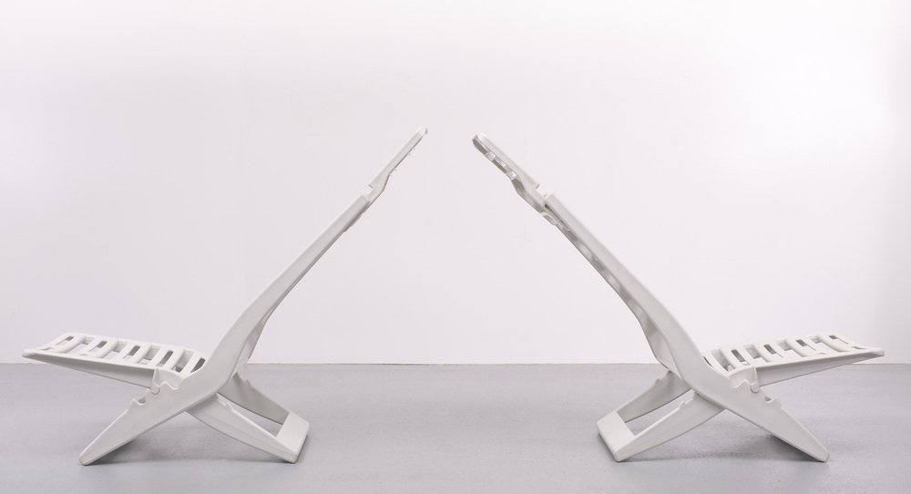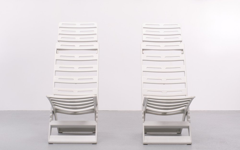 Dos sillas de diseño plegables de plástico (tipo Maratea) producidas por el fabricante italiano Fanini Fain (Ascoli Piceno).