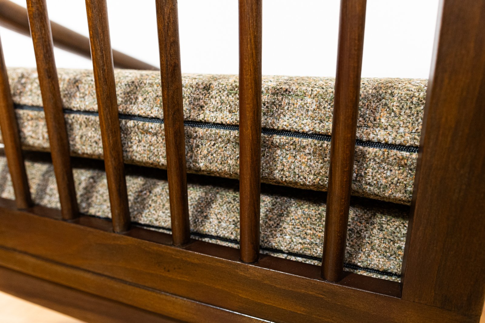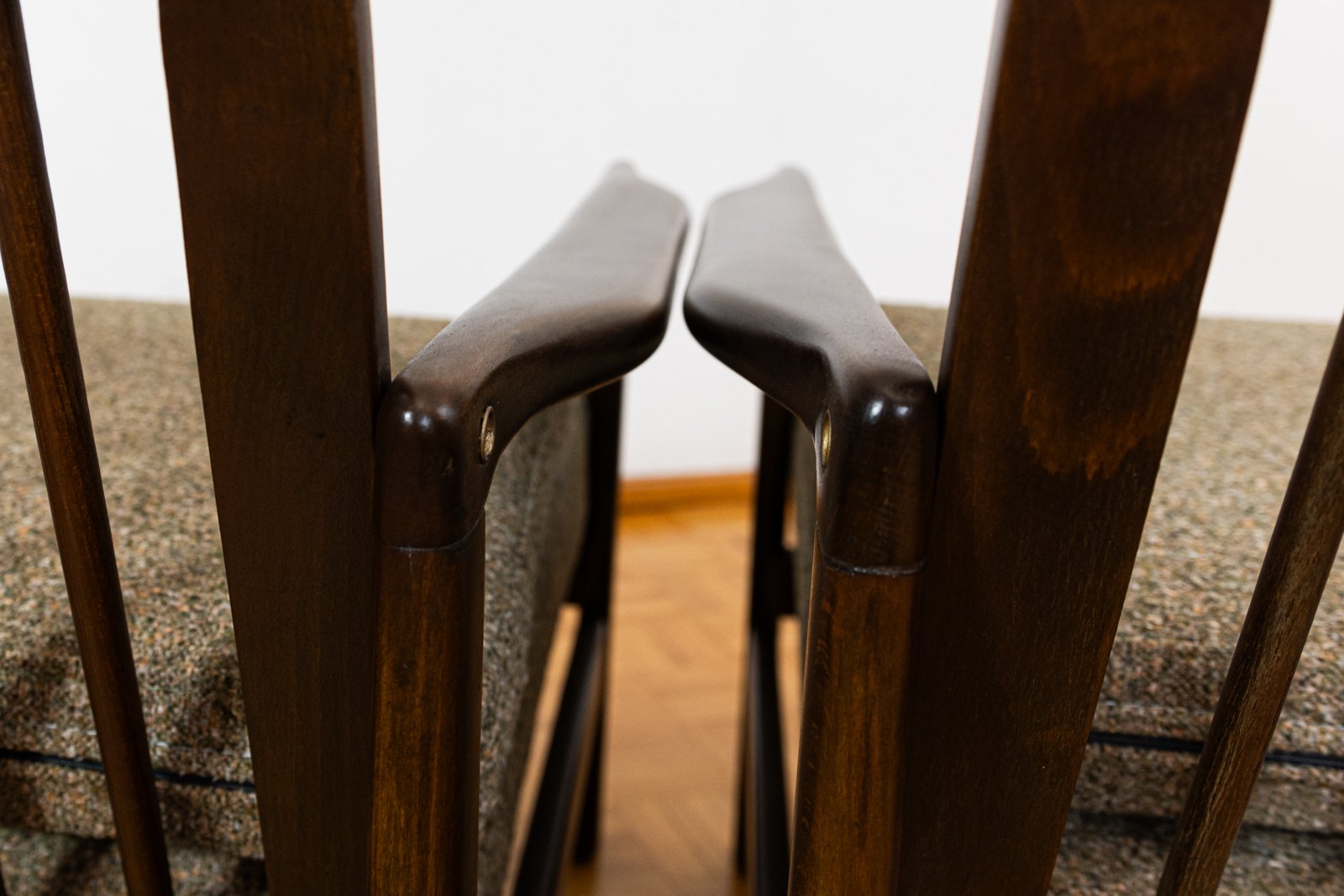La madera de haya maciza utilizada para la construcción de las sillas ha sido bellamente restaurada. Las sillas también están equipadas con cojines nuevos, tapizados en una suave tela verde-marrón.