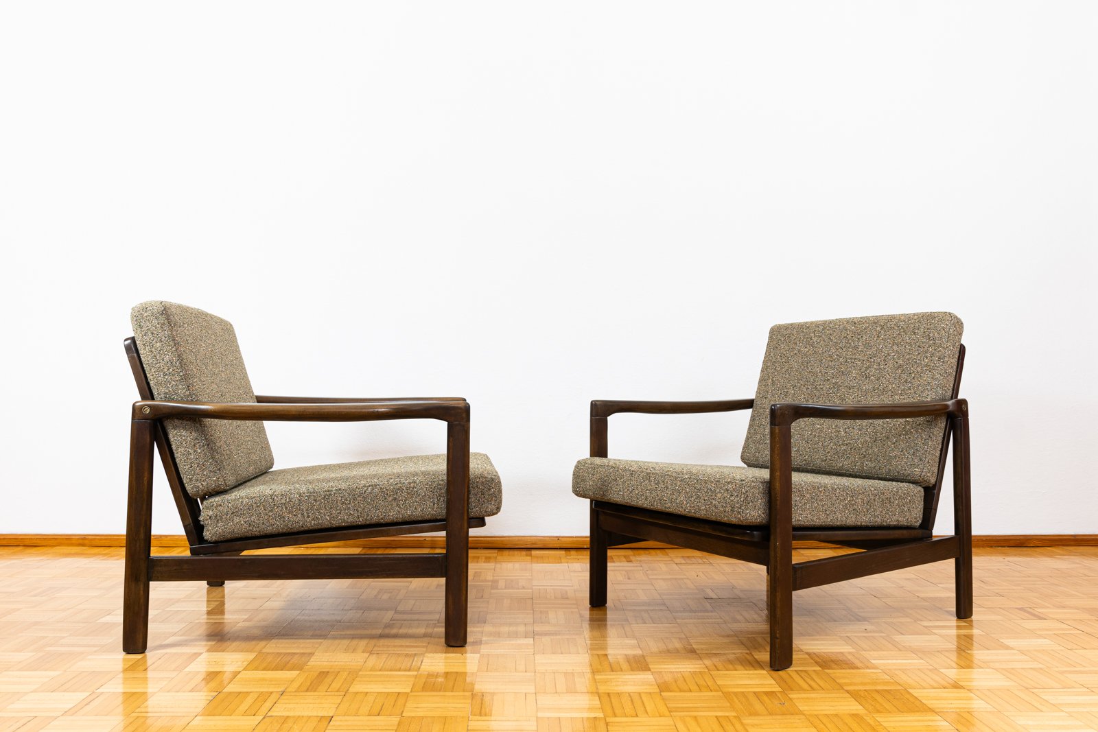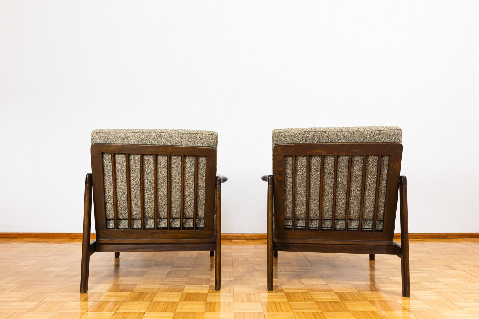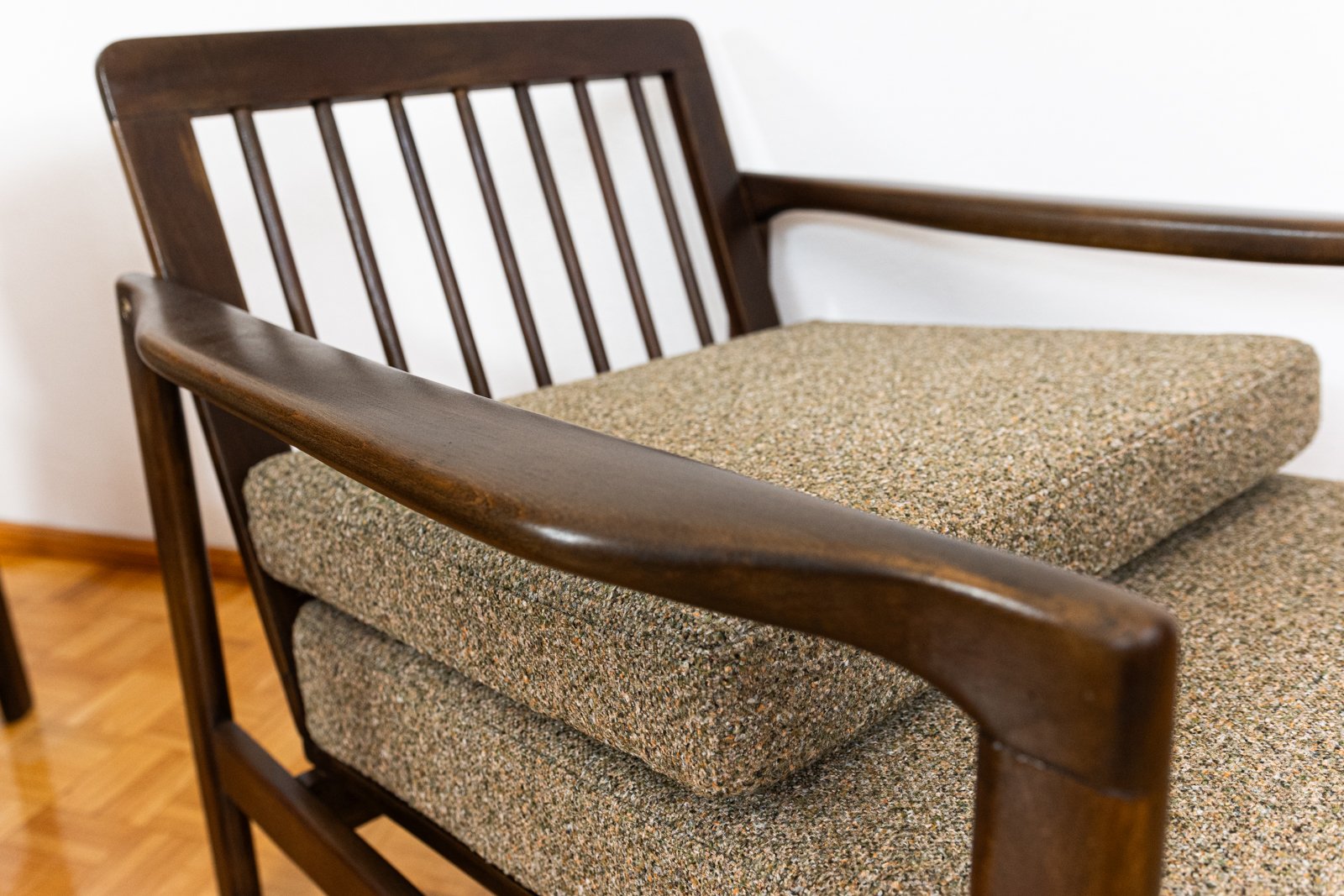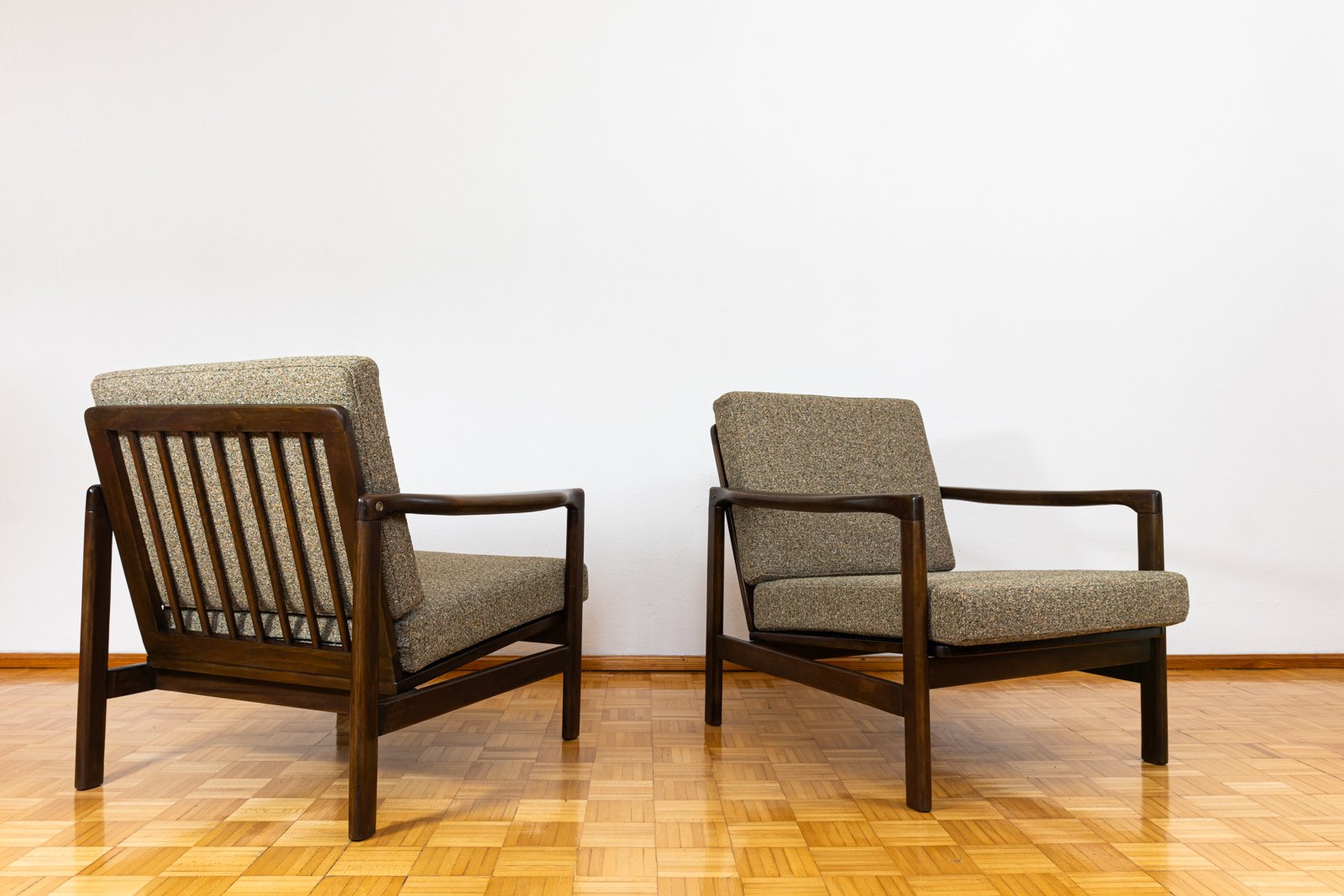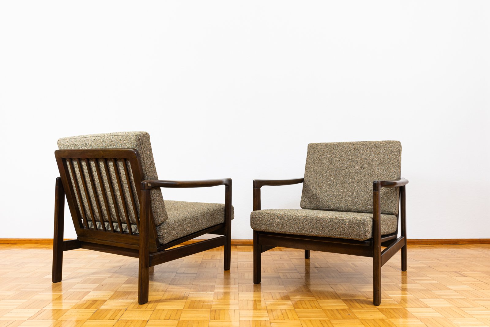 A pair of club chairs "type B7522," designed by Zenon Bączyk and produced in Poland in the 1960s, exemplifies the durability and timeless appeal of vintage furniture. The "B7522" model features ergonomically designed armrests, rounded legs, and a backrest with horizontal slats.