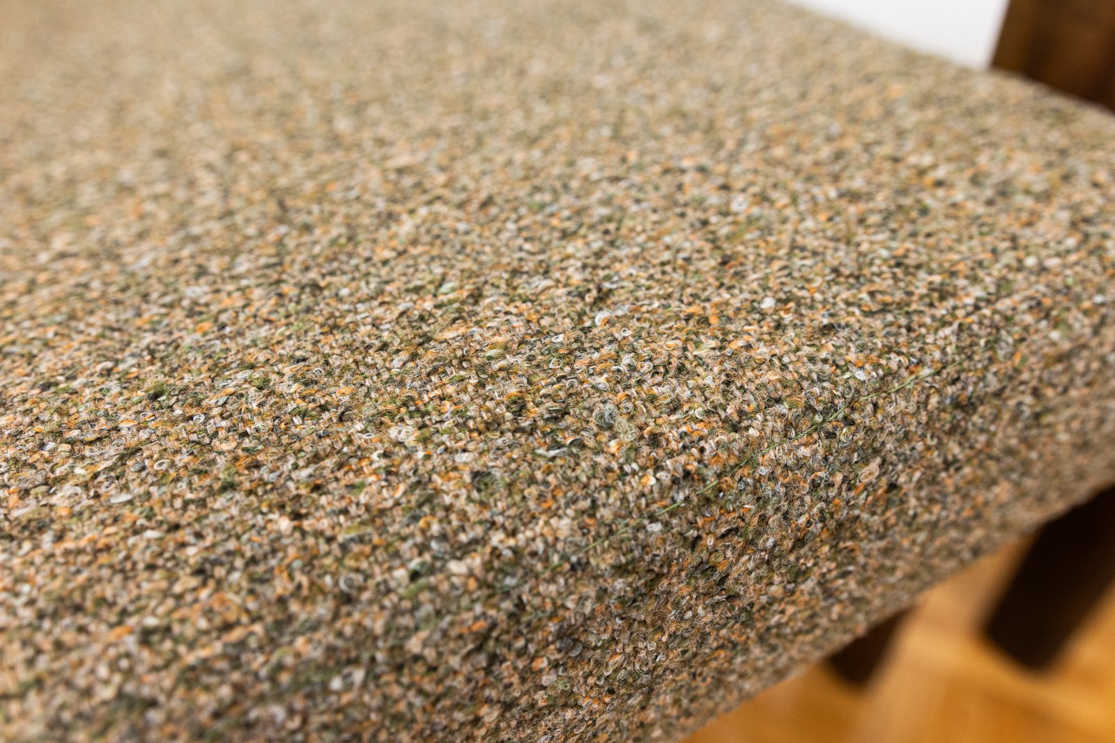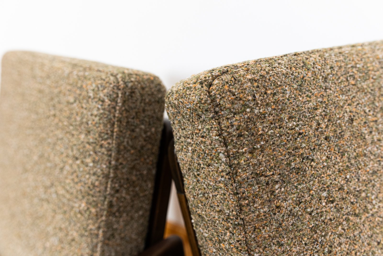 The solid beech wood used for the chair's construction has been beautifully refurbished. The chairs are also equipped with new cushions, upholstered in a soft green-brown fabric.
