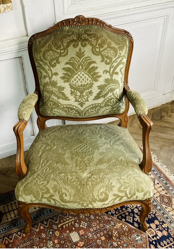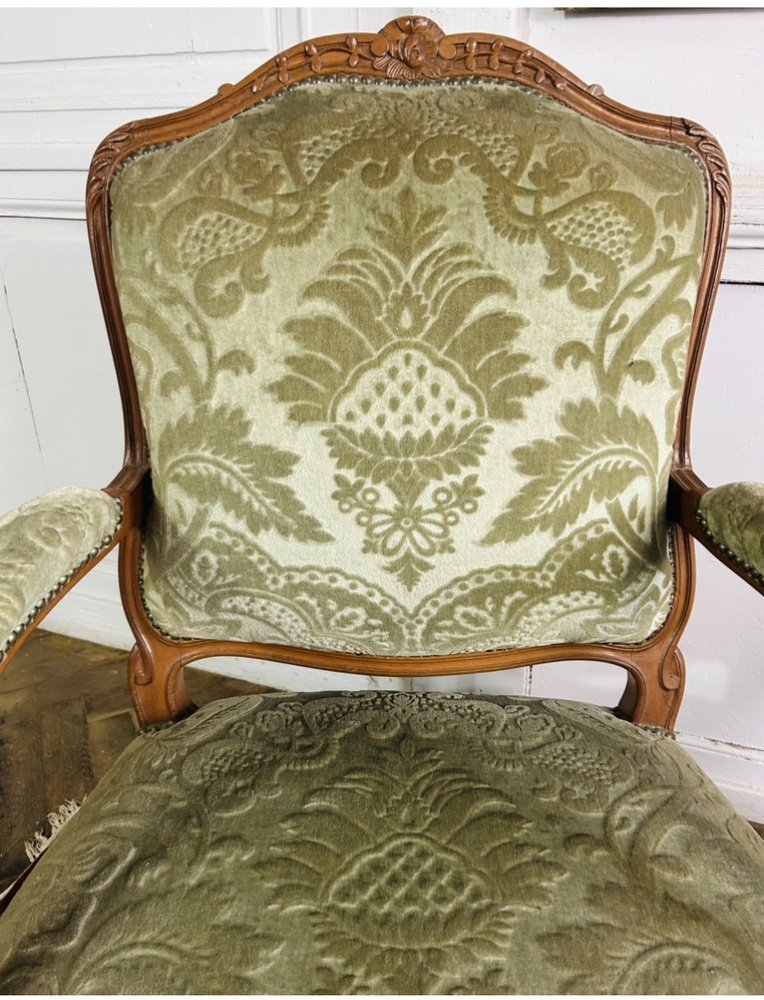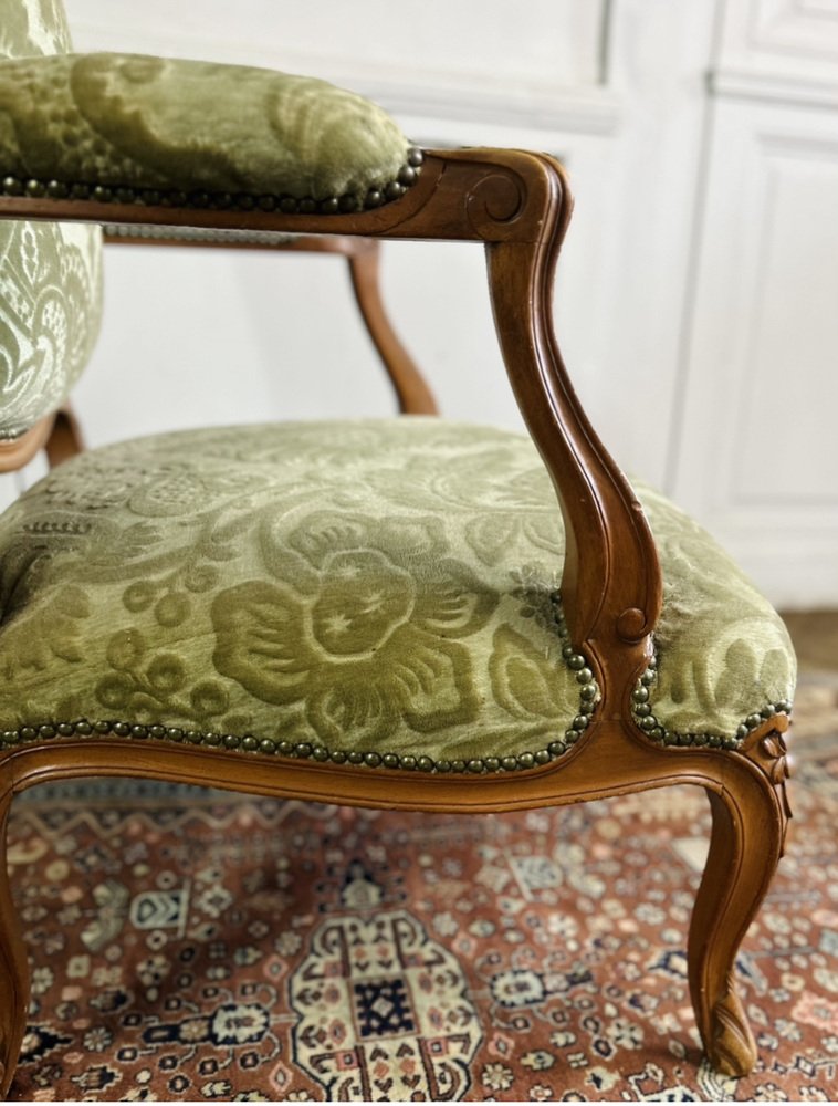 Encantadora pareja de sillones cabriolé estilo Luis 15 en madera de haya, tapizados en tela de terciopelo verde almendra. Periodo Napoleón 3.