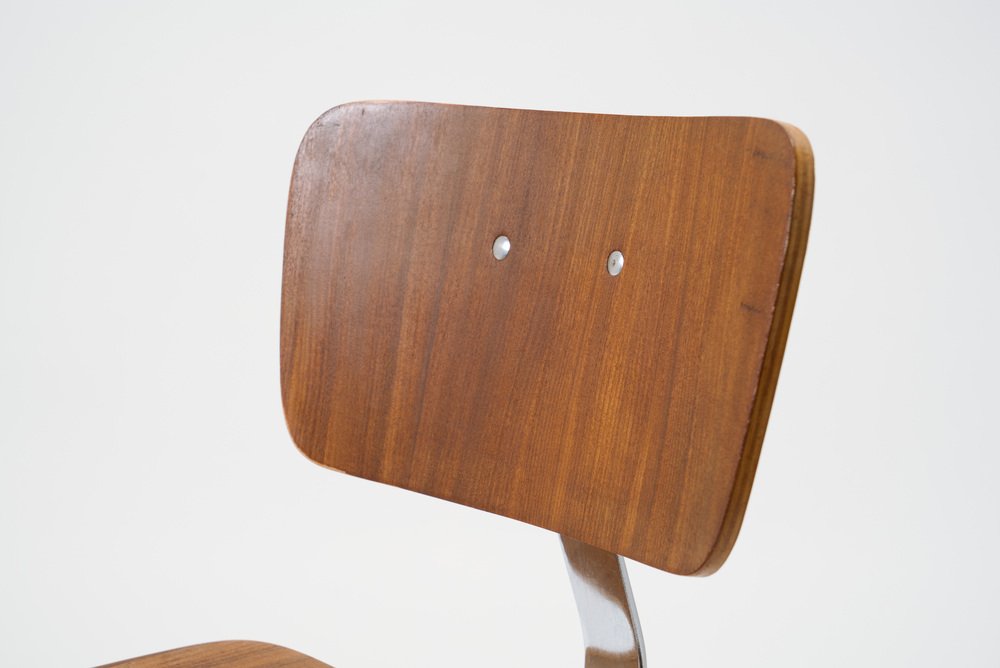 The chair is in very good, restored condition. Age-related signs of wear (such as scratches) are present on the seat/backrest and have not been hidden in order to preserve the period authenticity. The seats have been polished. Overall, the existing patina looks harmonious with the overall picture. The chrome-plated frame was carefully cleaned and polished to a shine with wax.