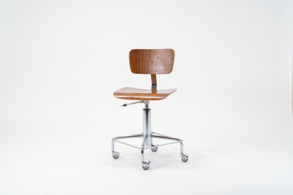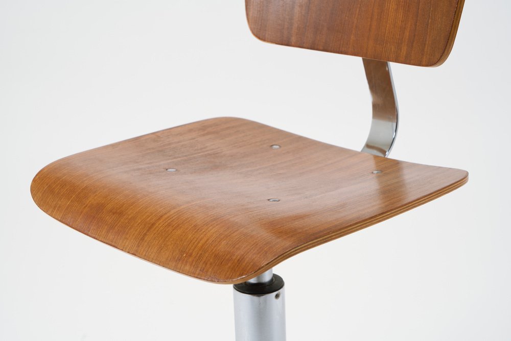Silla de escritorio / silla giratoria / silla de arquitecto minimalista de Bremshey & Co. Solingen de Alemania, circa 1950s. Las superficies de asiento y respaldo son de hermosa chapa de madera contrachapada / pagwood, probablemente con una capa superior de nogal y una curva agradable. El color de la madera es comparable al RAL 8003 (marrón arcilla). El marco está cromado. Las piernas pueden apoyarse cómodamente en los travesaños inferiores. El asiento es regulable en altura mediante Lift-o-mat. El respaldo es ajustable en profundidad y altura. El suelo duro existente se sustituyó por ruedas blandas, modernas y de marcha suave.