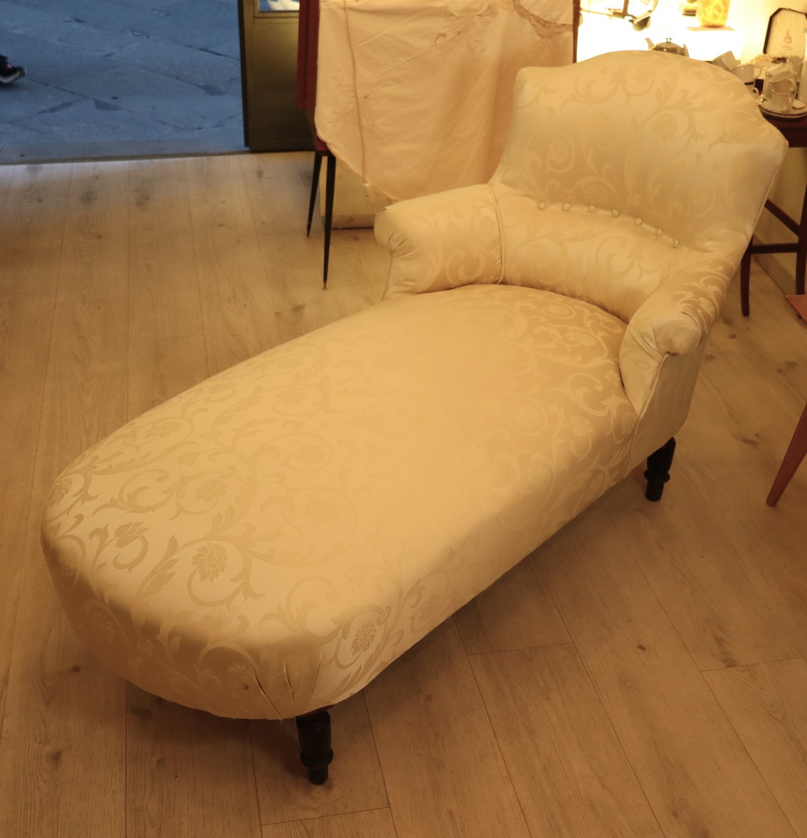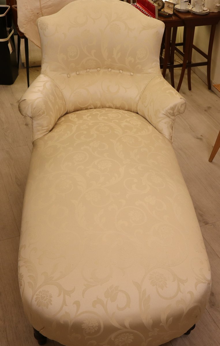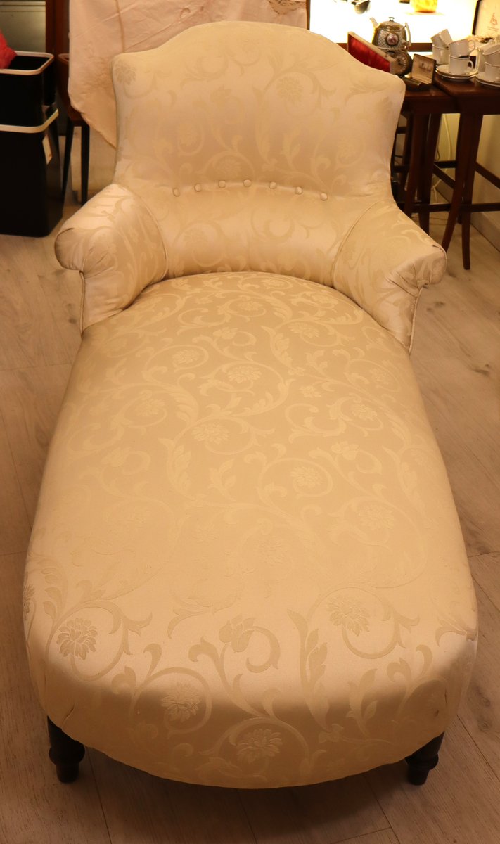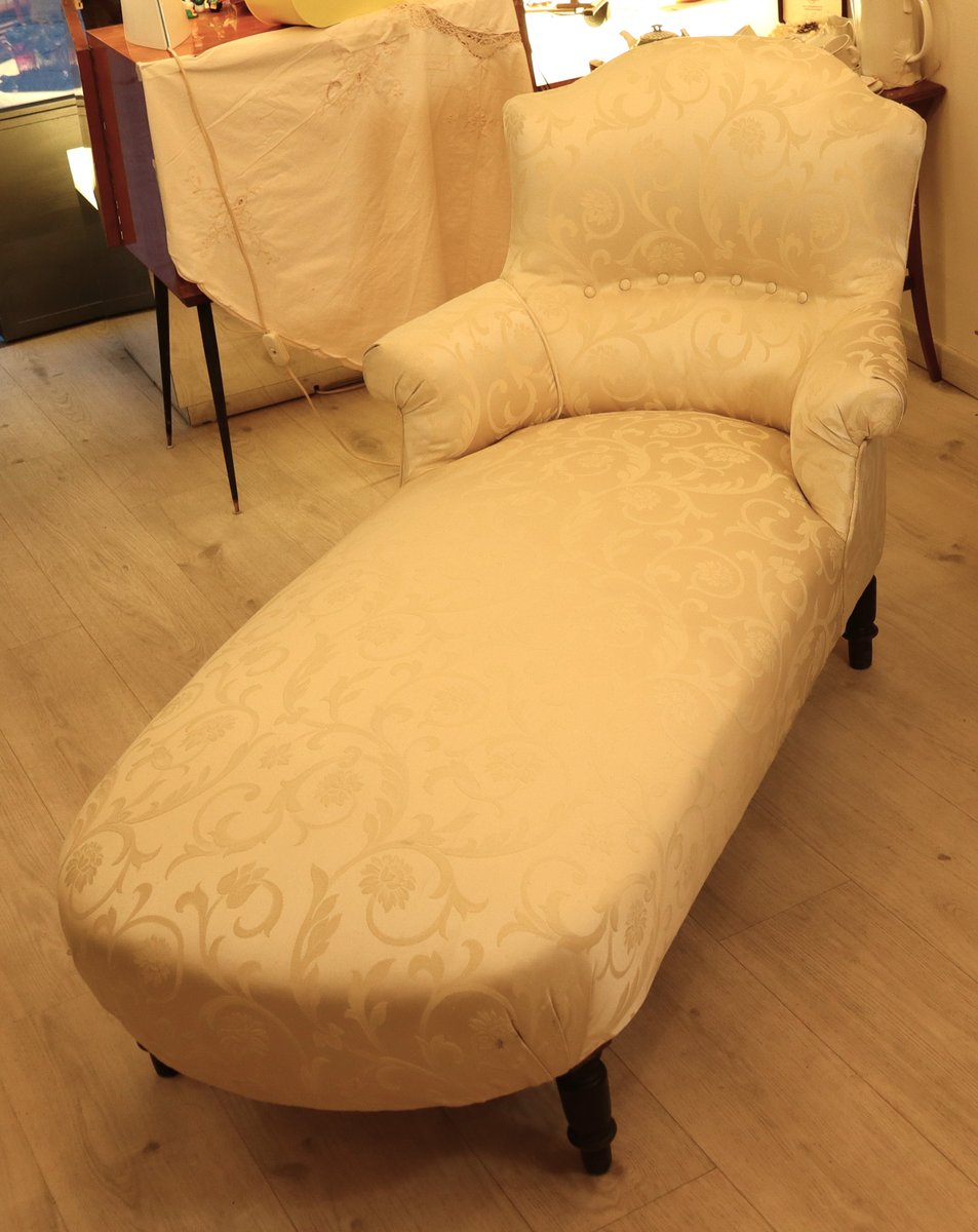 Preciosa chaise longue del emblemático estilo Napoleón III, época en la que, además del Imperio, se "restauraron" la imagen y el imaginario de opulencia y grandeza de una Francia en pos de la grandeza La chaise longue está perfectamente conservada con su tela original; el respaldo "chapeau de gendarme" es particularmente gracioso, y el asiento es extremadamente cómodo y perfectamente tenso. La tela es un damasco marfil tono sobre tono, sin desgarros ni zonas adelgazadas. Las patas y el armazón están perfectos, y el estado de conservación es muy bueno.