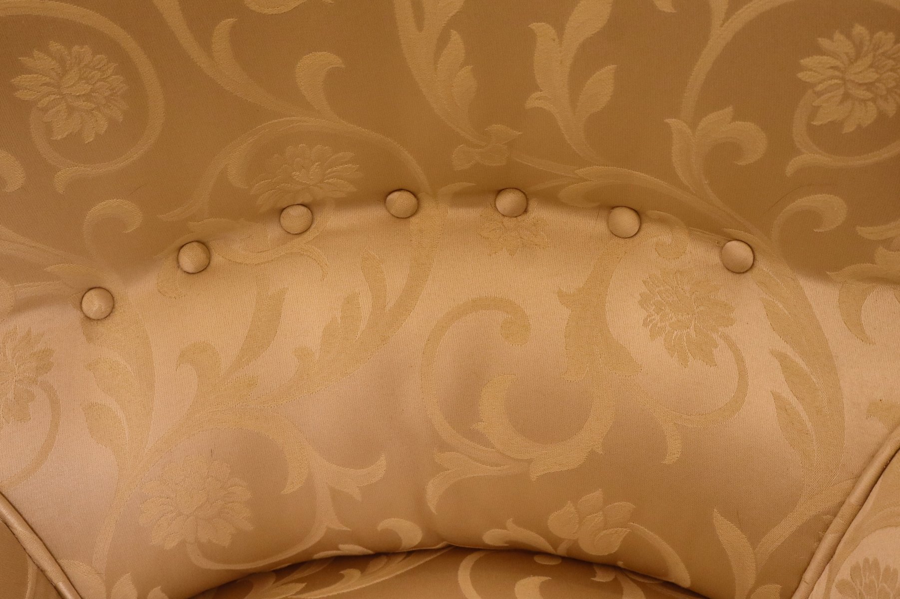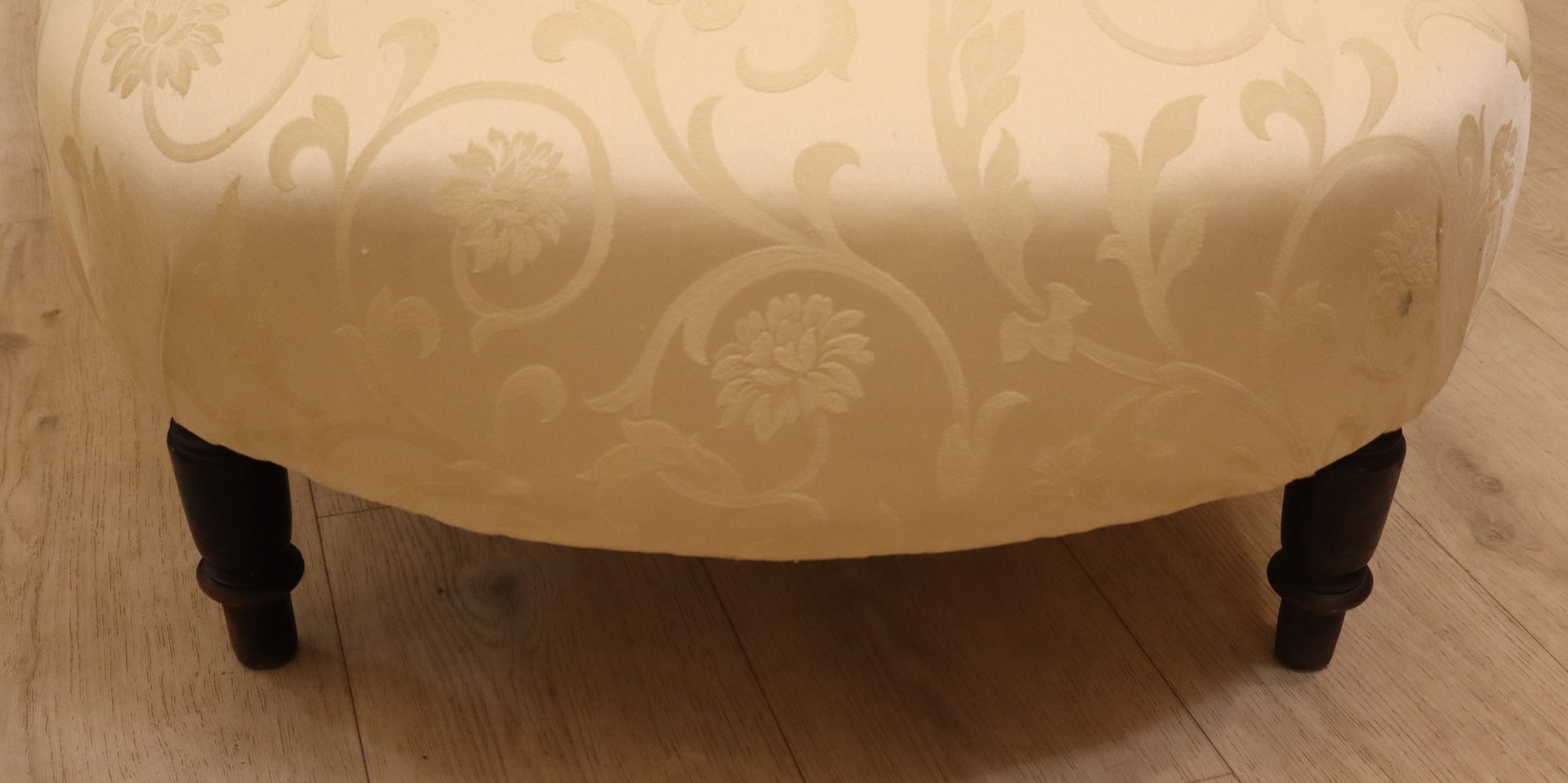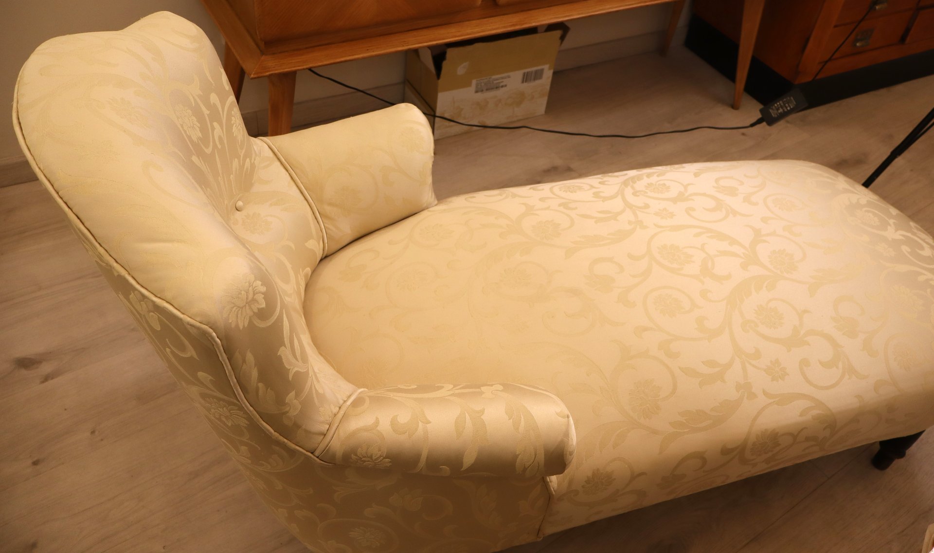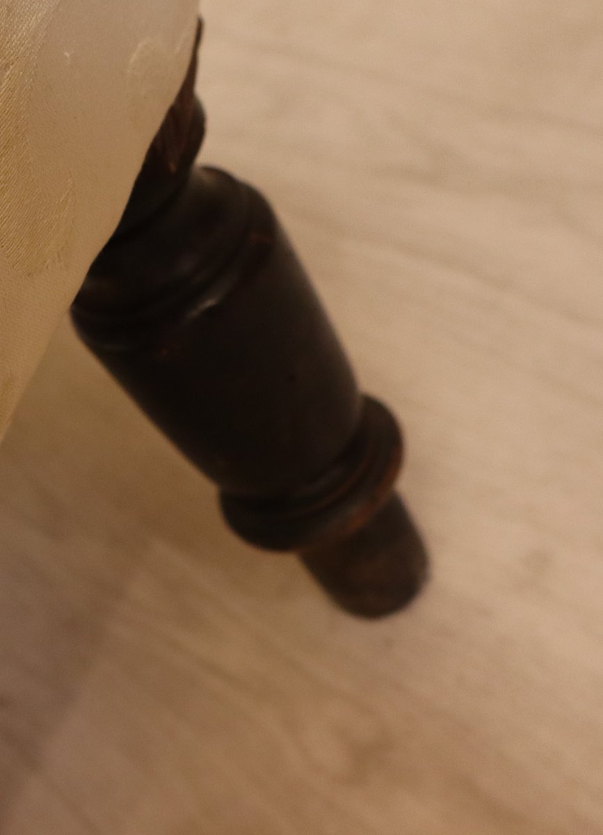 Preciosa chaise longue del emblemático estilo Napoleón III, época en la que, además del Imperio, se "restauraron" la imagen y el imaginario de opulencia y grandeza de una Francia en pos de la grandeza La chaise longue está perfectamente conservada con su tela original; el respaldo "chapeau de gendarme" es particularmente gracioso, y el asiento es extremadamente cómodo y perfectamente tenso. La tela es un damasco marfil tono sobre tono, sin desgarros ni zonas adelgazadas. Las patas y el armazón están perfectos, y el estado de conservación es muy bueno.