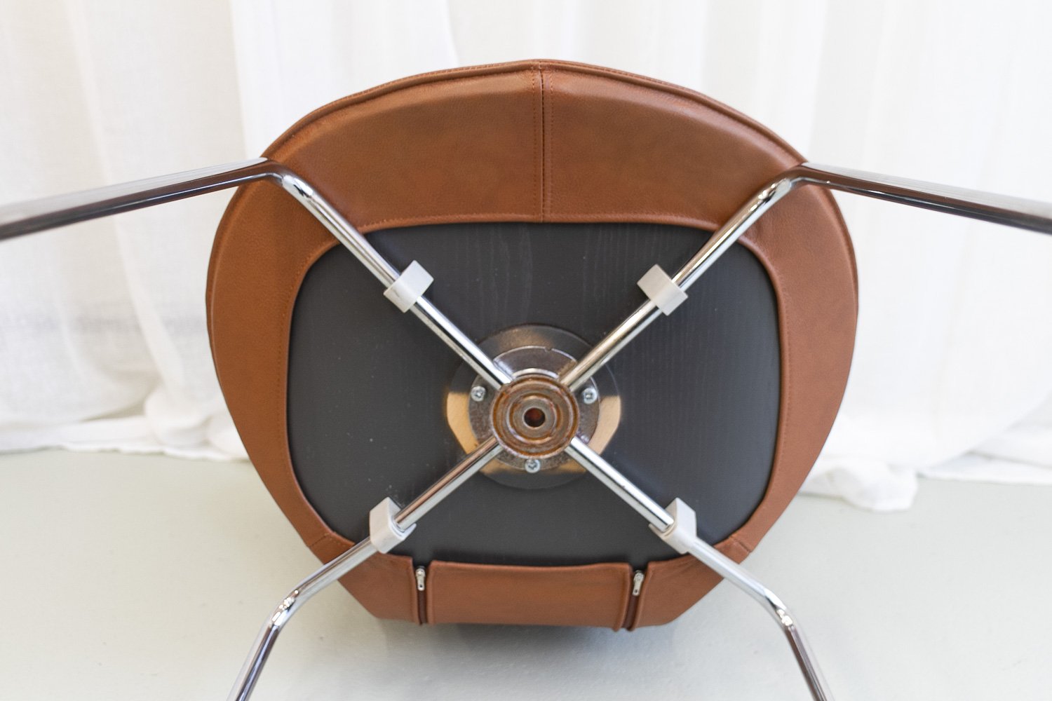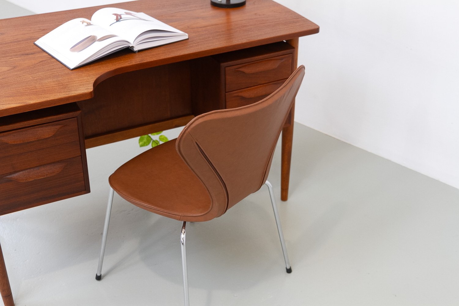 In 1932, Christian brought in his own sons, Fritz and Søren, who updated the product line to include more modernist styles, like Søren’s Thonet-inspired DAN Chair (1930) and a cantilevered wicker and tubular steel chair by architect Mogens Lassen (1933). Other early classics in the Fritz Hansen catalog include Kaare Klint’s Church Chair (1936), Hans Wegner’s China Chair (1944), and Børge Mogensen’s Spoke Back Sofa (1945).