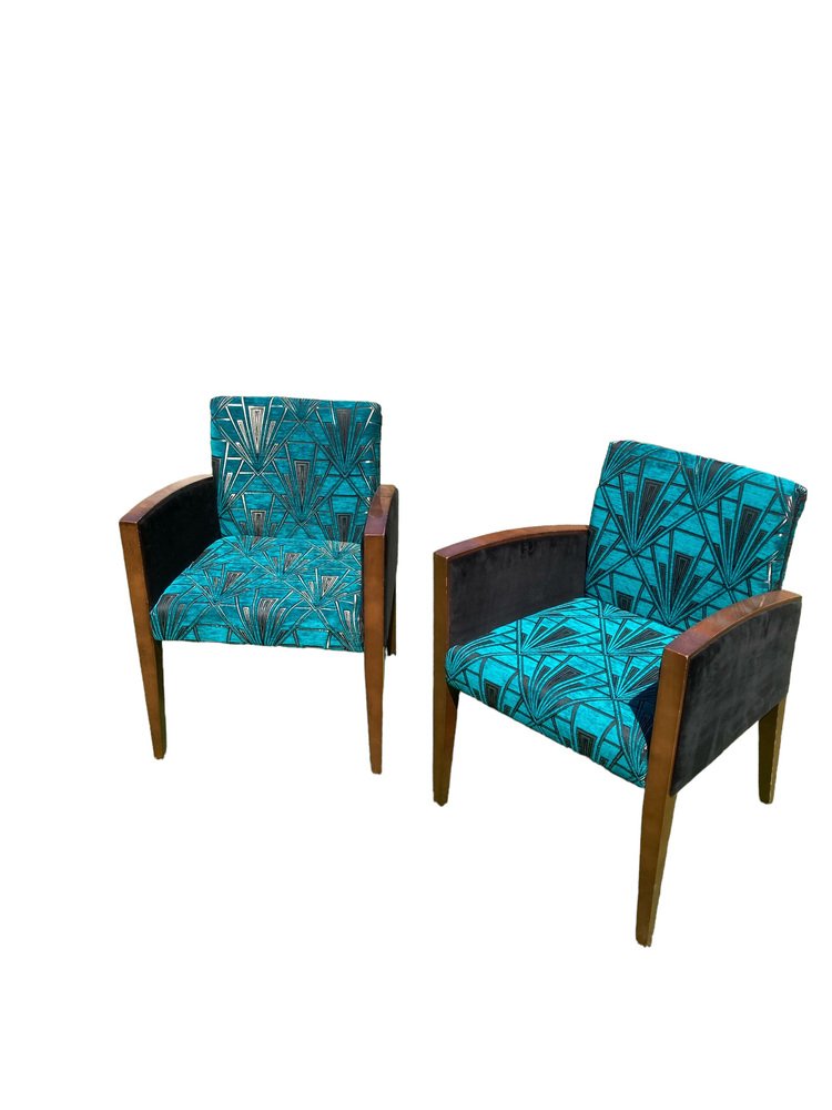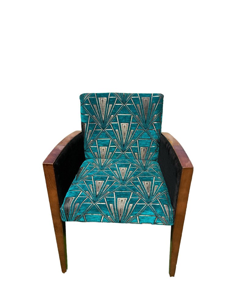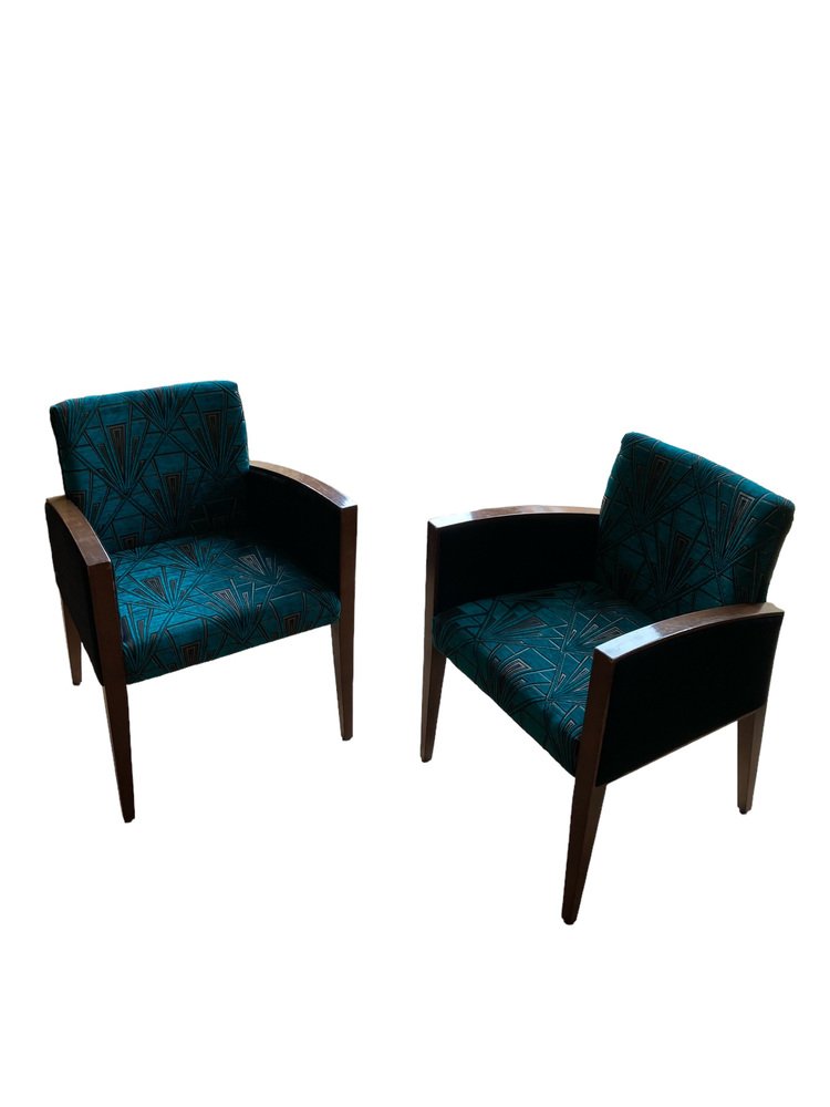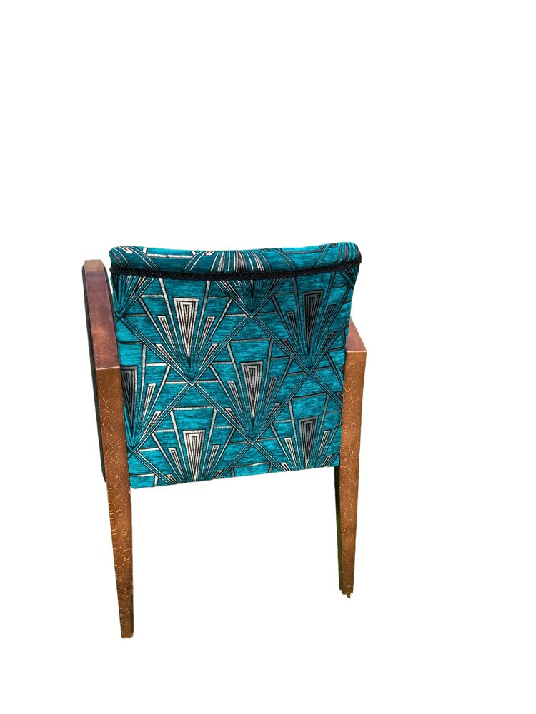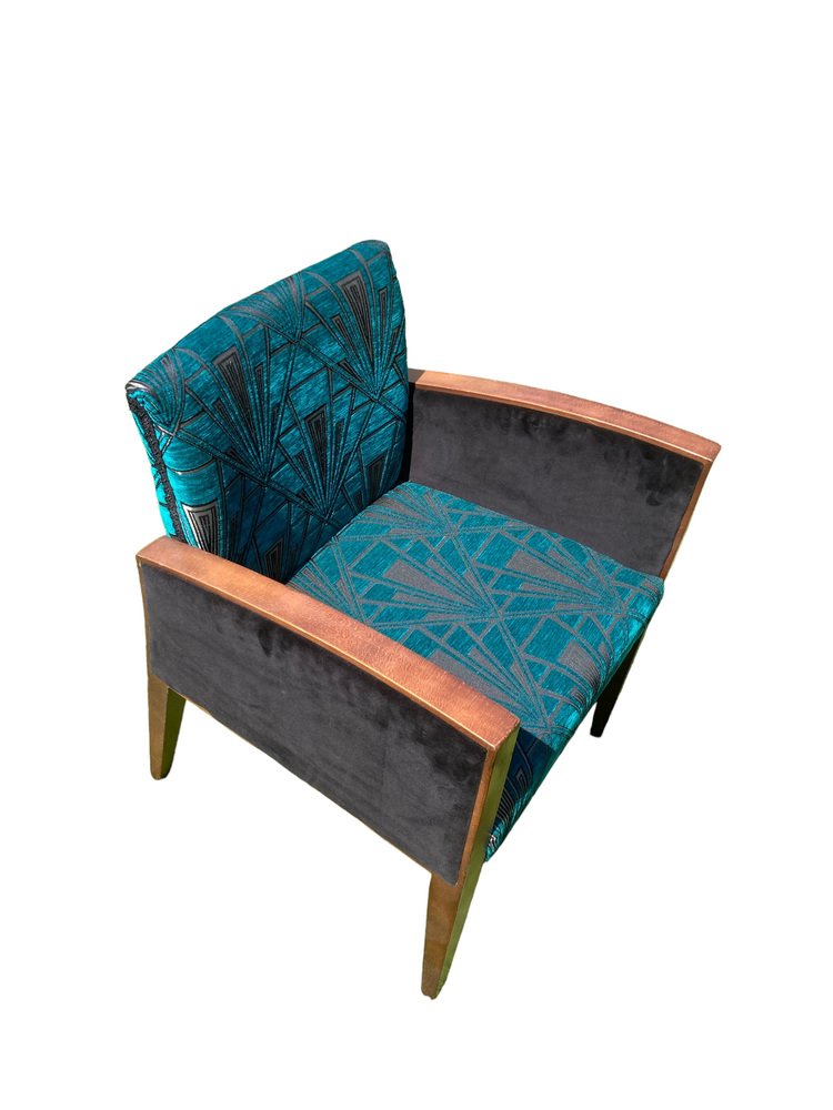 Sillas Art Déco retapizadas en azul verdoso y dorado, terciopelo Great Gatsby plateado, Juego de 2