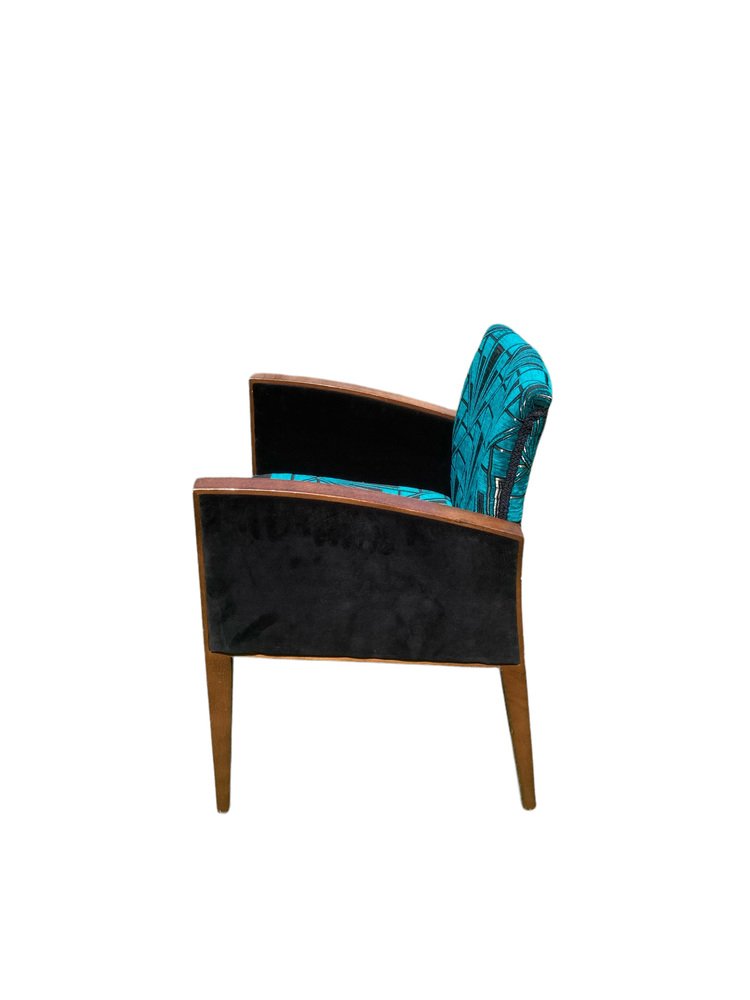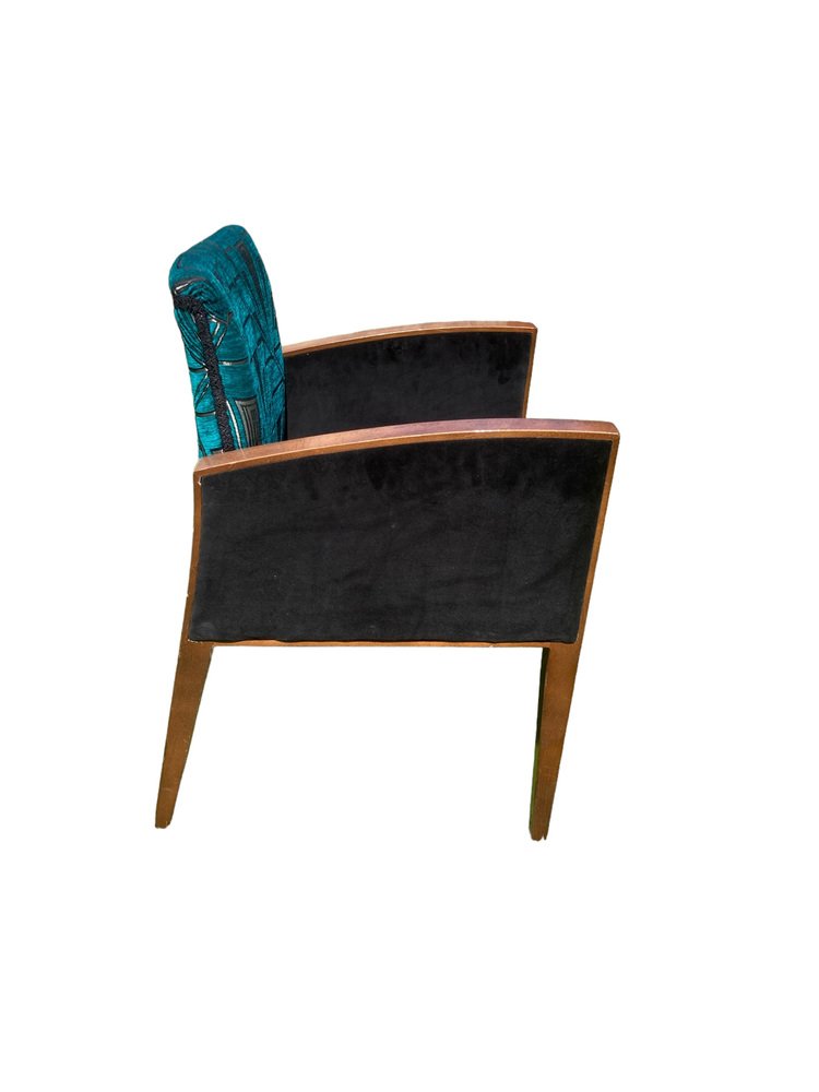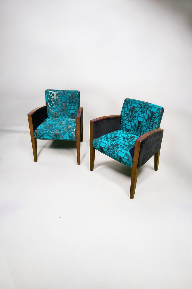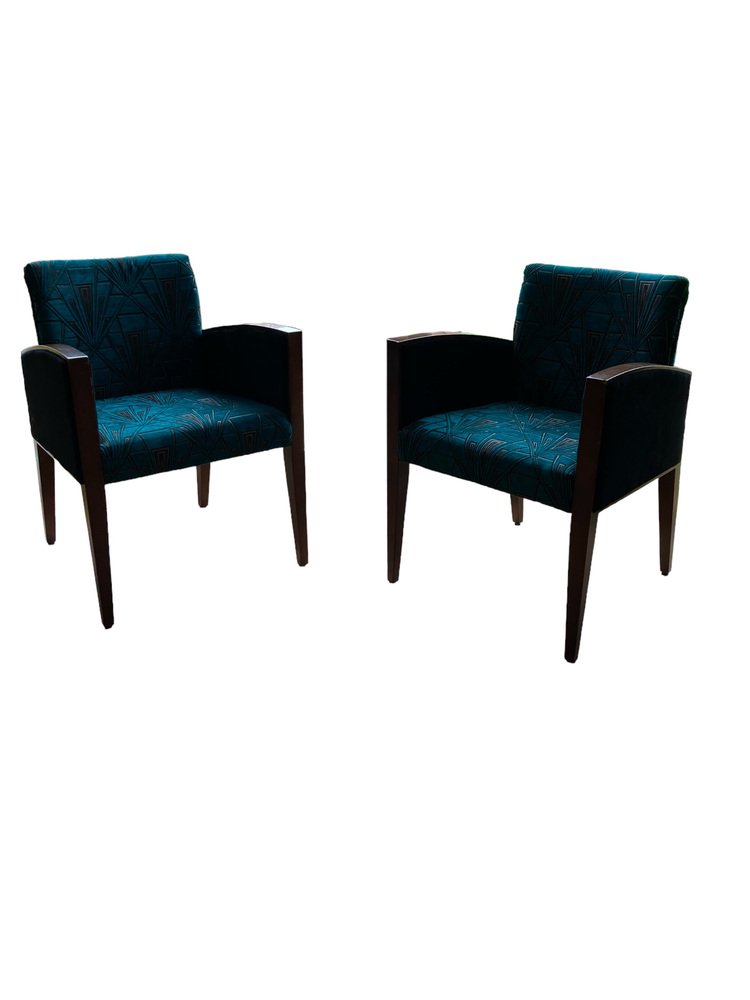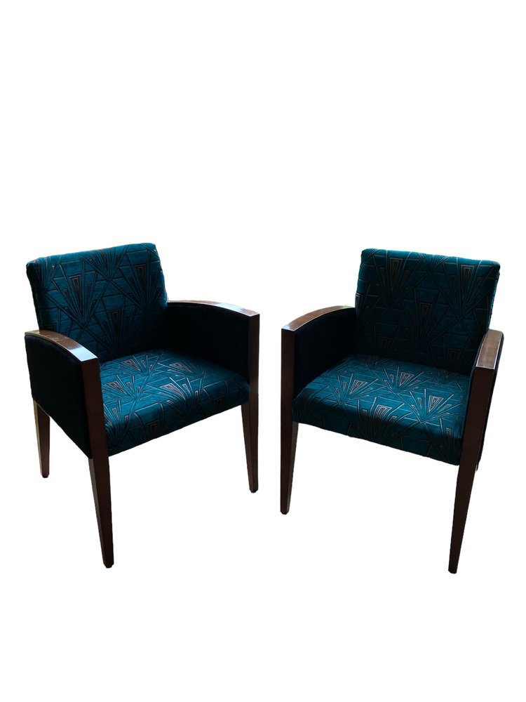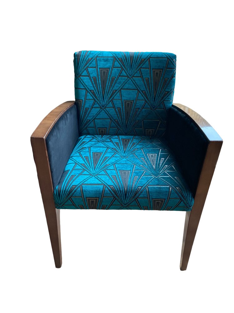 Sillas Art Déco retapizadas en azul verdoso y dorado, terciopelo Great Gatsby plateado, Juego de 2