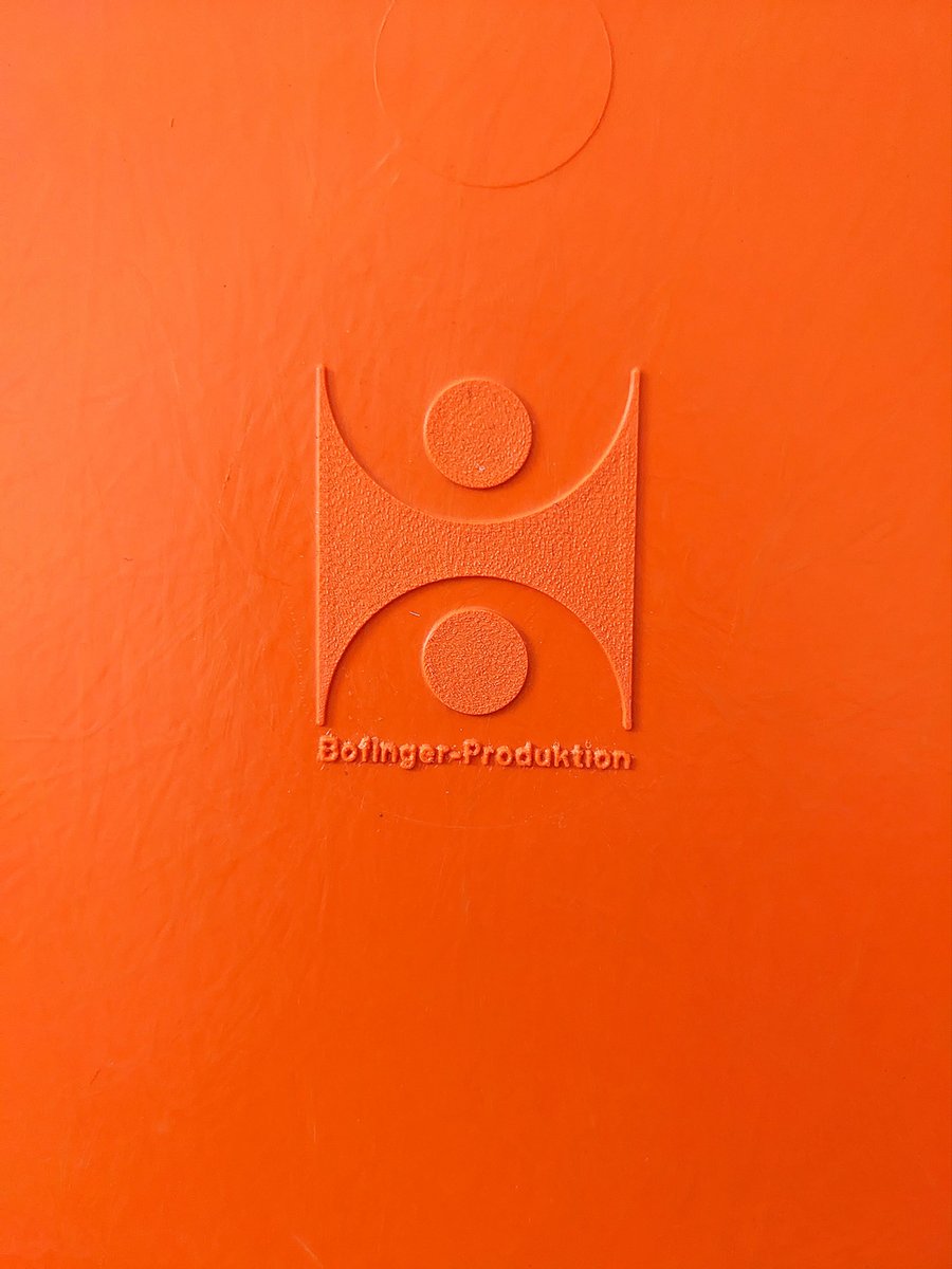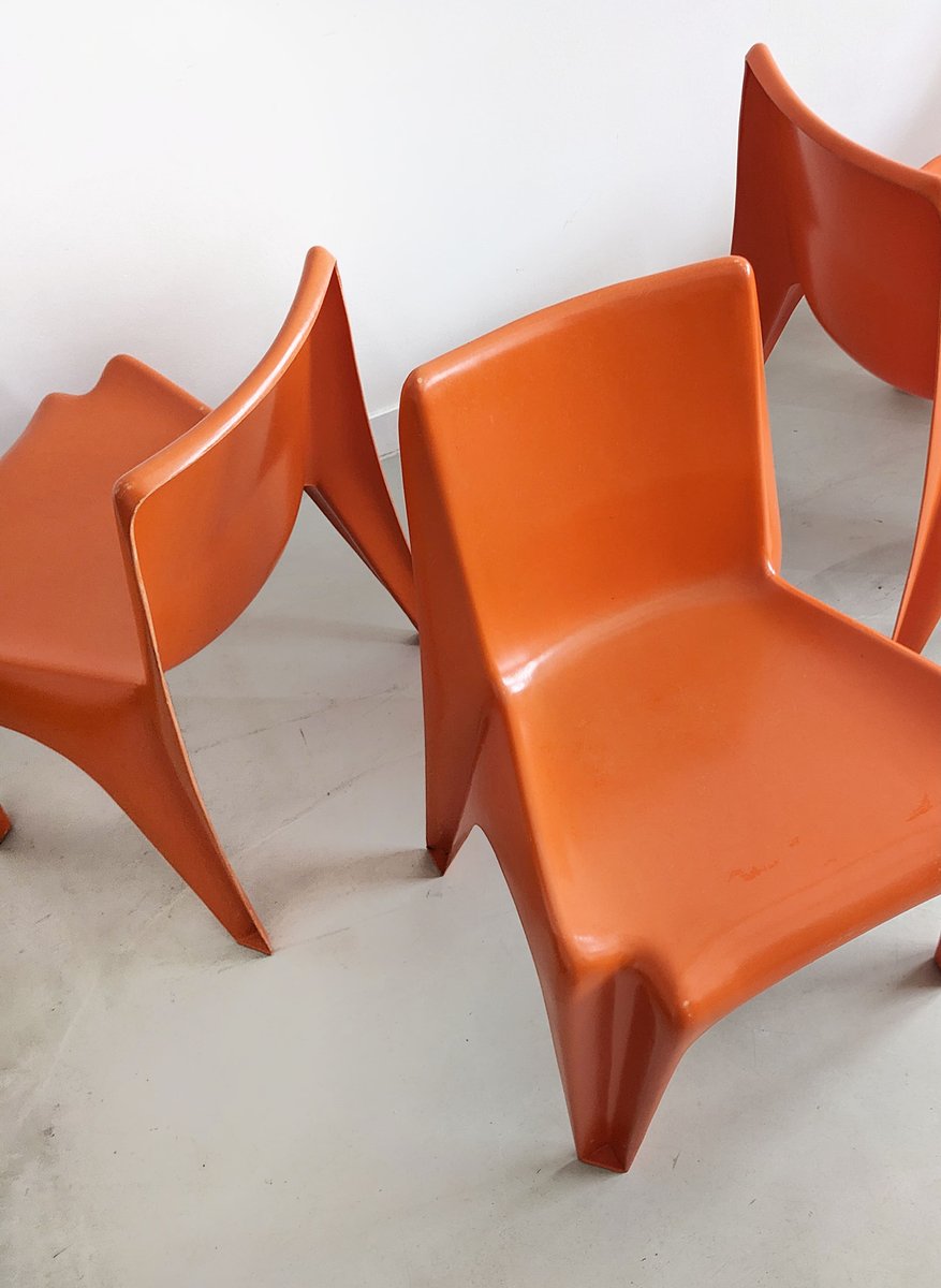 We have 4 original Bofinger Chairs for sale, all carrying the maker's mark, in the most popular colour: Space Age Orange. All chairs are stackable and suited for both indoor and outdoor use. Price is for the set.