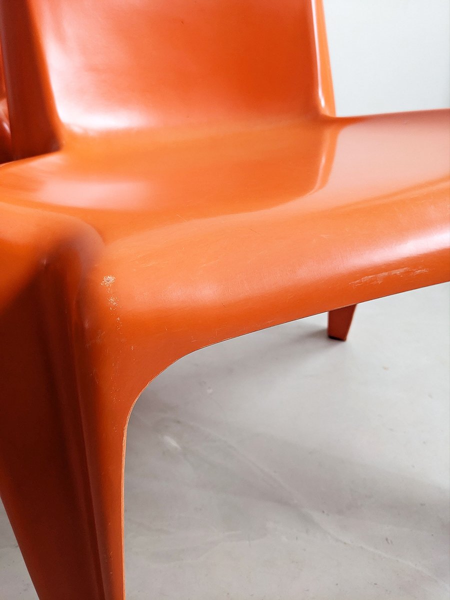 The Bofinger Chair, also named BA 1171, was designed in 1964 by architect and designer Helmut Bätzner in close co-operation with the Bofinger company. The design was completely unique; a stacking chair, developed to be the first one-piece plastic chair worldwide made out if fibreglass-reinforced polyester to be mass-produced in one single pressing process. The material was dyed all way through before being processed and available in a range of colours including white, yellow, black, red, blue, green, brown and orange. In a long trial series the characteristic shape of the chair was found in regard to seating shape, maximum stability by smallest quantity of material used, required elasticity, stacking capability, and industrial mass-production.