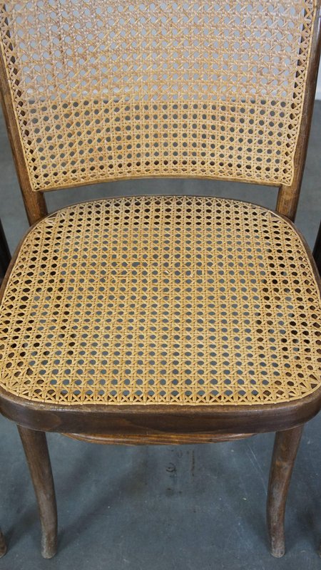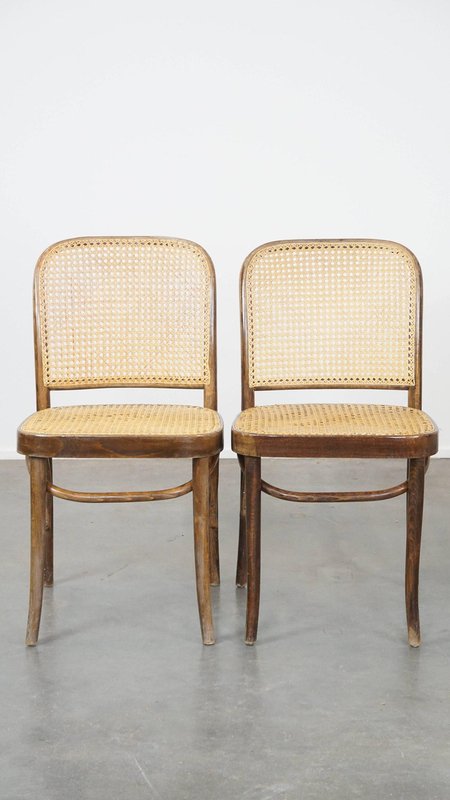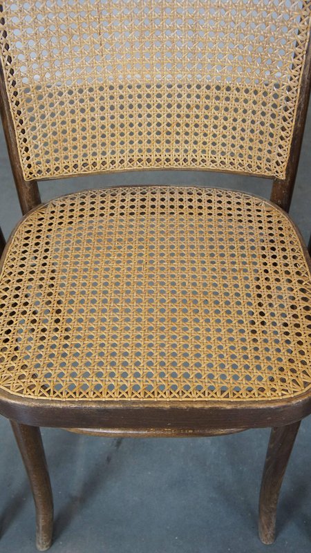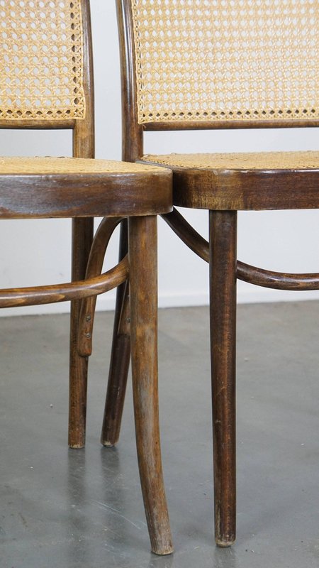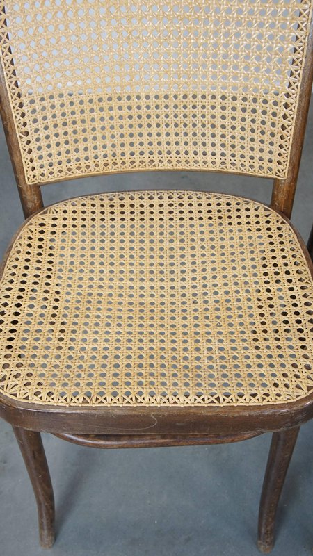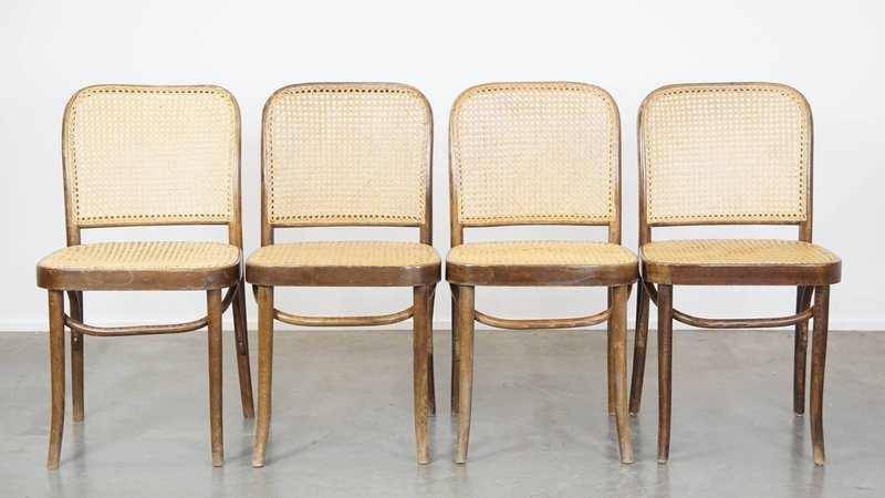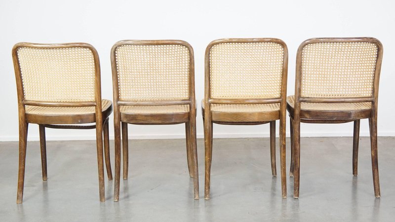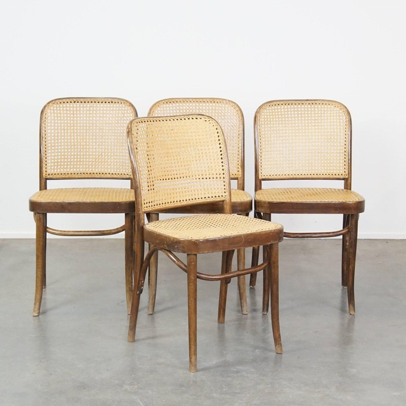 Set of 4 vintage bistro chairs model 811 by Josef Hoffmann for FMG. This nice set of vintage design café chairs, model no. 811, are also called 'Prague chairs'. They were designed by Josef Hoffmann for Thonet and the chairs were produced by FMG in Poland in the 1960s. The chairs look beautiful in both a classic and a modern interior. They have normal signs of wear considering their age, which is partly why they have acquired a beautiful patina. As shown in the photos, they have had some repairs in the past. Naturally, they are still structurally in a good and immediately usable condition. When used properly, they will provide you with many years of seating and viewing pleasure! Please note: The dimensions stated in our advertisement text are leading.