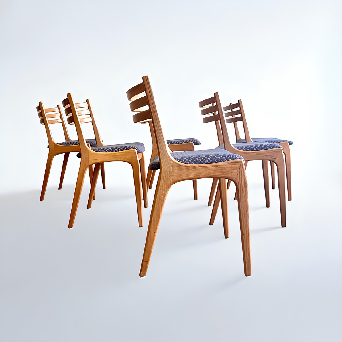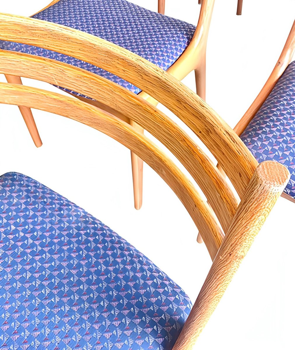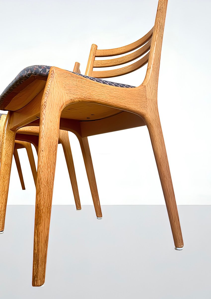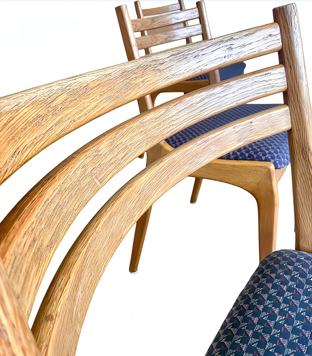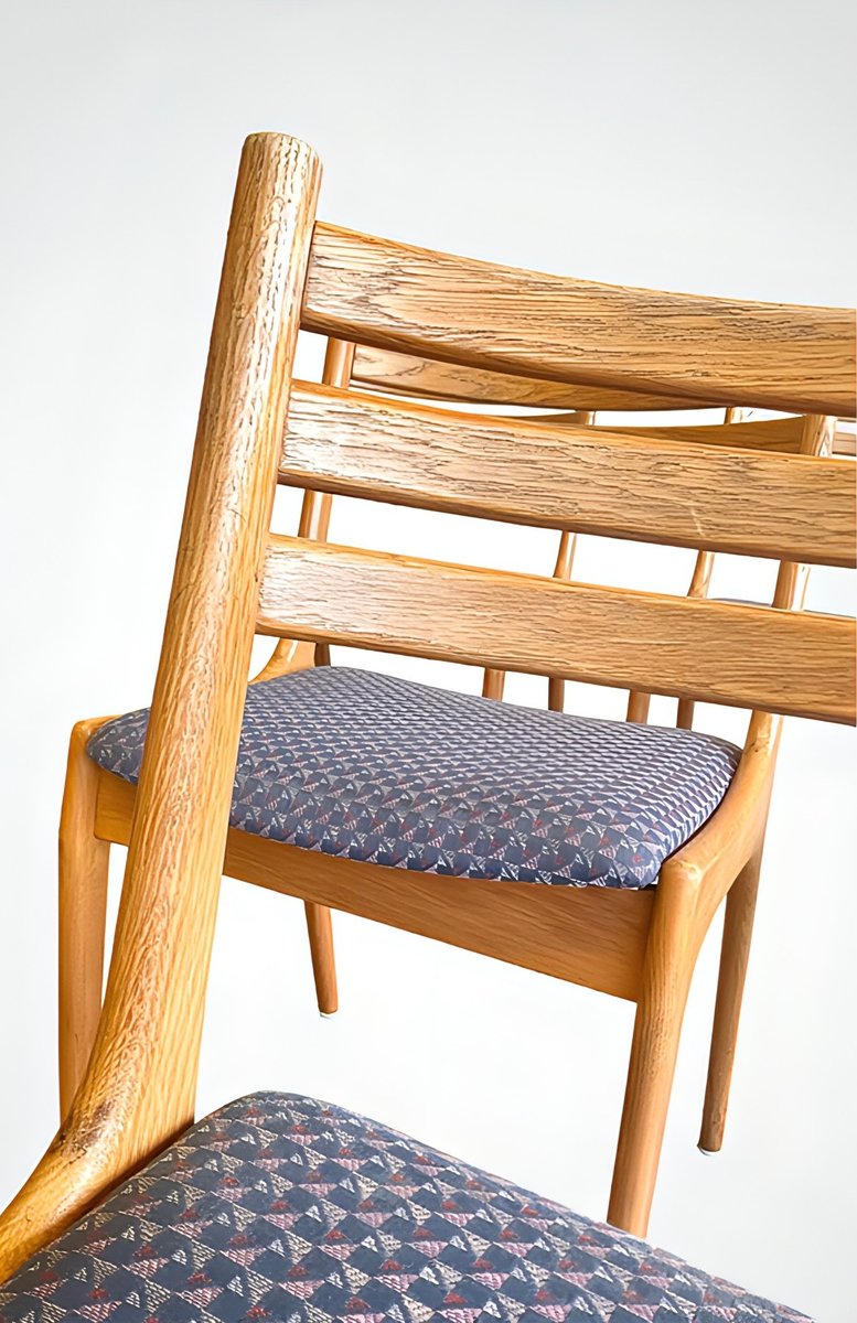 Beautifully designed, rare Danish mid-century modern vintage dining room chairs of the highest quality – with solid oak wood frames – are offered here.