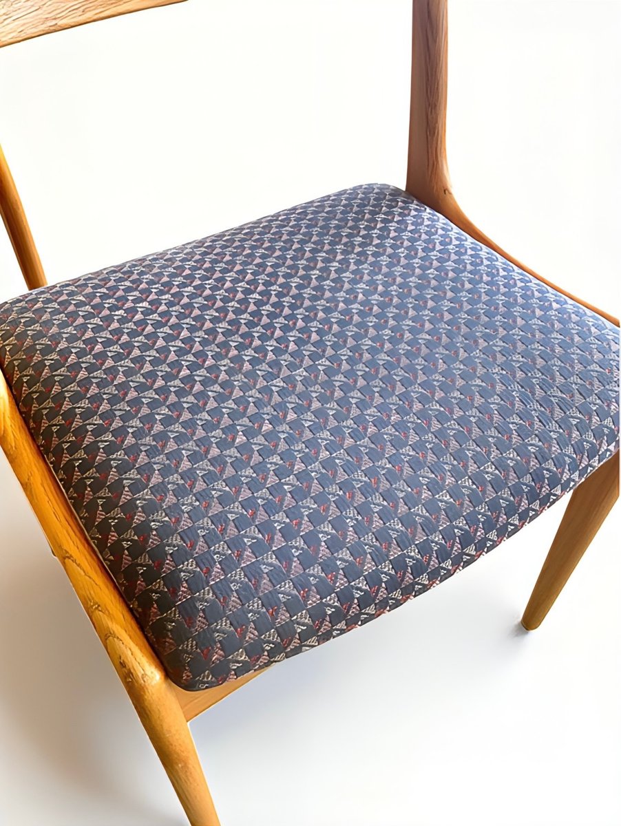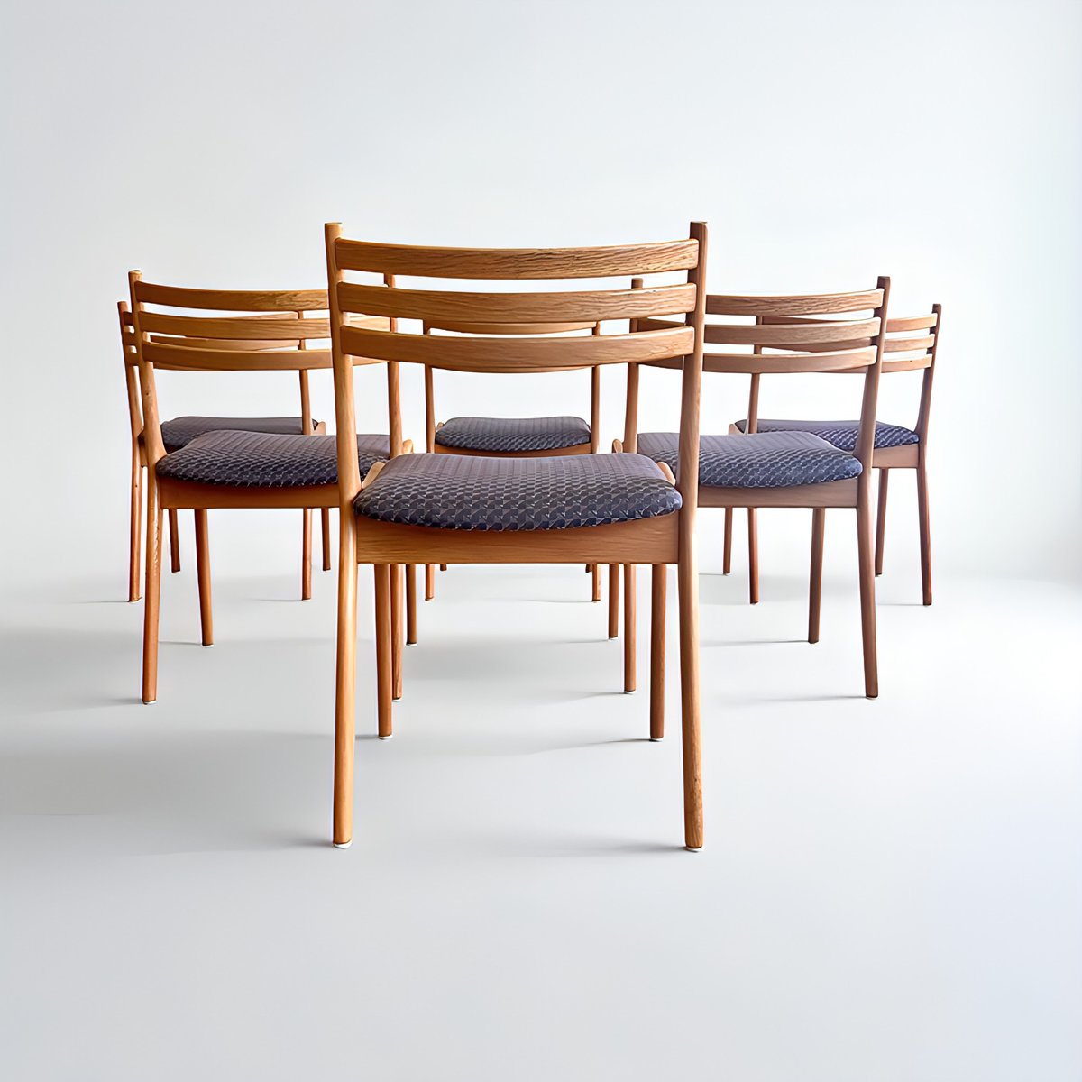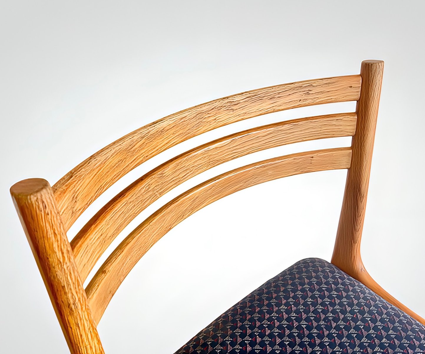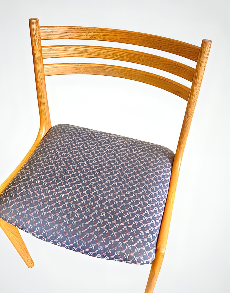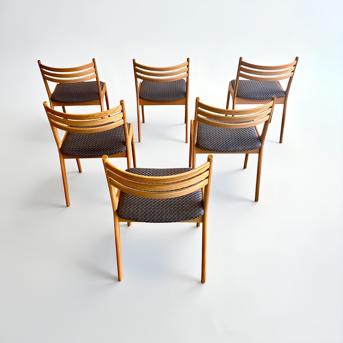 Beautifully designed, rare Danish mid-century modern vintage dining room chairs of the highest quality – with solid oak wood frames – are offered here.