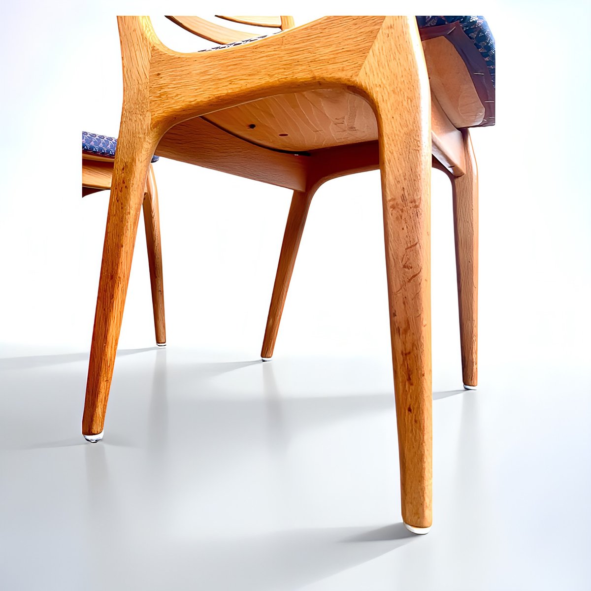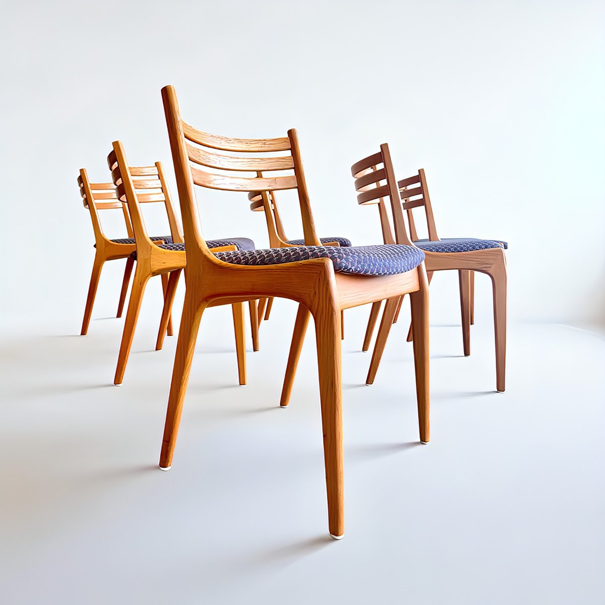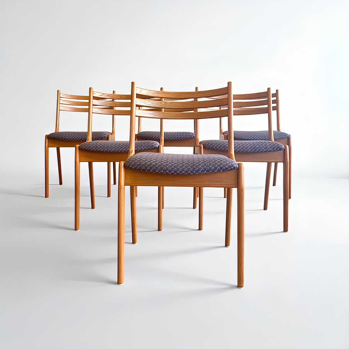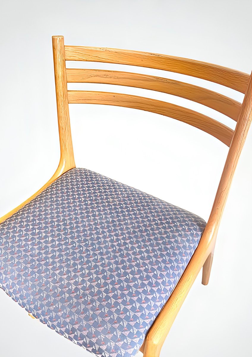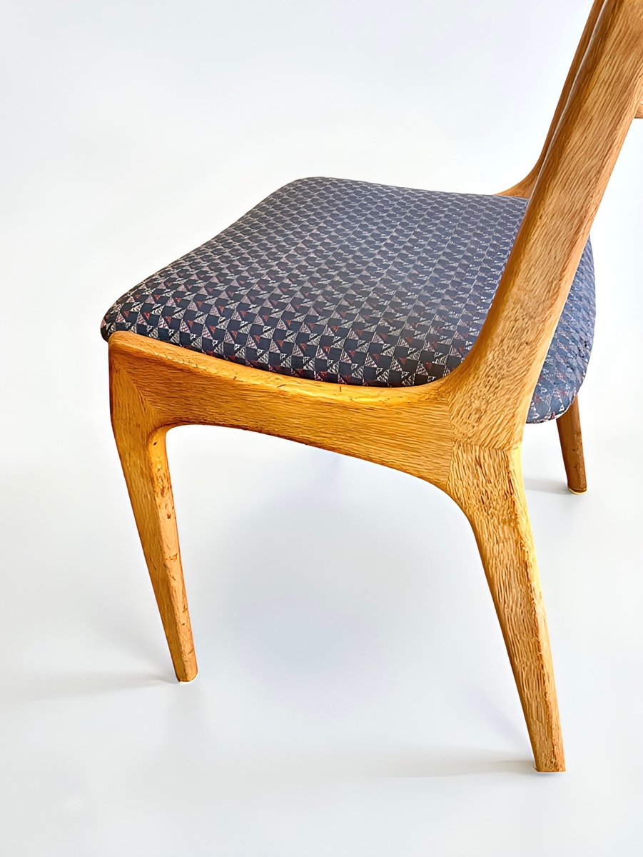 Beautifully designed, rare Danish mid-century modern vintage dining room chairs of the highest quality – with solid oak wood frames – are offered here.