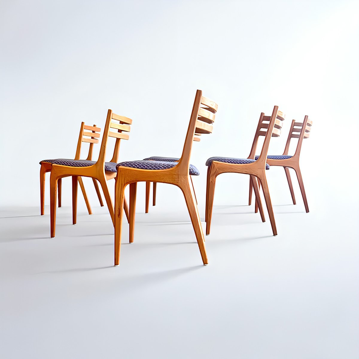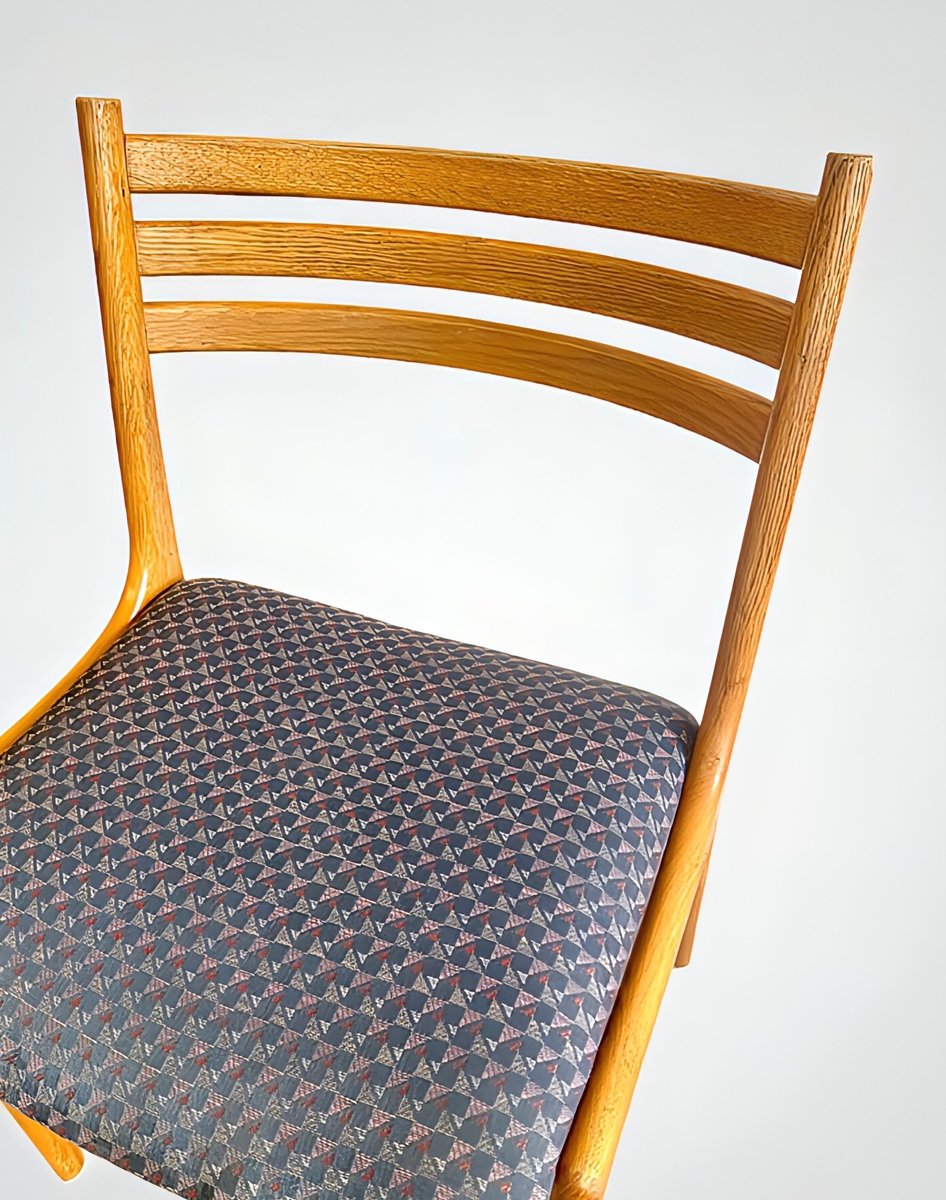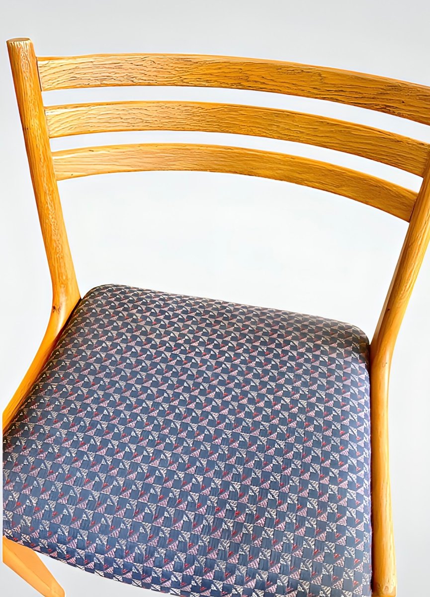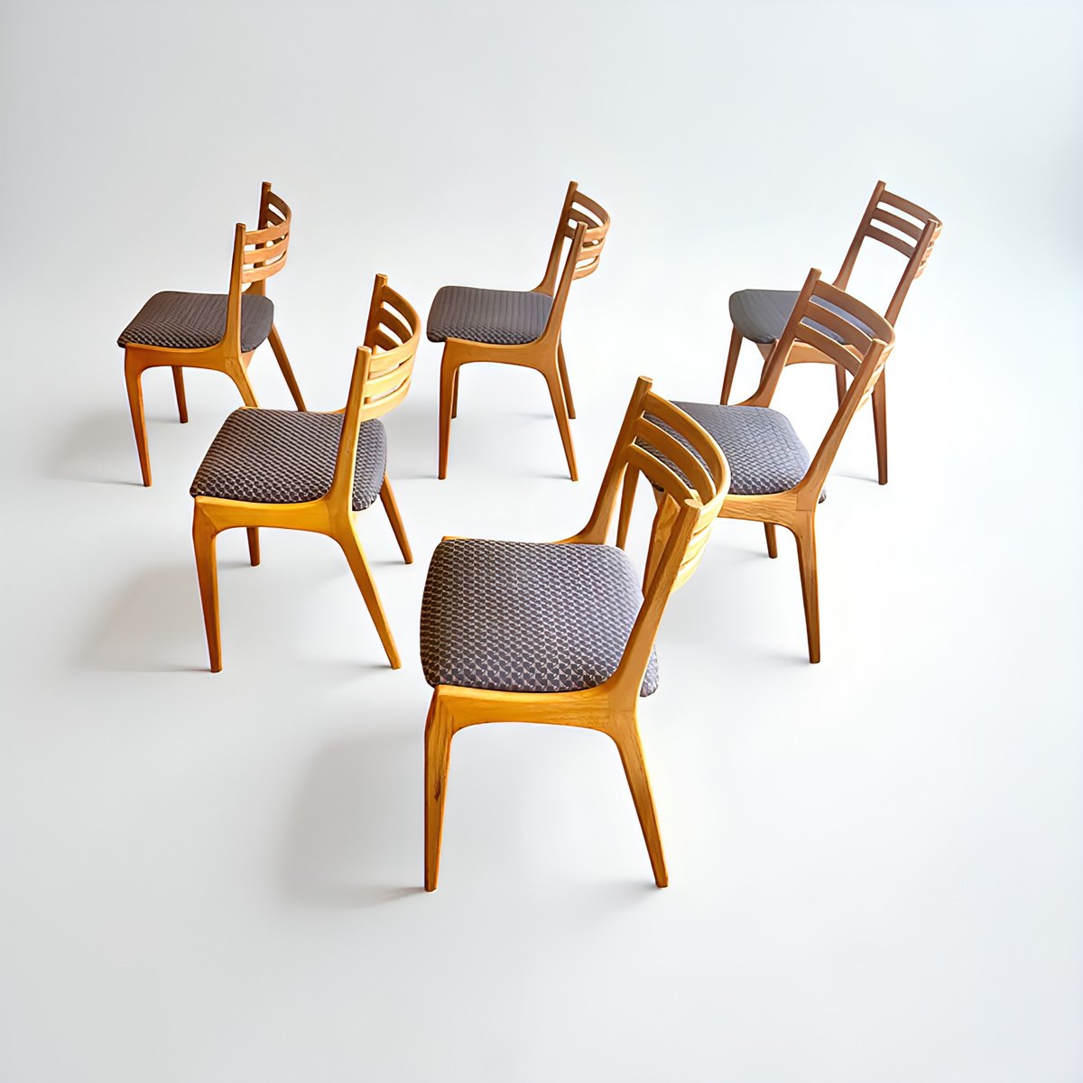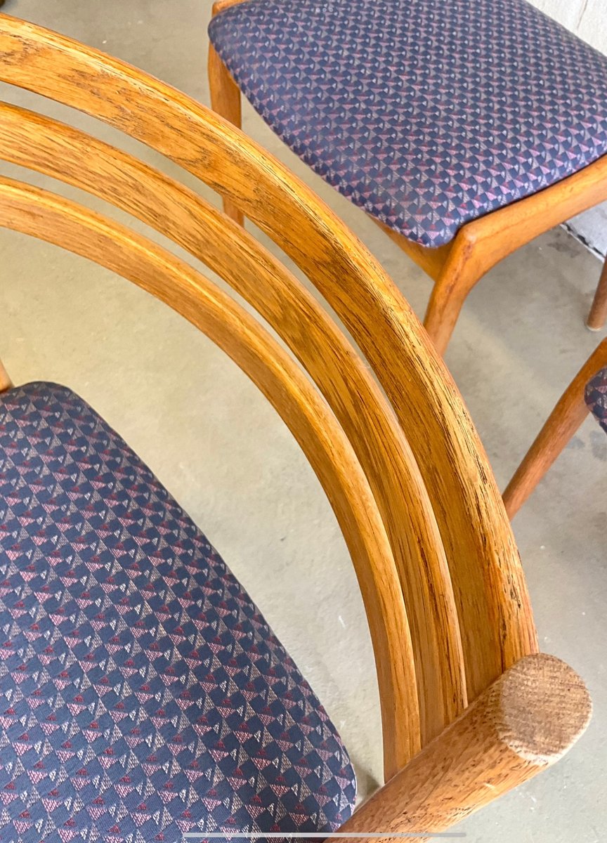 Beautifully designed, rare Danish mid-century modern vintage dining room chairs of the highest quality – with solid oak wood frames – are offered here.