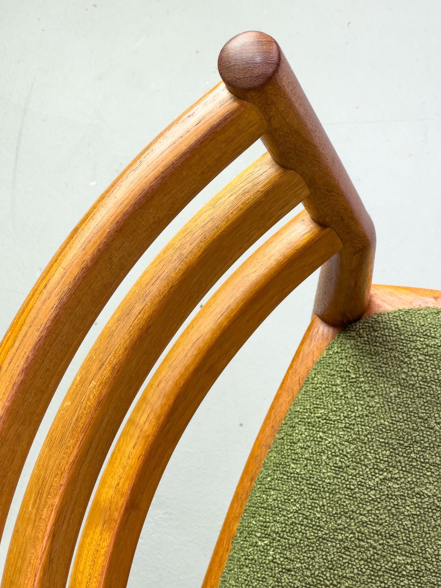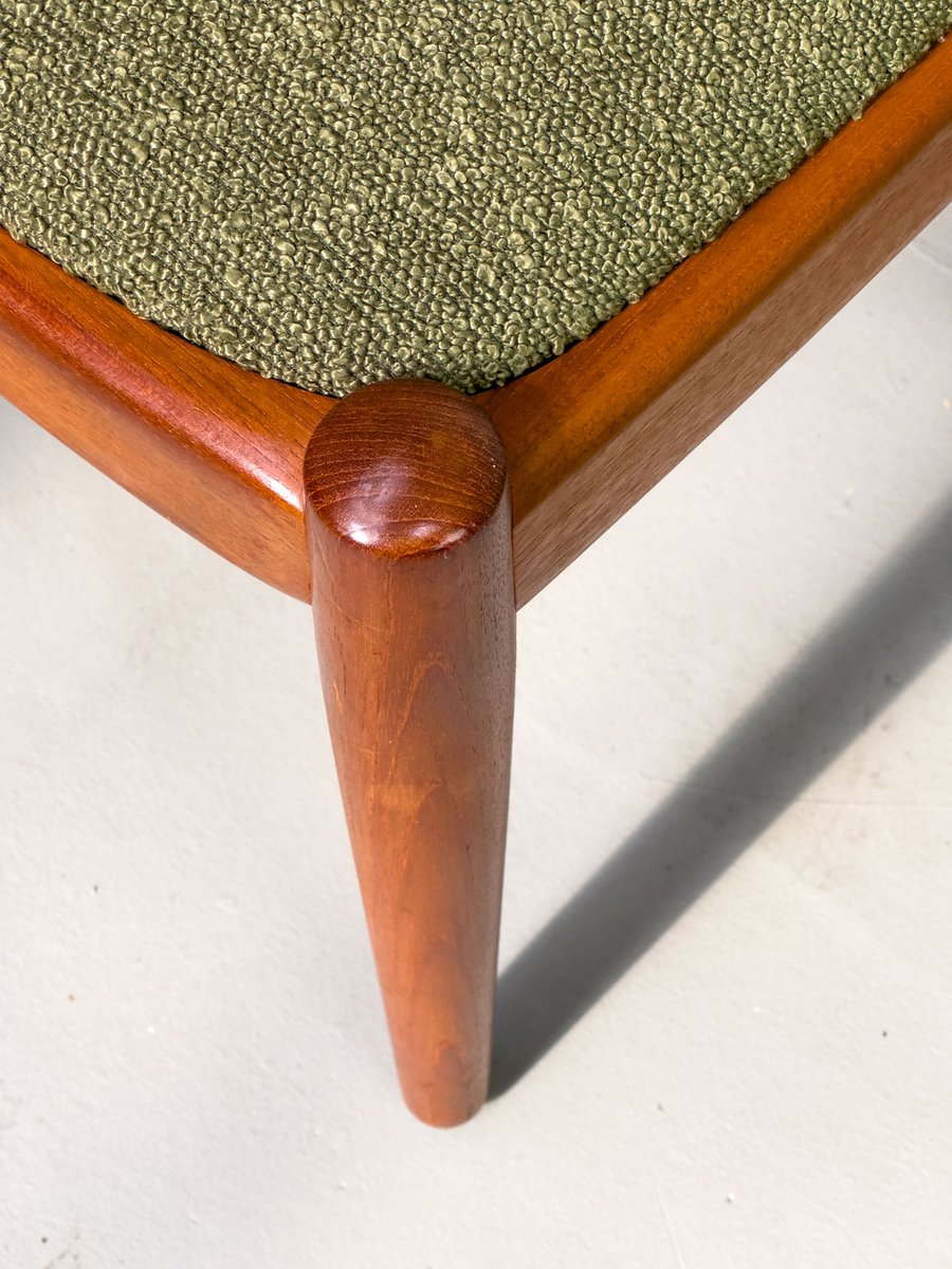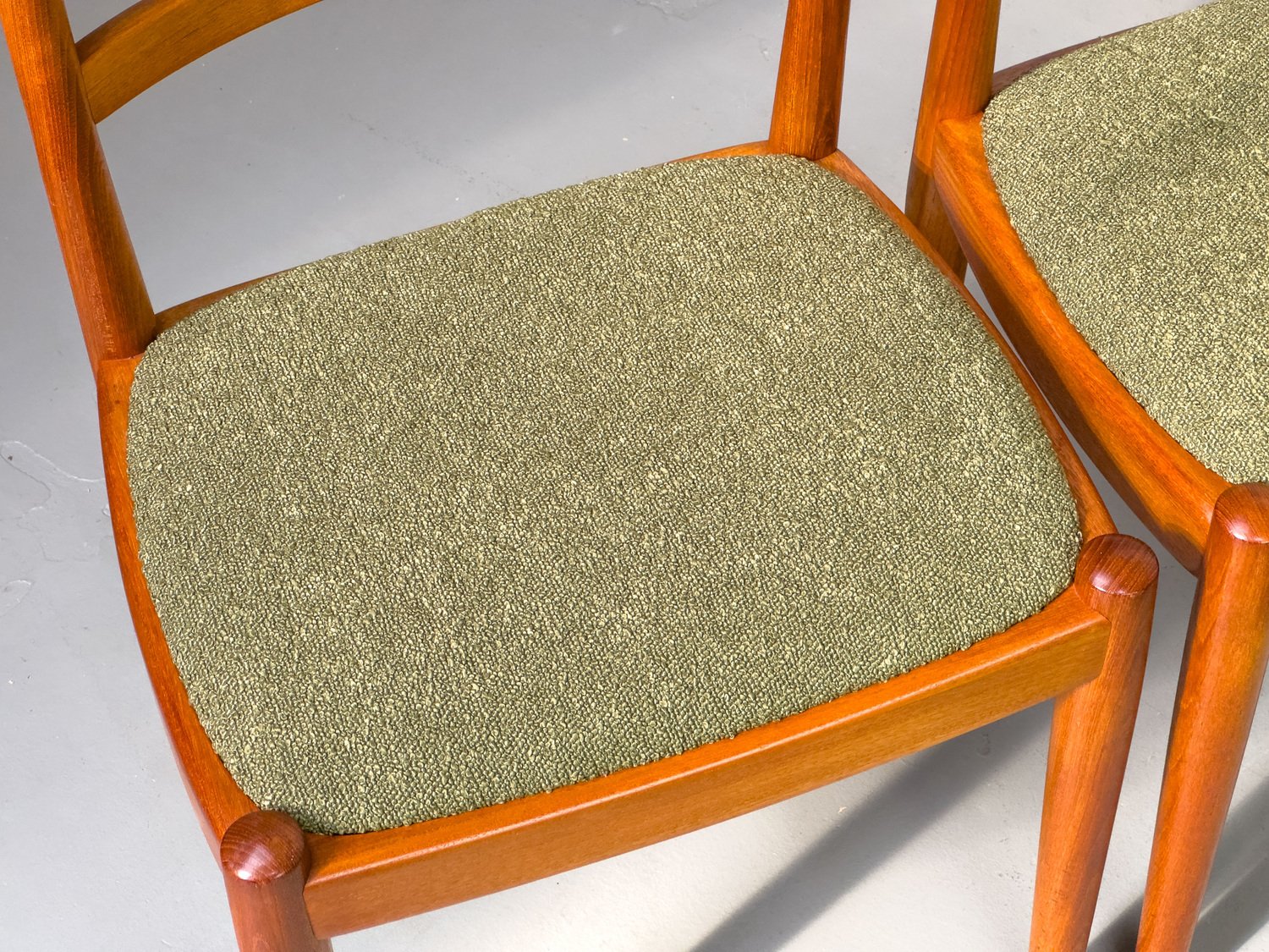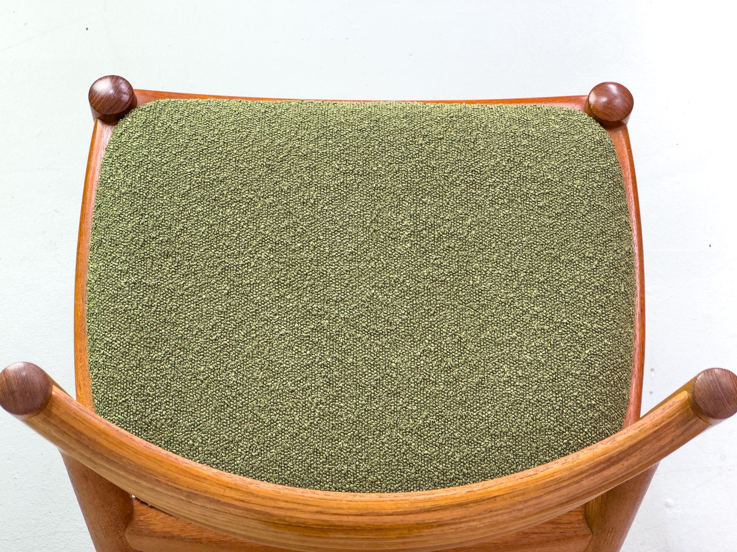 with their simple elegance, teak chairs from Denmark with exceptionally chic upholstery fabric in olive green bouclé are convincing.