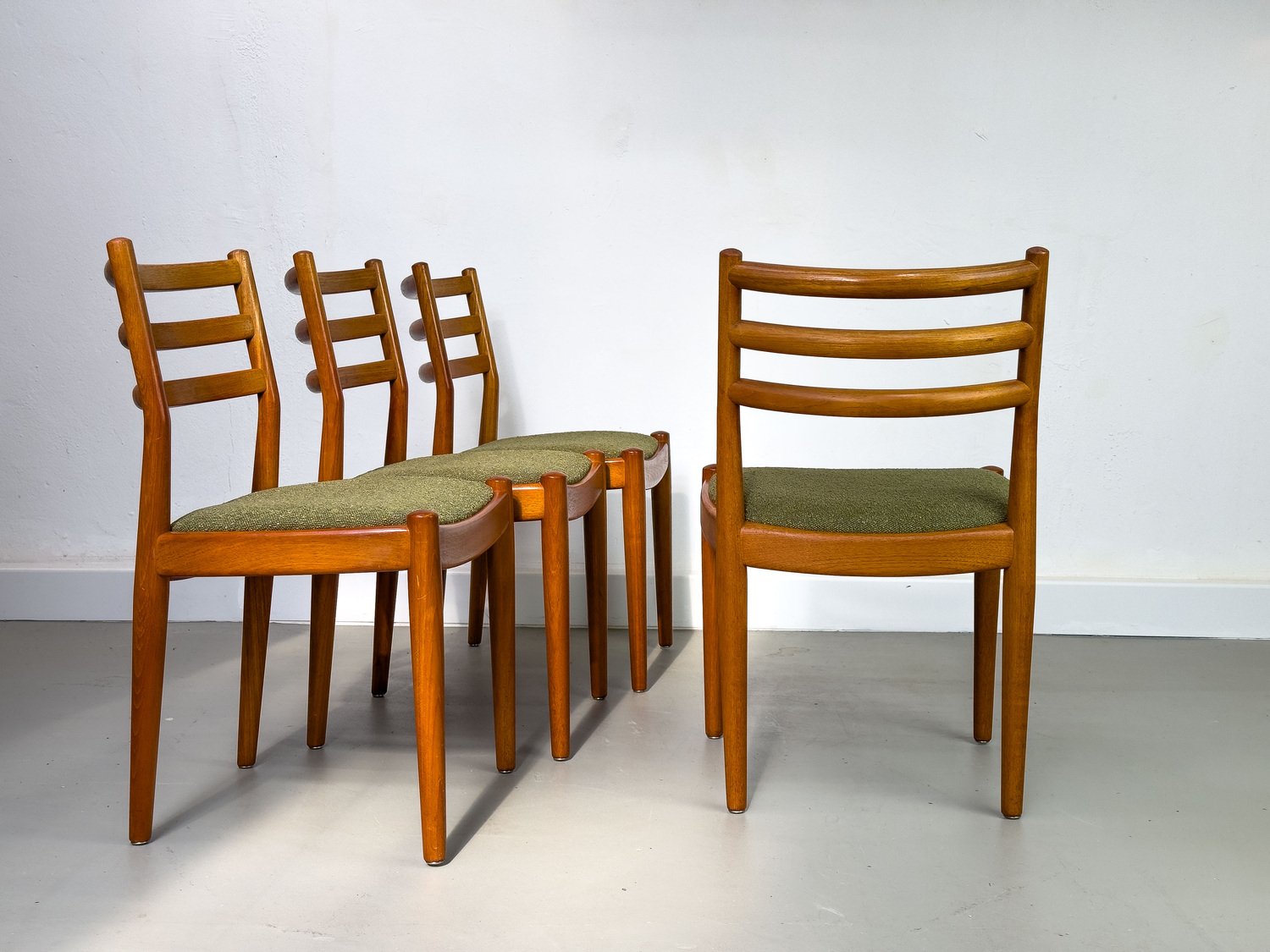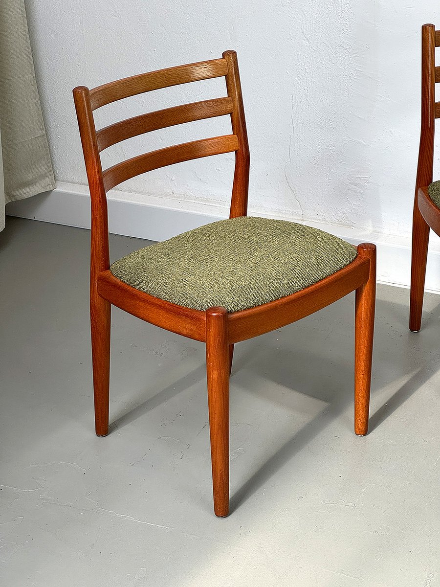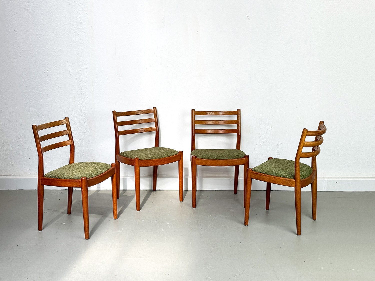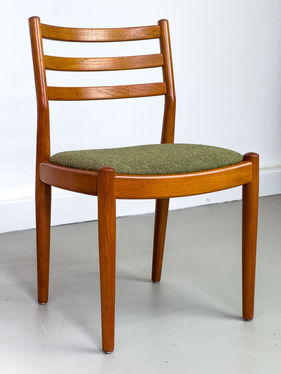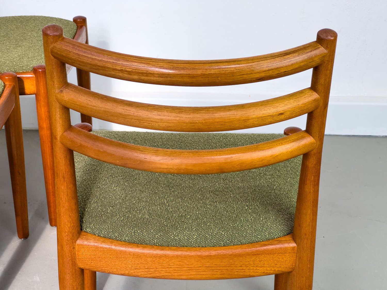 with their simple elegance, teak chairs from Denmark with exceptionally chic upholstery fabric in olive green bouclé are convincing.