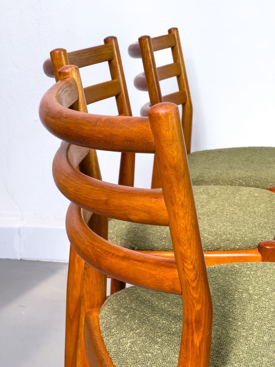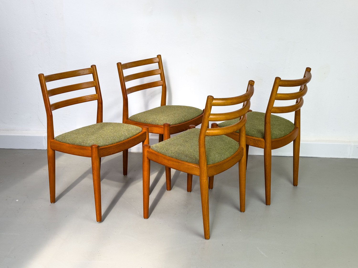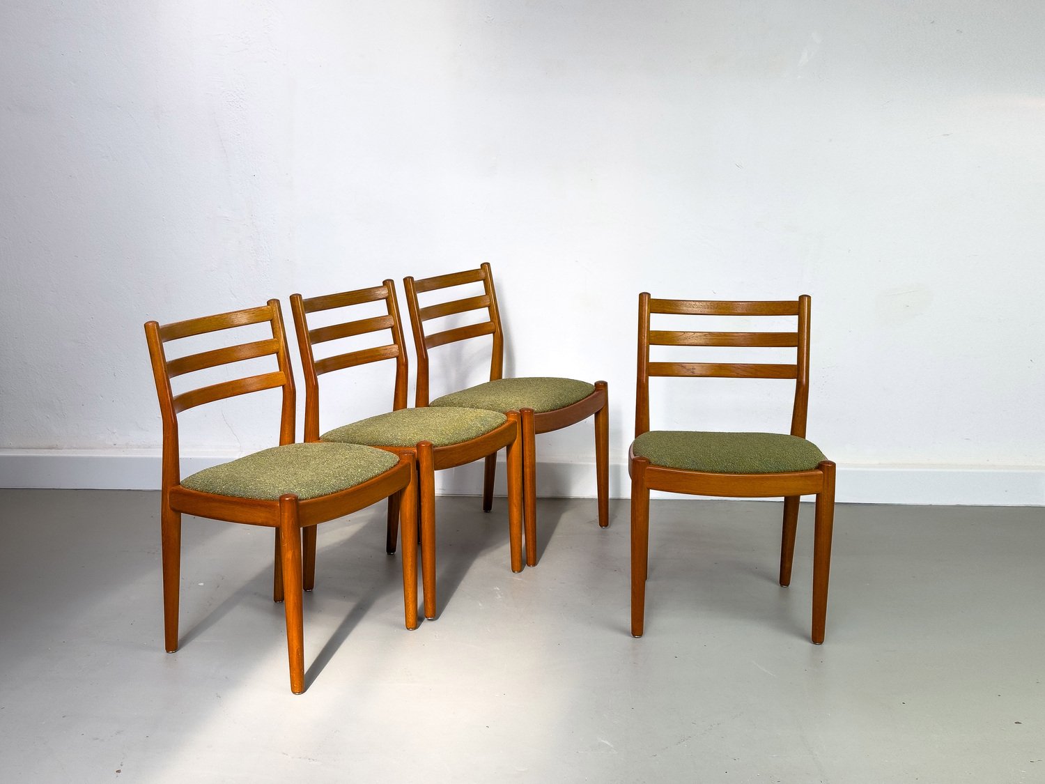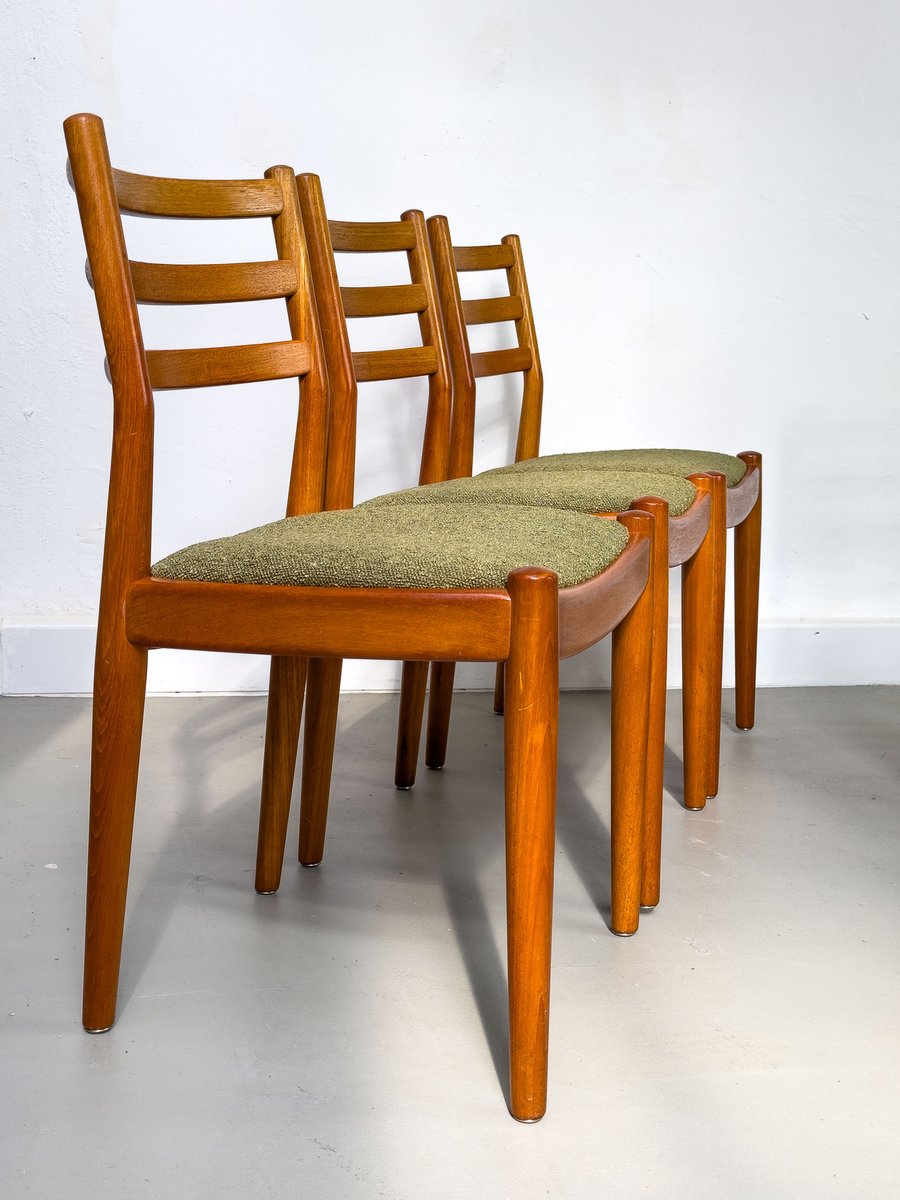 with their simple elegance, teak chairs from Denmark with exceptionally chic upholstery fabric in olive green bouclé are convincing.