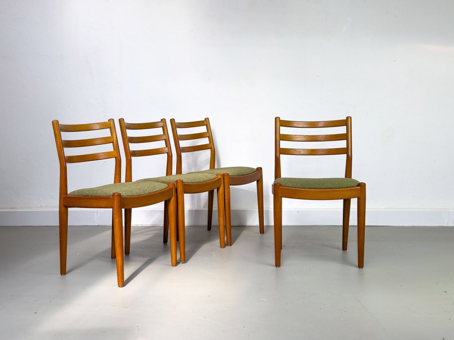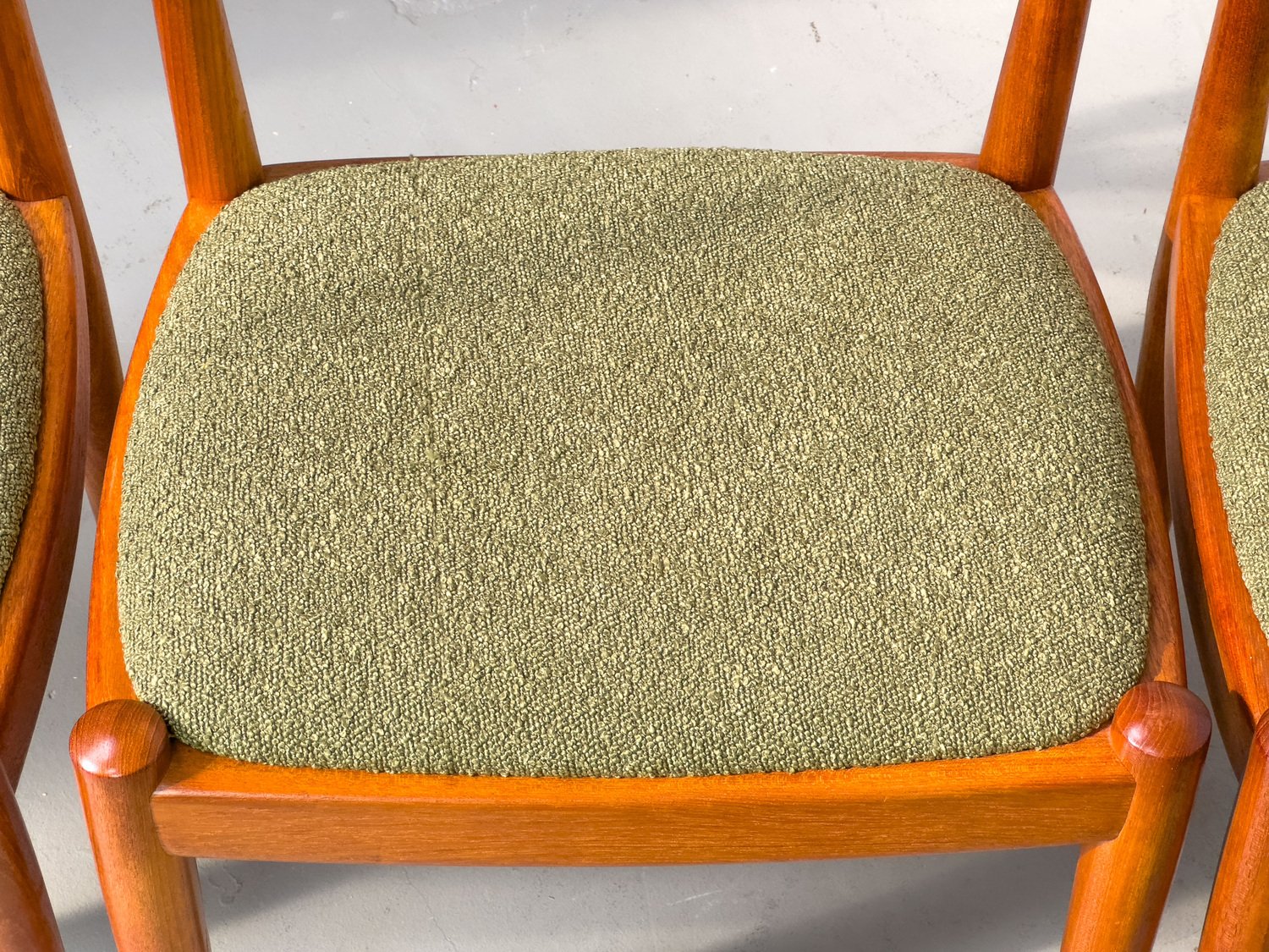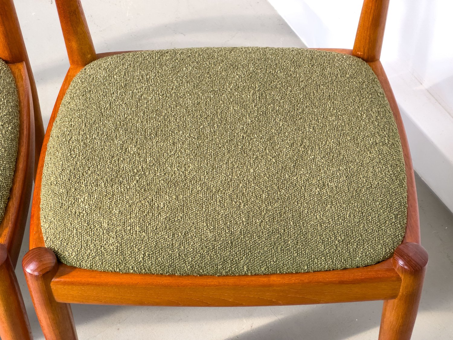 con su sencilla elegancia, convencen las sillas de teca procedentes de Dinamarca con un tapizado excepcionalmente chic en tela bouclé verde oliva.