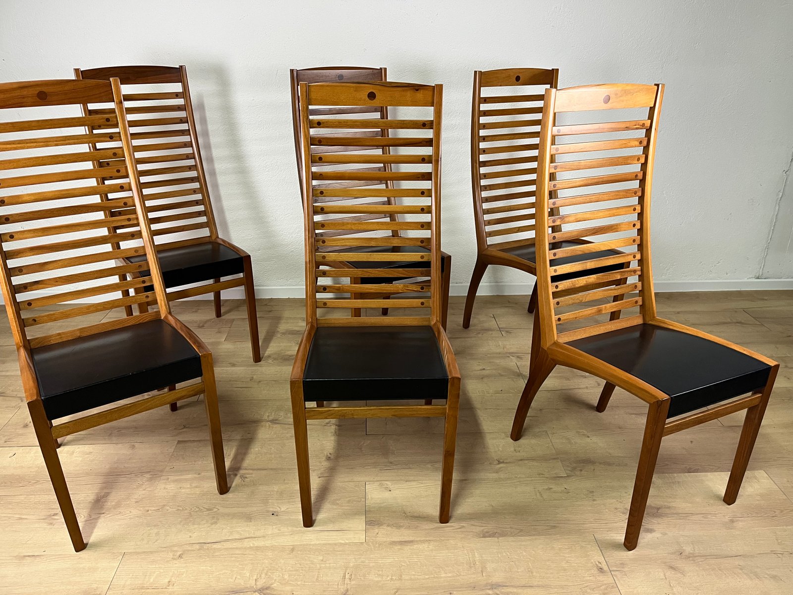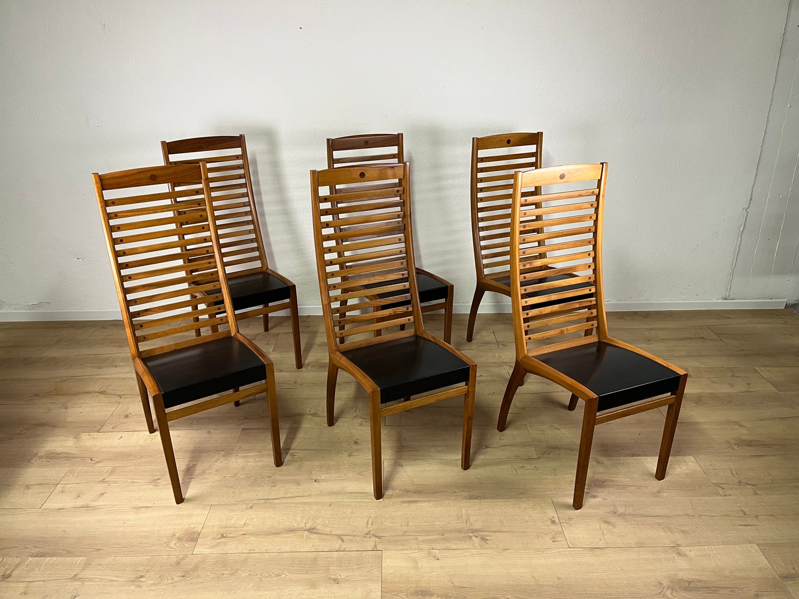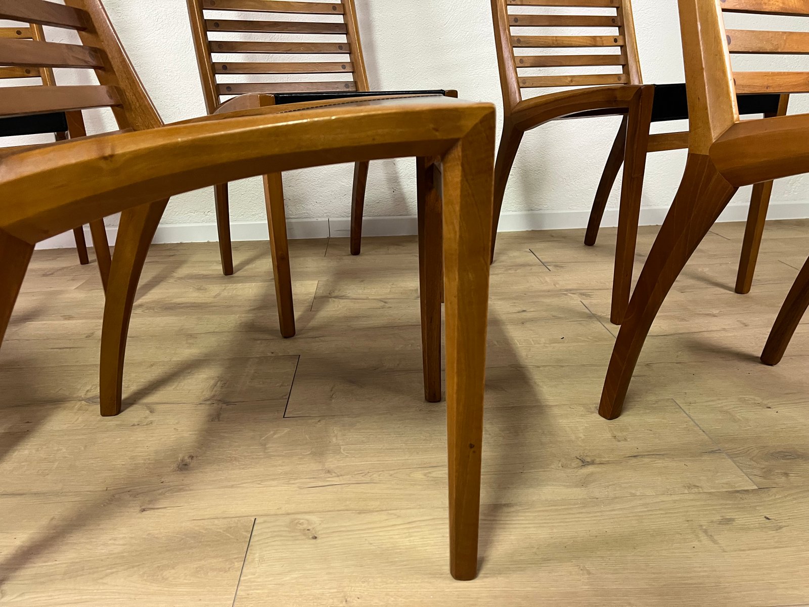Sillas esculturales vintage de madera y cuero de Mobilgirgi, años 70. Juego de 6