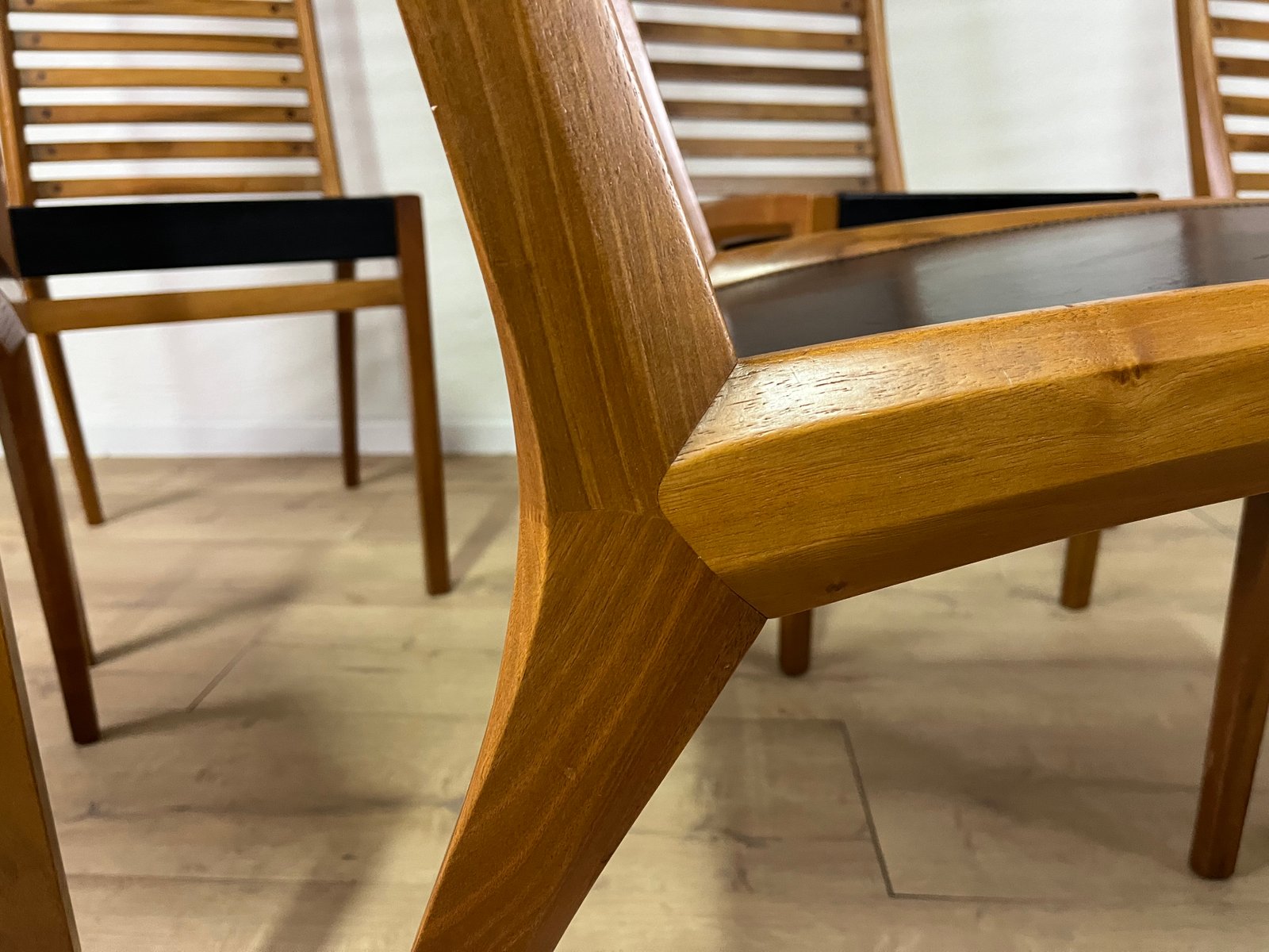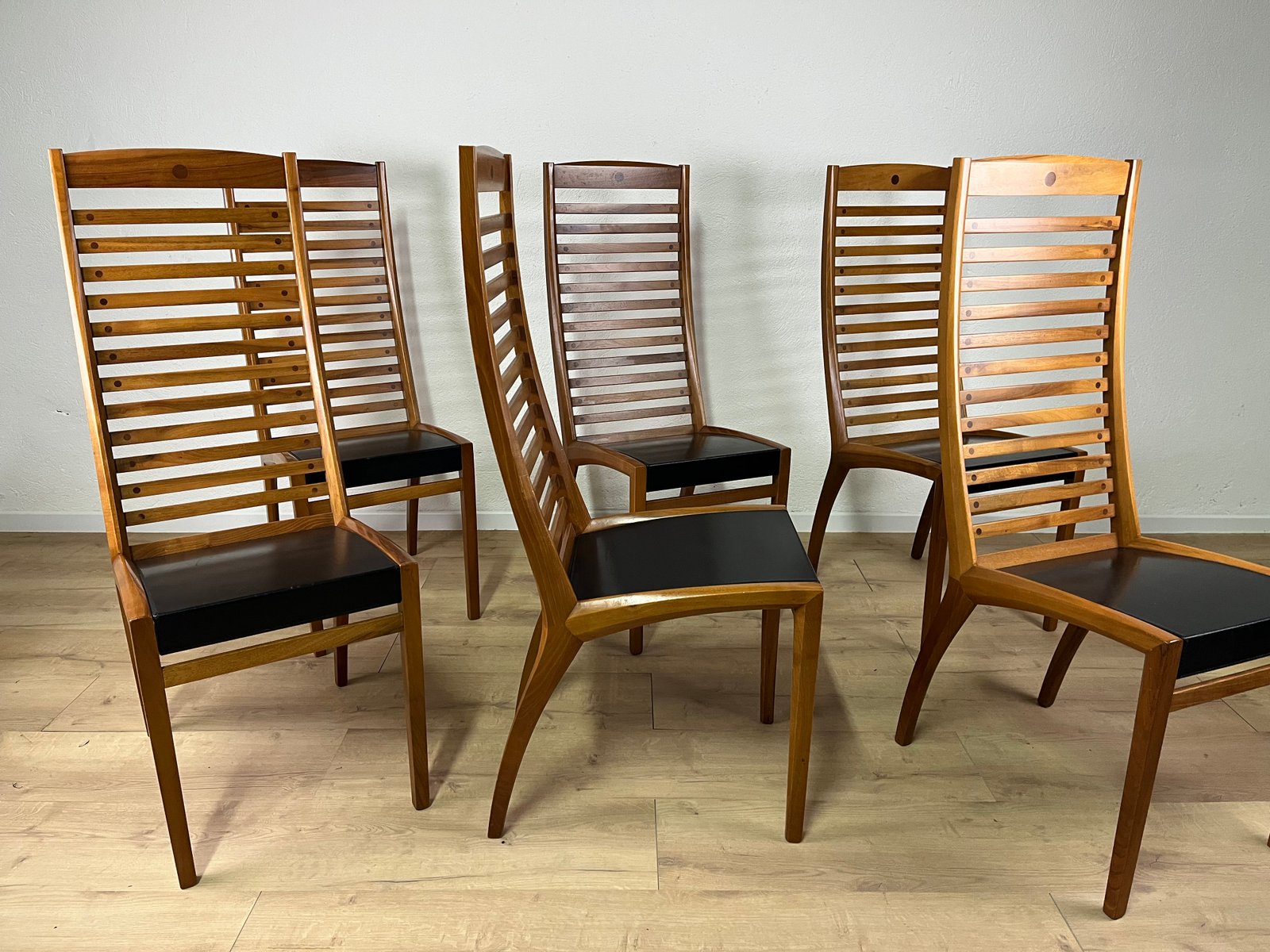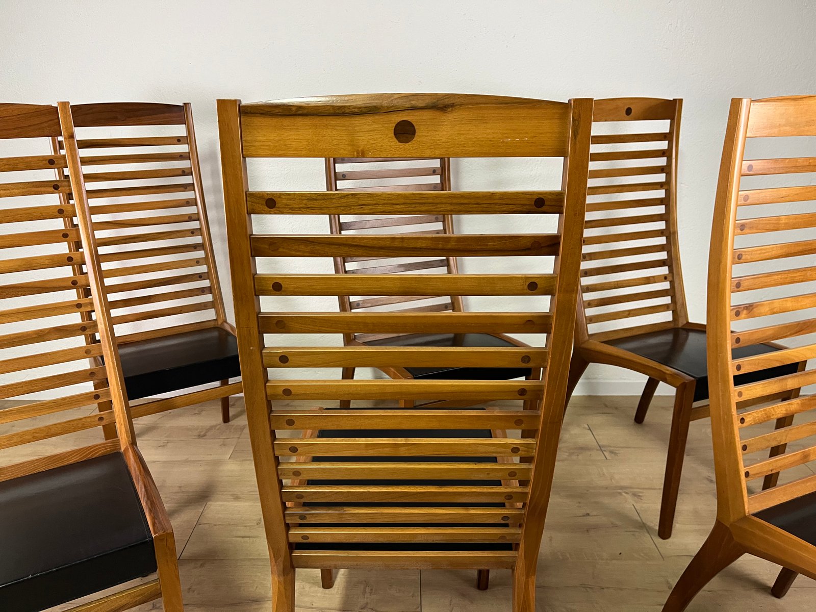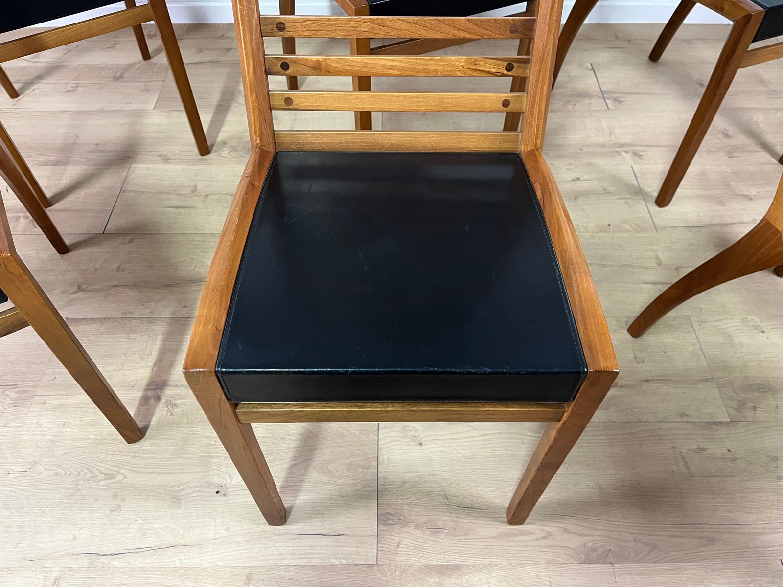 Sillas esculturales vintage de madera y cuero de Mobilgirgi, años 70. Juego de 6