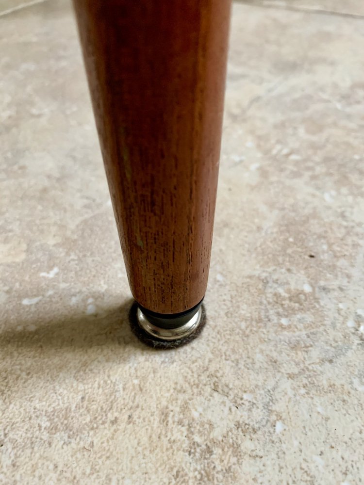 Las sillas son de teca con skaï/cuero sintético/vinilo negro y están en excelente estado original.
